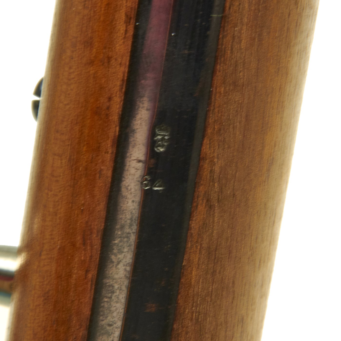 The tang of the butt plate is regimentally marked with K. F. R. / E. 2. 233., for the Kaiser Franz Garde-Grenadier-Regiment Nr. 2, also known as the 2nd (Emperor Francis) Guards Grenadiers Regiment. The markings also indicates that it was issued to the Ersatz (Replacement) Battalion, Company 2, Weapon 223. This is an "honorific" type regimental marking, as the standard would have been "G. G. R. 2.". These units did not see service as often, which most likely explains the excellent condition of the rifle. The regiment was first raised in 14 October 1814 and was garrisoned in Berlin, as many of the guard regiments were.