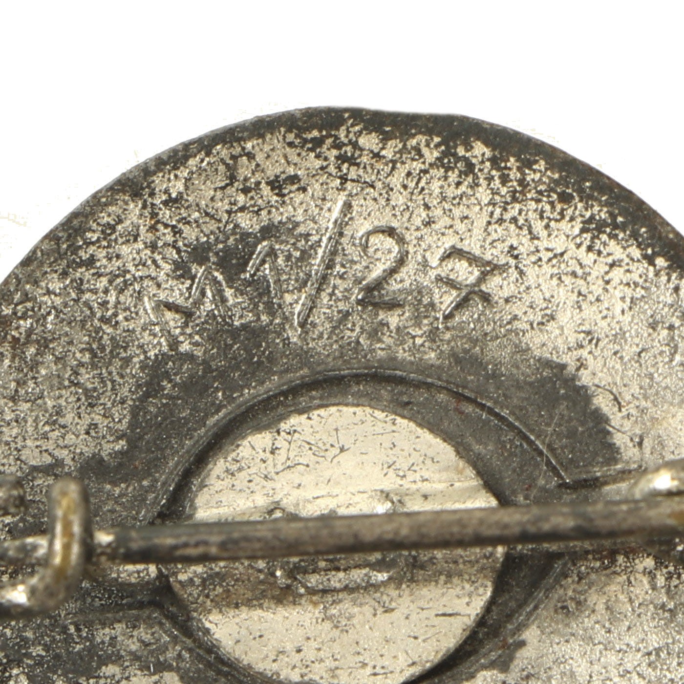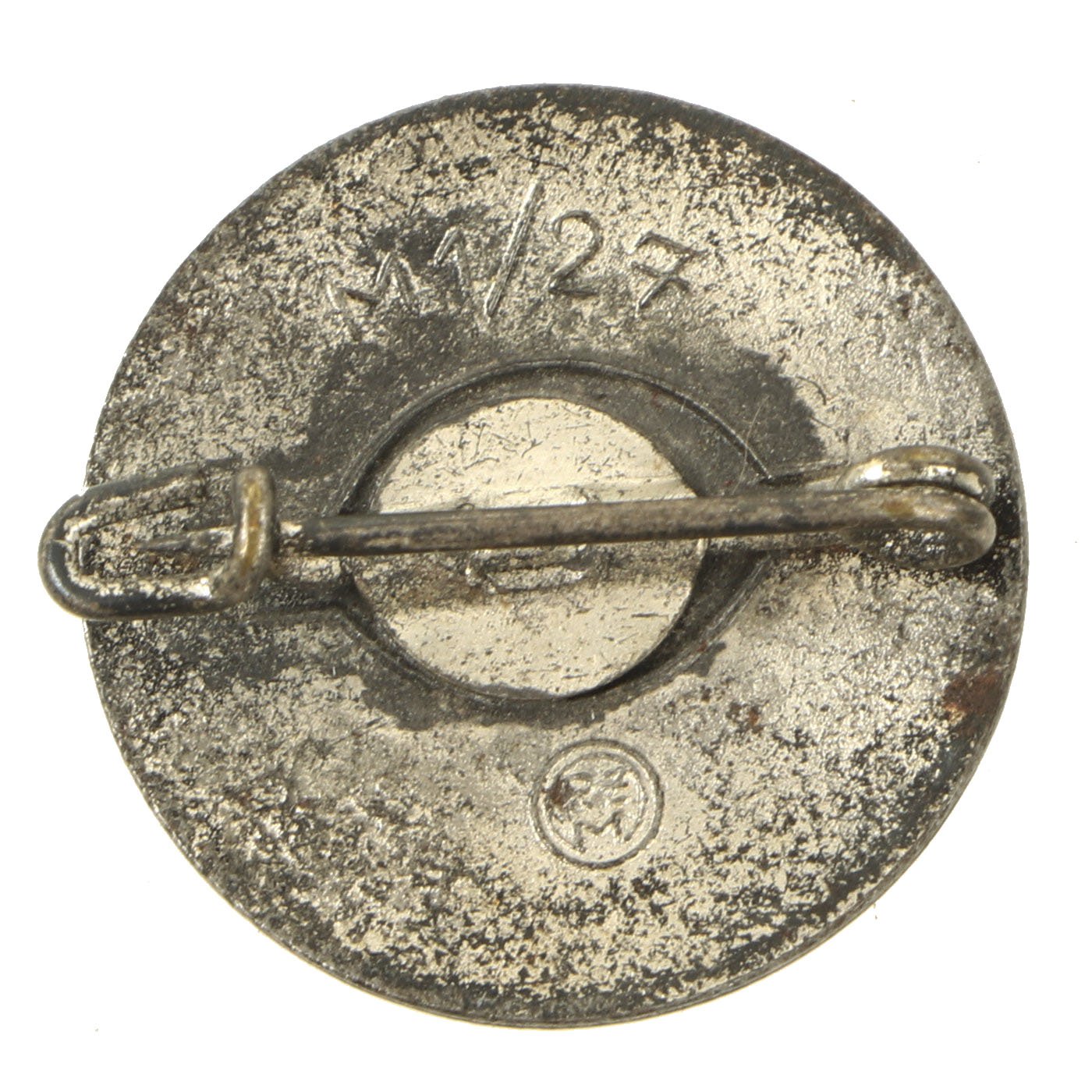 Of Note: In late 1934 items manufactured for the NSDAP and other organizations, including membership pins, came under the quality control of the RZM, Reichzeugmeisterei, (National Equipment Quartermaster) and as a result were marked with the RZM logo when appropriate. The registry was was based at the Brown house in Munich and NSDAP party headquarters in Berlin. The RZM ensured that the manufacturers of military items were consistent in design, quality of materials and other characteristics of the items. It also defined standards of design, manufacturing and quality and published an authoritative color chart for textiles. The M1 in the code stands for Metal Badges, with E.L. Müller, Pforzheim, being contractor number 27.