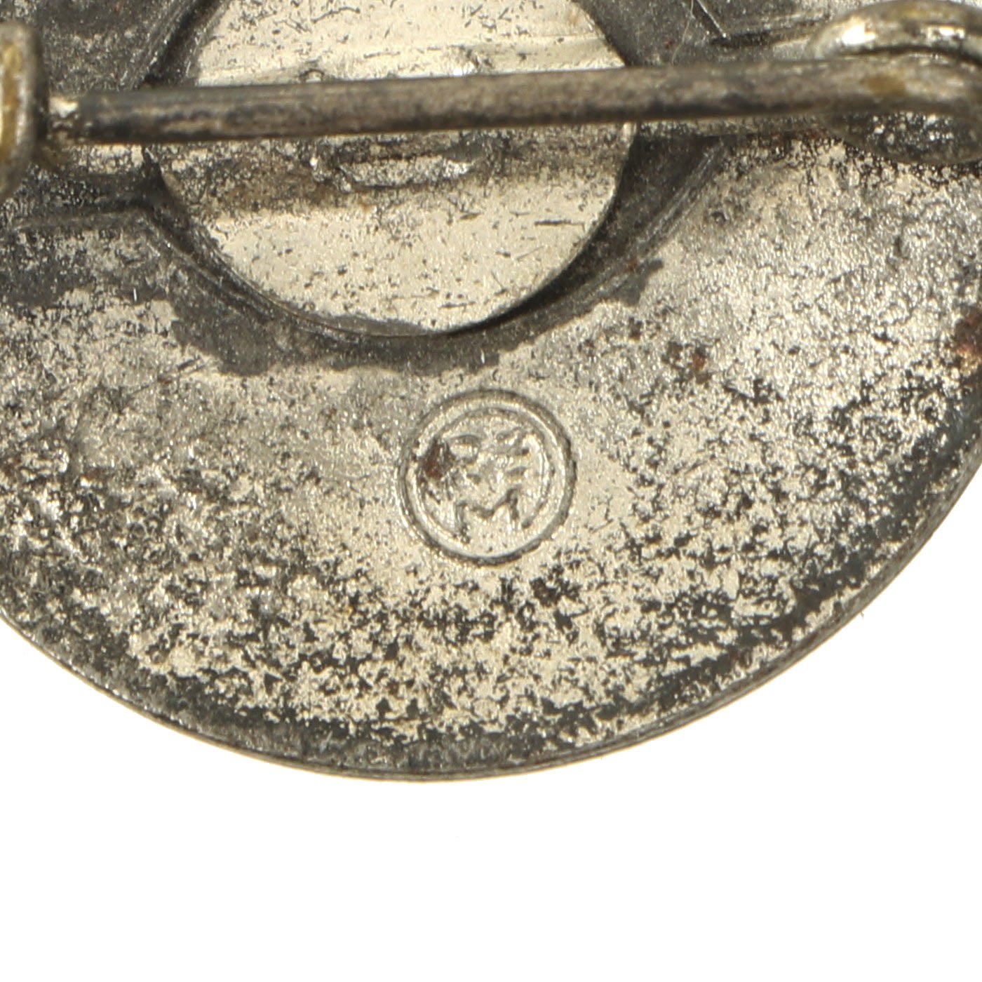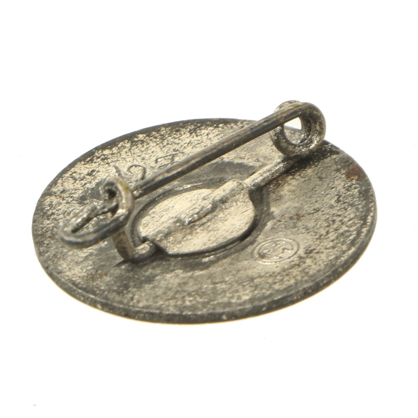 This example is a standard issue membership badge, awarded to all personnel on acceptance as an official party member. It is a 24mm diameter, die struck zinc alloy badge NSDAP membership badge with multi-colored enamel work. The badge features a translucent red, circular outer border with embossed silvered script, NATIONAL-SOZIALSTISCHE-D.A.P., encompassing a white enamel field with canted black enamel Swas. In very good condition, with lots of intact plating on the back, while the front shows a bit more wear, and some tarnish on the silver plate. Overall very good condition with great enamel, and the back has a very nice "safety pin" style attachment, which would work on any type of clothing.