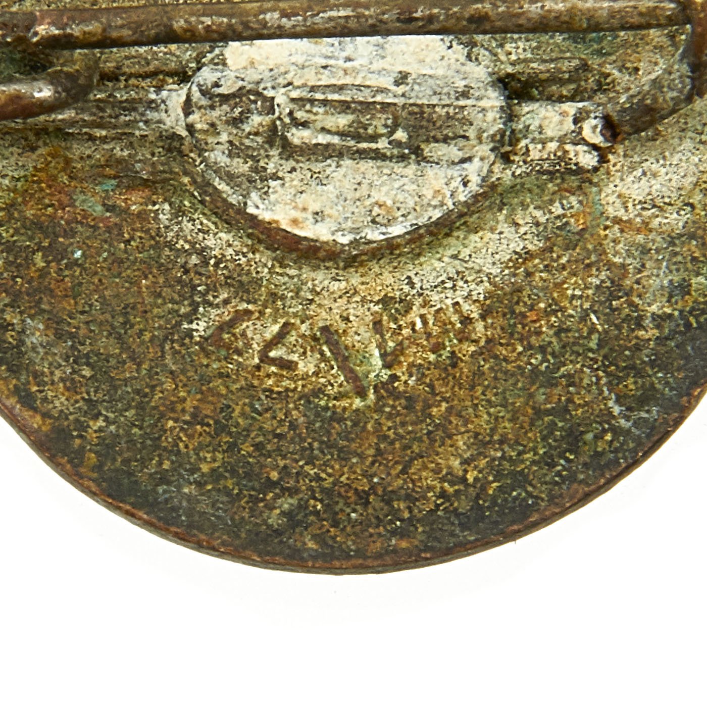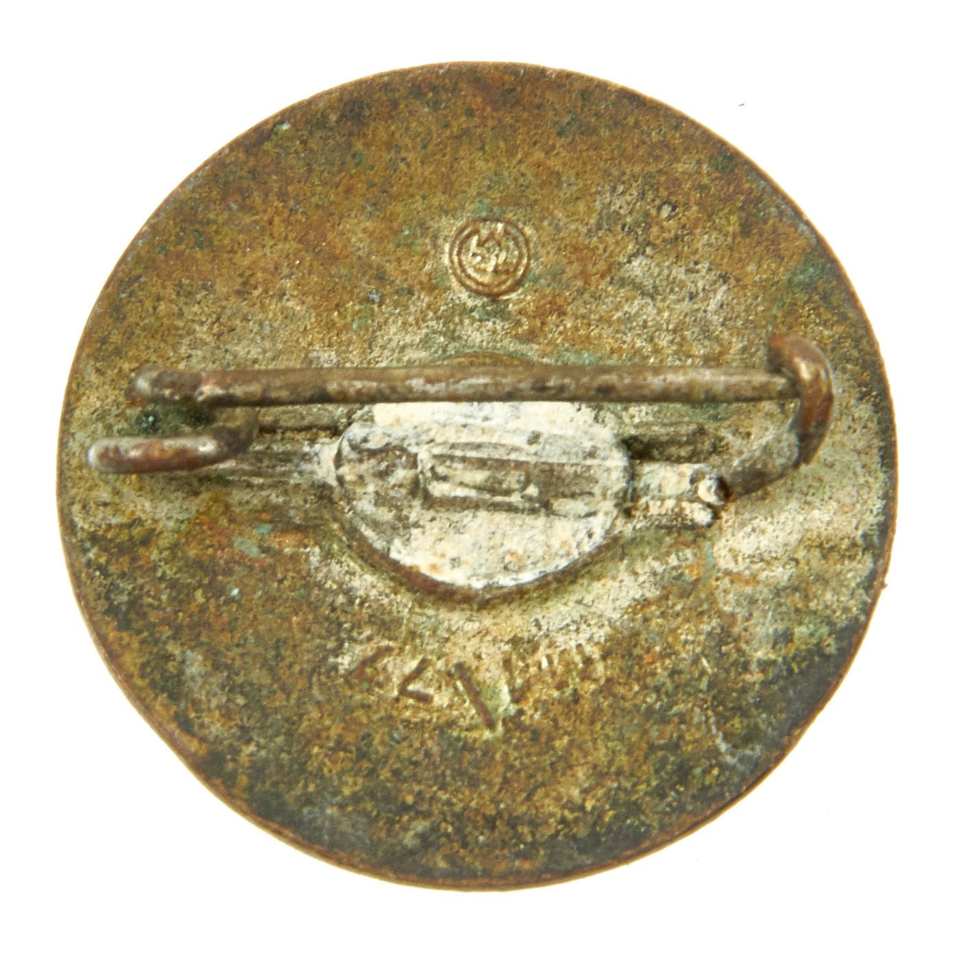 This example is a standard issue membership badge, awarded to all personnel on acceptance as an official party member. It is a 24mm diameter, die struck brass alloy badge NSDAP membership badge with multi-colored enamel work. The badge features a translucent red, circular outer border with embossed silvered script, NATIONAL-SOZIALSTISCHE-D.A.P., encompassing a white enamel field with canted black enamel Swas (swas). In very good condition, with some intact plating on the back, while the front is worn away to the base metal. Overall good condition with good enamel, though there is a dent around the rim, which has damaged the enamel. The back has a very nice functional "safety pin" style attachment, which would work on any type of clothing.