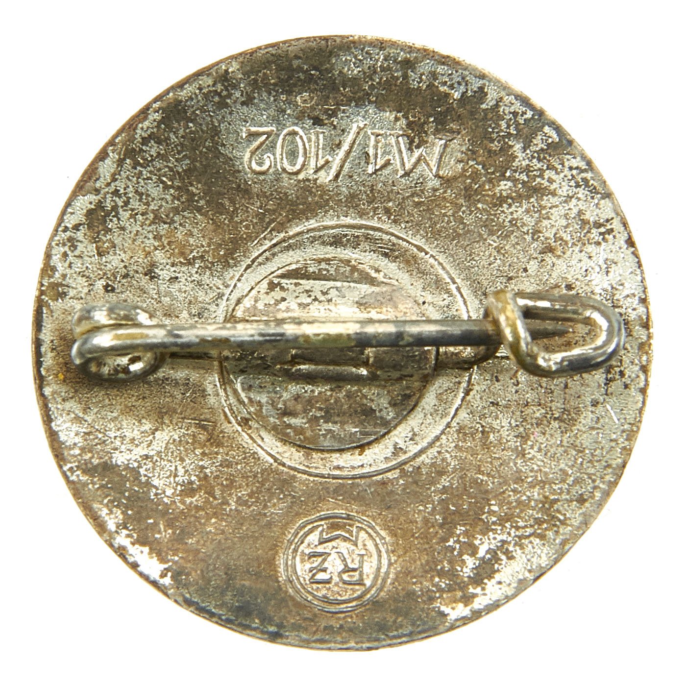 Of Note: In late 1934 items manufactured for the NSDAP and other organizaions, including membership pins, came under the quality control of the RZM, Reichzeugmeisterei, (National Equipment Quartermaster) and as a result were marked with the RZM logo when appropriate. The registry was was based at the Brown house in Munich and NSDAP party headquarters in Berlin. The RZM ensured that the manufacturers of military items were consistent in design, quality of materials and other characteristics of the items. It also defined standards of design, manufacturing and quality and published an authoritative color chart for textiles. The M1 in the code stands for Metal Badges, with Frank & Reif of Stuttgart being contractor number 102.