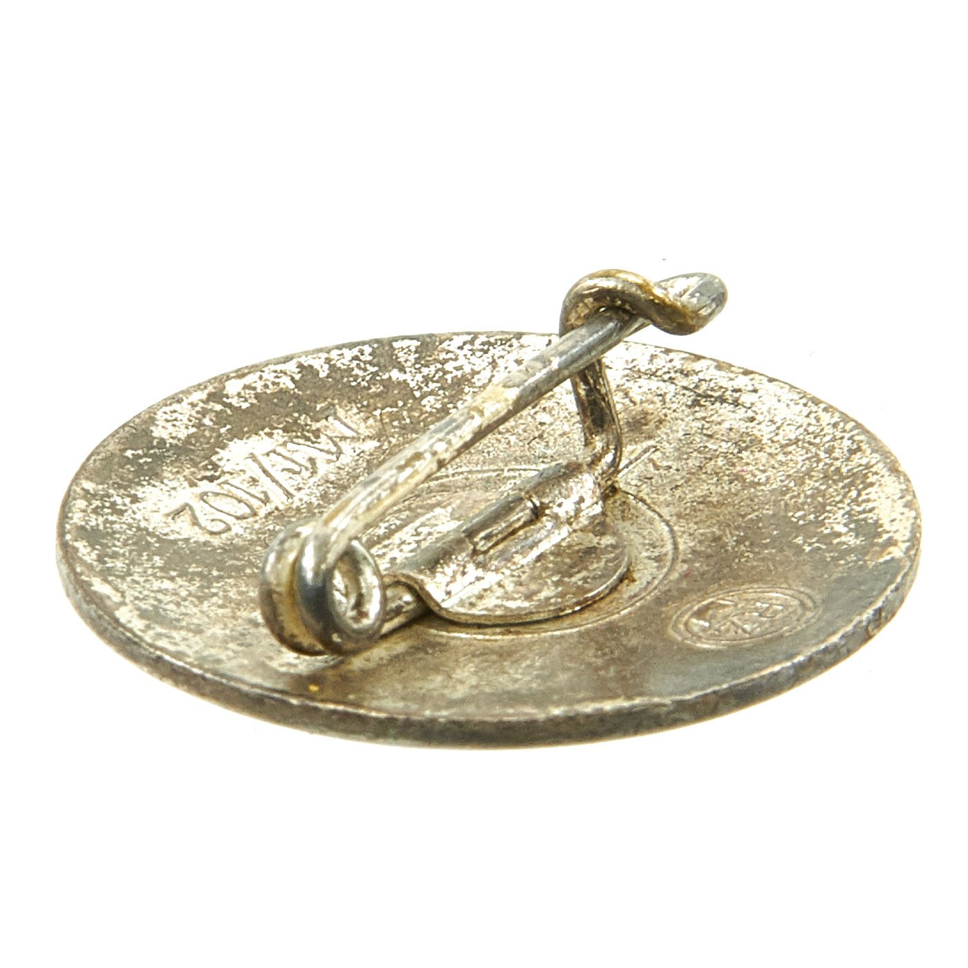 This example is a standard issue membership badge, awarded to all personnel on acceptance as an official party member. It is a 24mm diameter, die struck nickel alloy badge NSDAP membership badge with multi-colored enamel work. The badge features a translucent red, circular outer border with embossed silvered script, NATIONAL-SOZIALSTISCHE-D.A.P., encompassing a white enamel field with canted black enamel Swas (swas). In very good condition, with some intact plating on the back, while the front is worn away to the base metal. Overall good condition with great enamel, and the back has a very nice "safety pin" style attachment, which would work on any type of clothing.