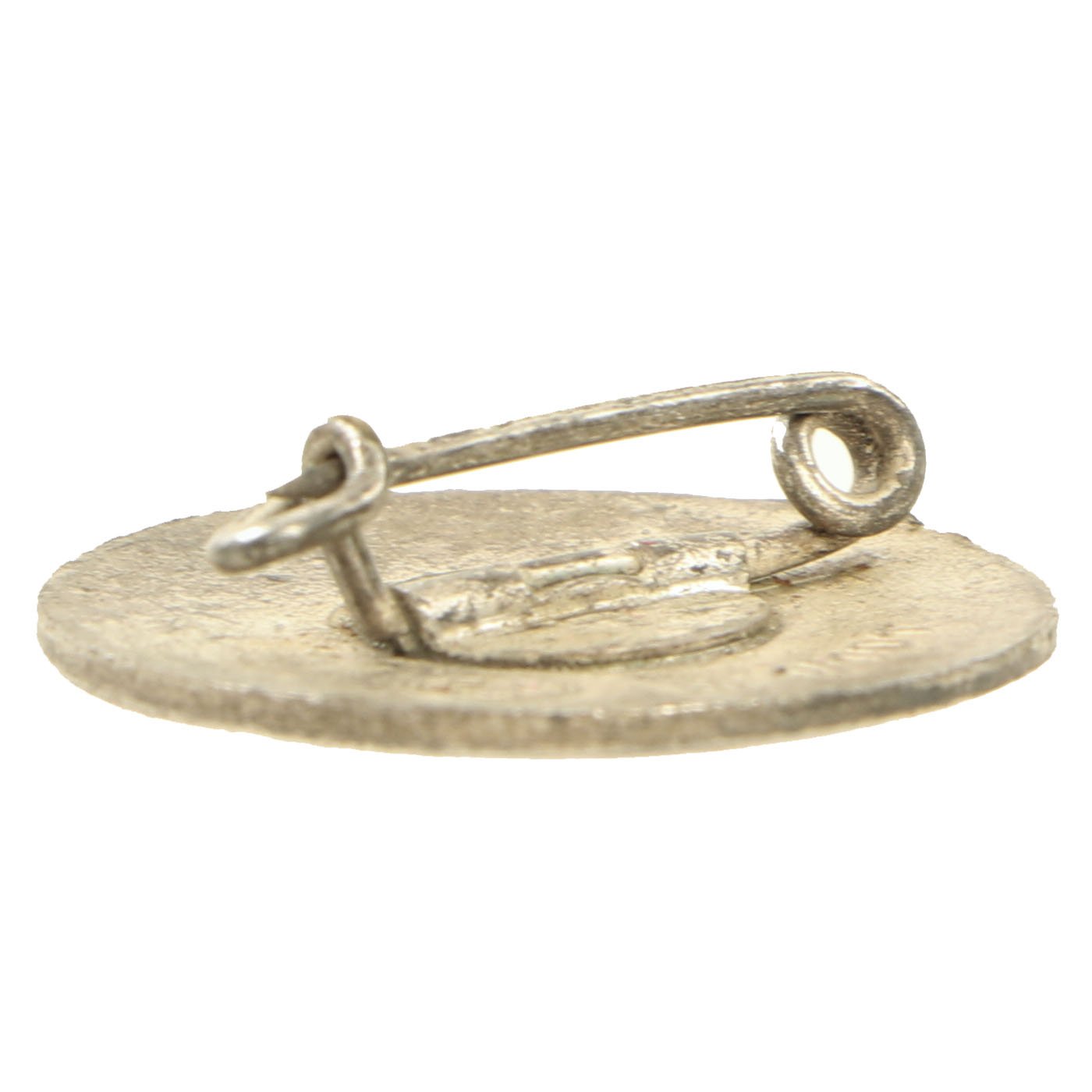This example is a standard issue membership badge, awarded to all personnel on acceptance as an official party member. It is a 24mm diameter, die struck zinc alloy badge NSDAP membership badge with multi-colored enamel work. The badge features a translucent red, circular outer border with embossed silvered script, NATIONAL-SOZIALSTISCHE-D.A.P., encompassing a white enamel field with canted black enamel Swas. In very good condition, with lots of intact plating on the back, while the front shows a bit more wear, and some tarnish on the silver plate. Overall very good condition with great enamel, and the back has a very nice "safety pin" style attachment, which would work on any type of clothing.
