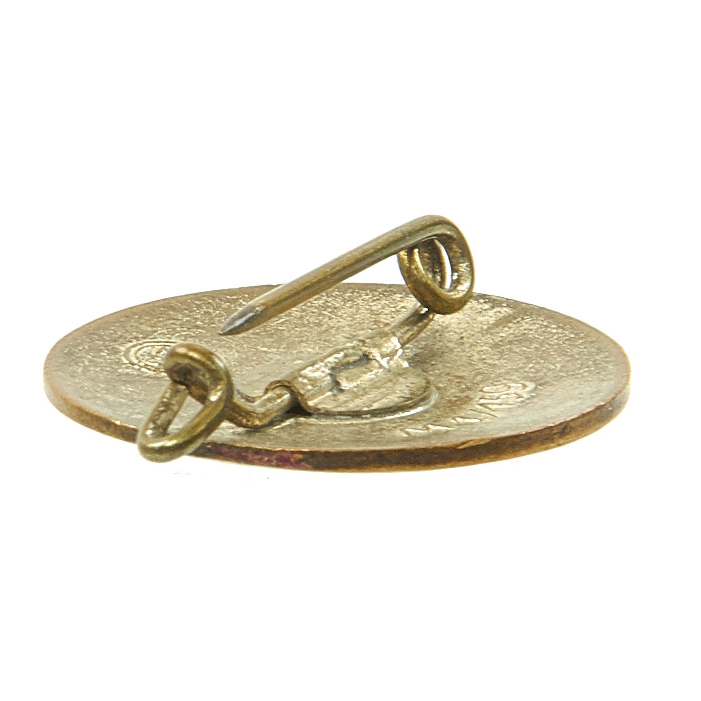 This example is a standard issue membership badge, awarded to all personnel on acceptance as an official party member. It is a 24mm diameter, die struck alloy badge NSDAP membership badge with multi-colored enamel work. The badge features a translucent red, circular outer border with embossed silvered script, NATIONAL-SOZIALSTISCHE-D.A.P., encompassing a white enamel field with canted black enamel Swas (swas). In very good condition, with mostly intact plating on the back, while the front is worn away to the brass base metal. Overall good condition with great enamel, and the back has a very nice "safety pin" style attachment, which would work on any type of clothing.
