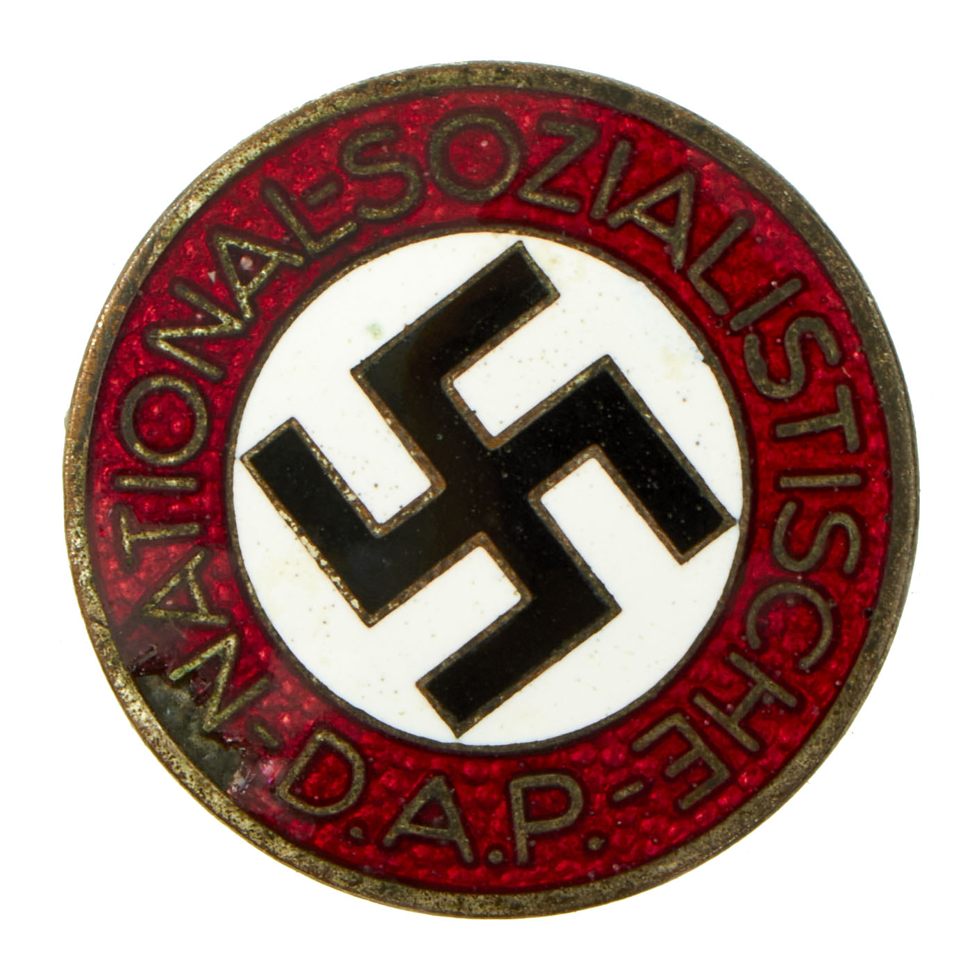 This example is a standard issue membership badge, awarded to all personnel on acceptance as an official party member. It is a 24mm diameter, die struck brass alloy badge NSDAP membership badge with multi-colored enamel work. The badge features a translucent red, circular outer border with embossed silvered script, NATIONAL-SOZIALSTISCHE-D.A.P., encompassing a white enamel field with canted black enamel Swas (hook cross). In very good condition, with little of the plating on the back, while the front is worn away to the base metal. Overall good condition with good enamel, which just has a few tiny scratches and a chip above the N. The back has a very nice functional "safety pin" style attachment, which would work on any type of clothing.