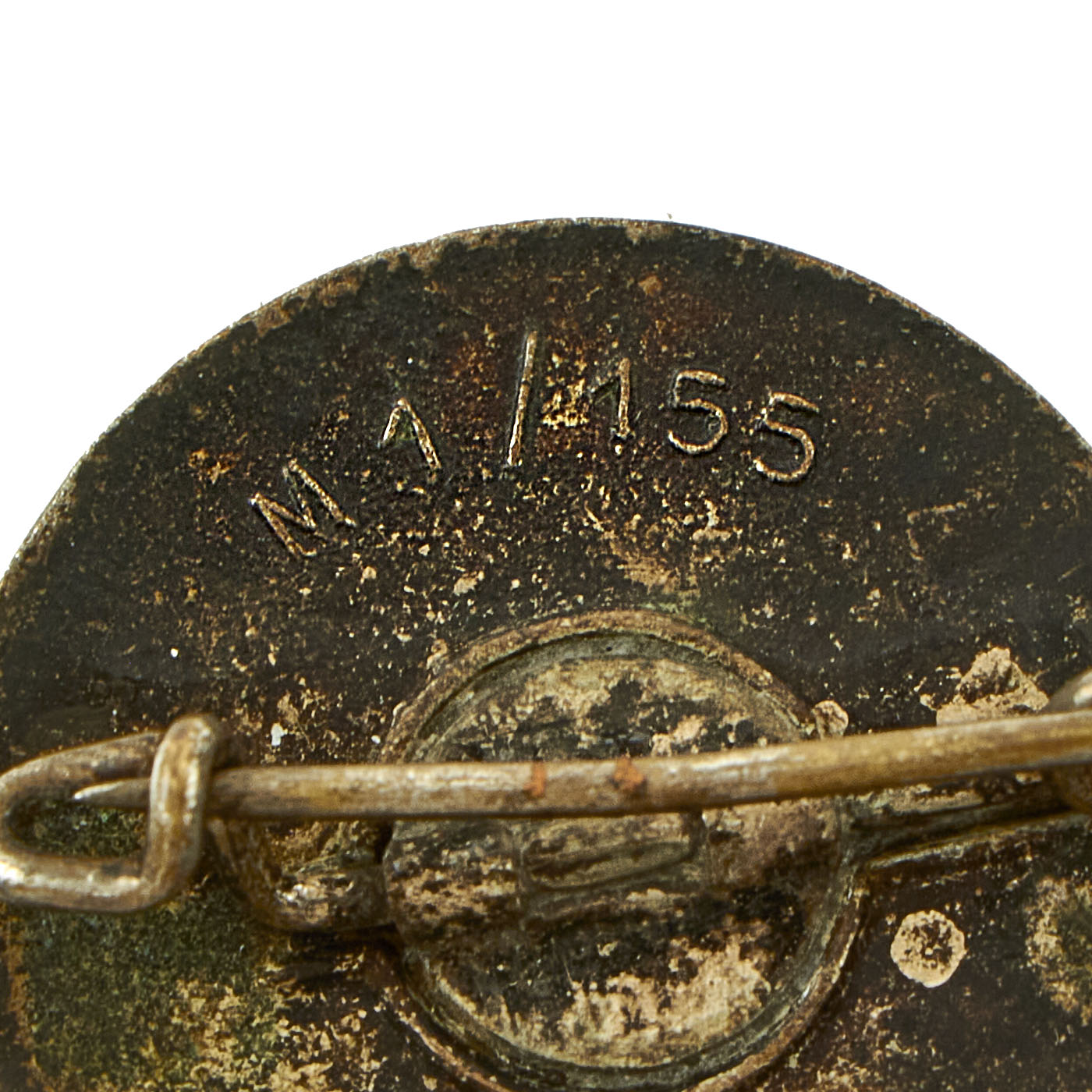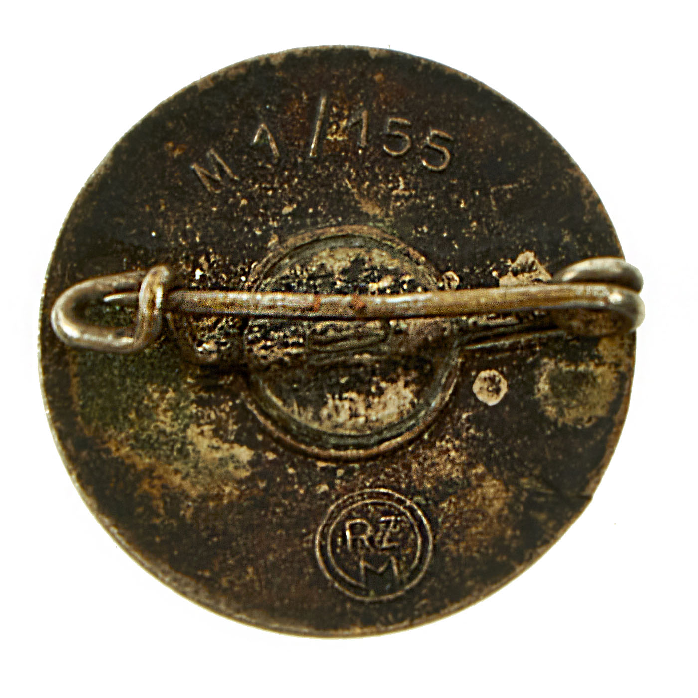 Of Note: In late 1934 items manufactured for the NSDAP and other organizations, including membership pins, came under the quality control of the RZM, Reichzeugmeisterei, (National Equipment Quartermaster) and as a result were marked with the RZM logo when appropriate. The registry was based at the Brown house in Munich and NSDAP party headquarters in Berlin. The RZM ensured that the manufacturers of military items were consistent in design, quality of materials and other characteristics of the items. It also defined standards of design, manufacturing and quality and published an authoritative color chart for textiles. The M1 in the code stands for Metal Badges, with Schwertner & Cie being contractor number 155.