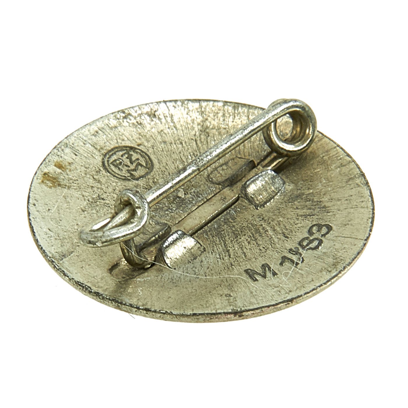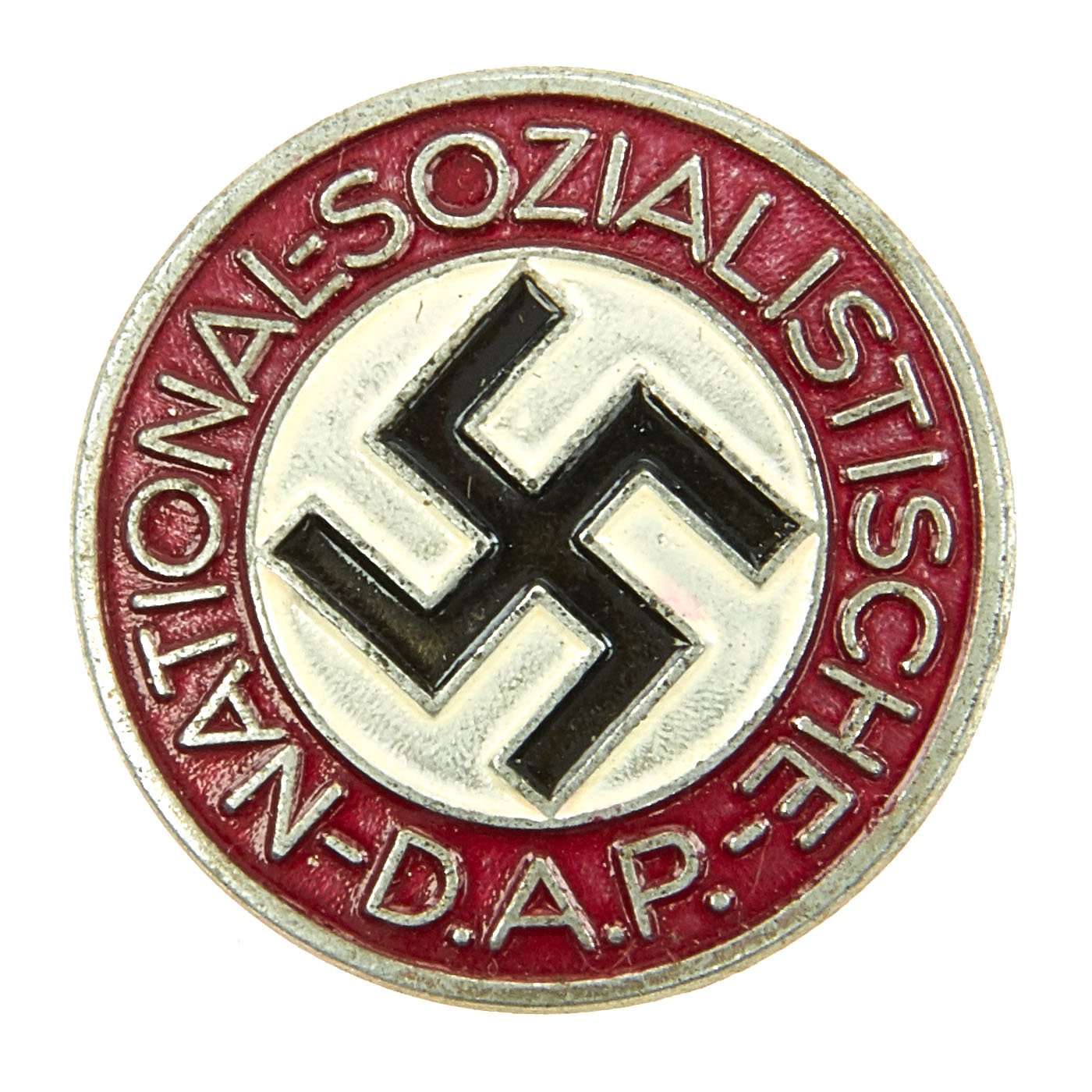 This example is a standard issue membership badge, awarded to all personnel on acceptance as an official party member. It is a 24mm diameter, die struck nickel alloy badge NSDAP membership badge with multi-colored enamel work. This badge is a late war version, so the enamel is just a thin coat, now the "filled" types from earlier. The badge features a translucent red, circular outer border with embossed silvered script, NATIONAL-SOZIALSTISCHE-D.A.P., encompassing a white enamel field with canted black enamel Swas (swas). In very good condition, with a good amount of plating overall. Overall good condition with good enamel. The back has a very nice functional "safety pin" style attachment, which would work on any type of clothing.