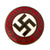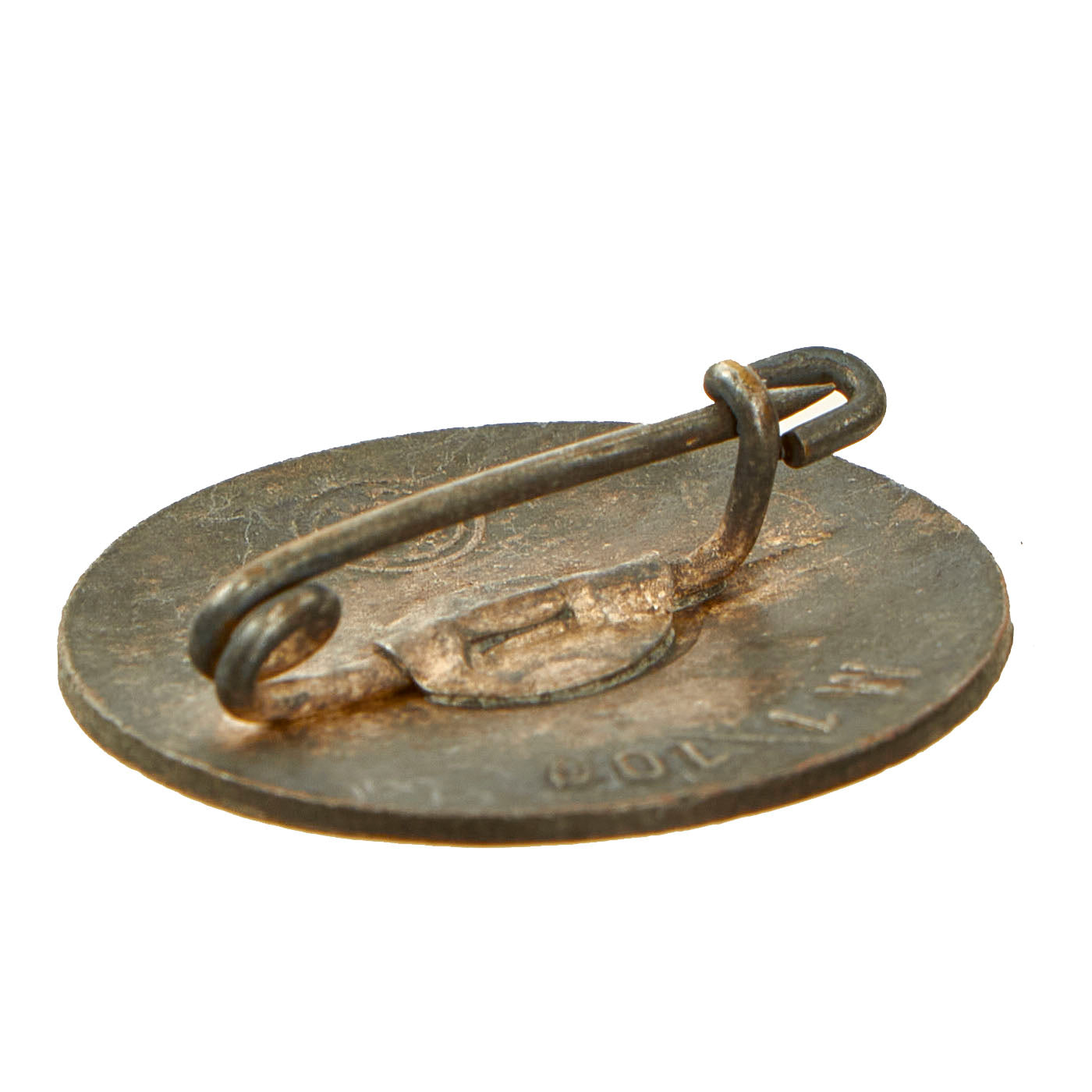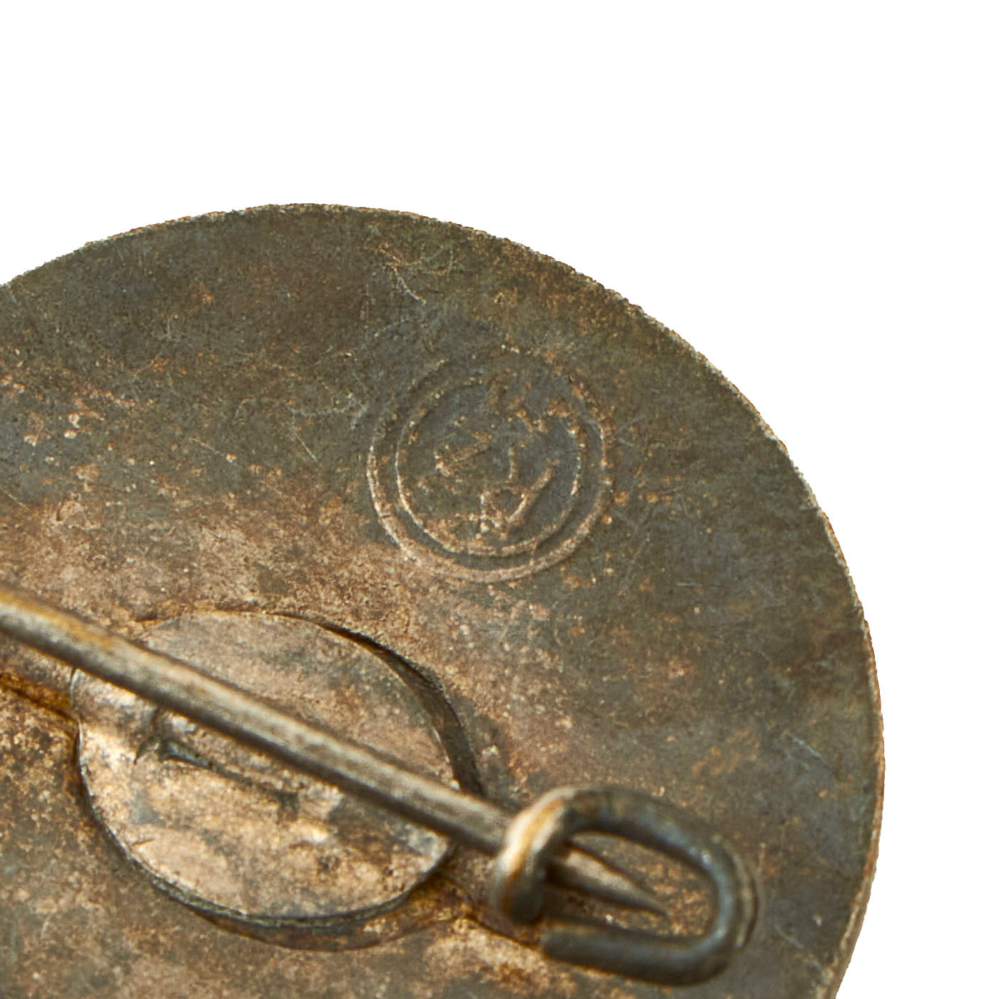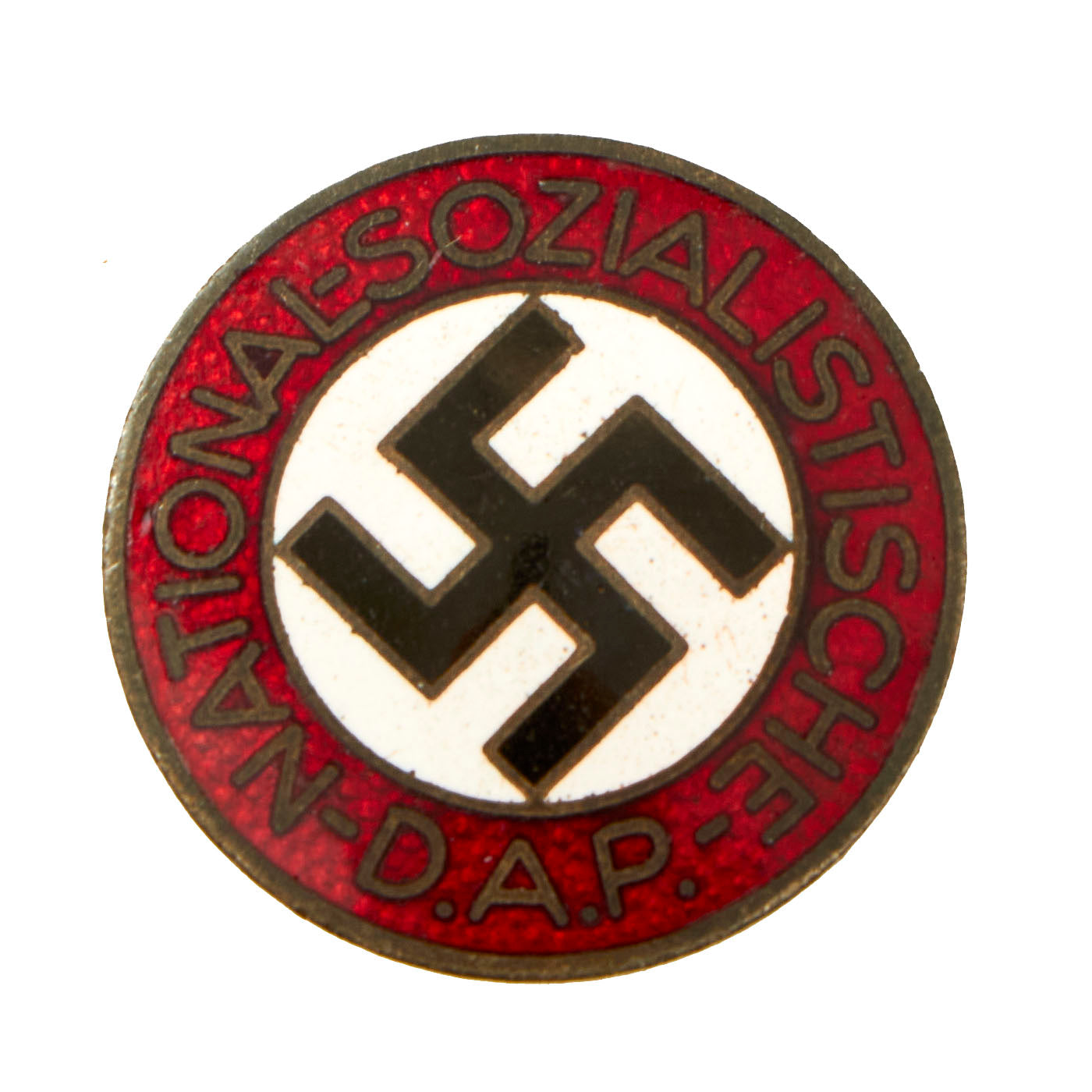 This example is a standard issue membership badge, awarded to all personnel on acceptance as an official party member. It is a 24mm diameter, die struck brass alloy badge NSDAP membership badge with multi-colored enamel work. The badge features a translucent red, circular outer border with embossed silvered script, NATIONAL-SOZIALSTISCHE-D.A.P., encompassing a white enamel field with canted black enamel Swas. In very good condition, with a good amount plating on the back, while the front is worn away to the brass base metal. Overall good condition with good enamel, which just has a few tiny scratches. The back has a very nice functional "safety pin" style attachment, which would work on any type of clothing.