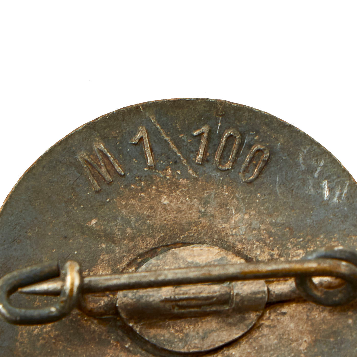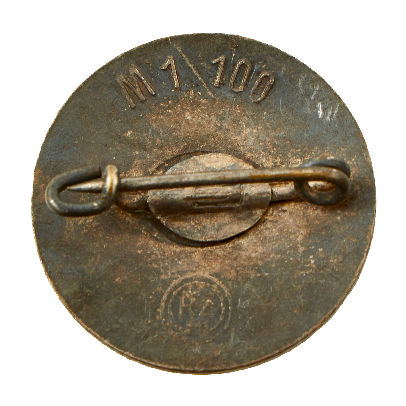 Of Note: In late 1934 items manufactured for the NSDAP and other organizations, including membership pins, came under the quality control of the RZM, Reichzeugmeisterei, (National Equipment Quartermaster) and as a result were marked with the RZM logo when appropriate. The registry was based at the Brown house in Munich and NSDAP party headquarters in Berlin. The RZM ensured that the manufacturers of military items were consistent in design, quality of materials and other characteristics of the items. It also defined standards of design, manufacturing and quality and published an authoritative color chart for textiles. The M1 in the code stands for Metal Badges, with Werner Redo of Saarlautern being contractor number 100.