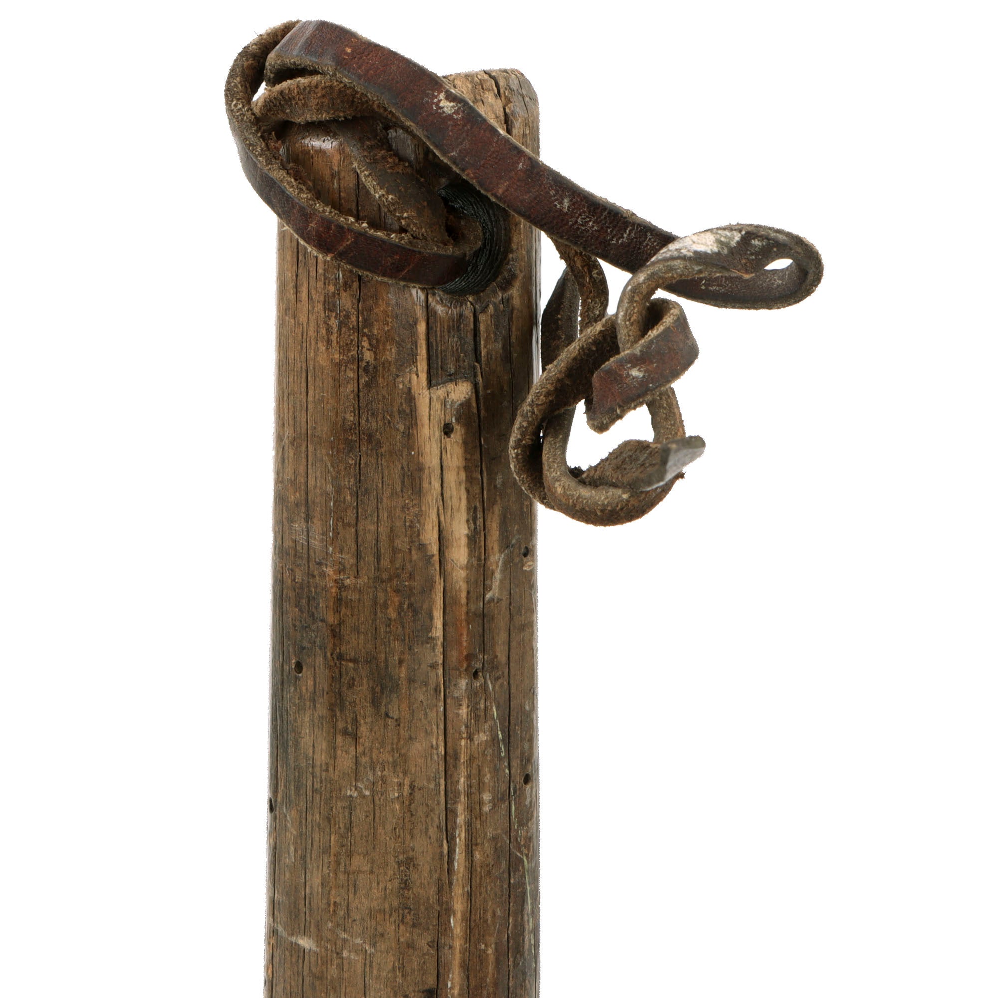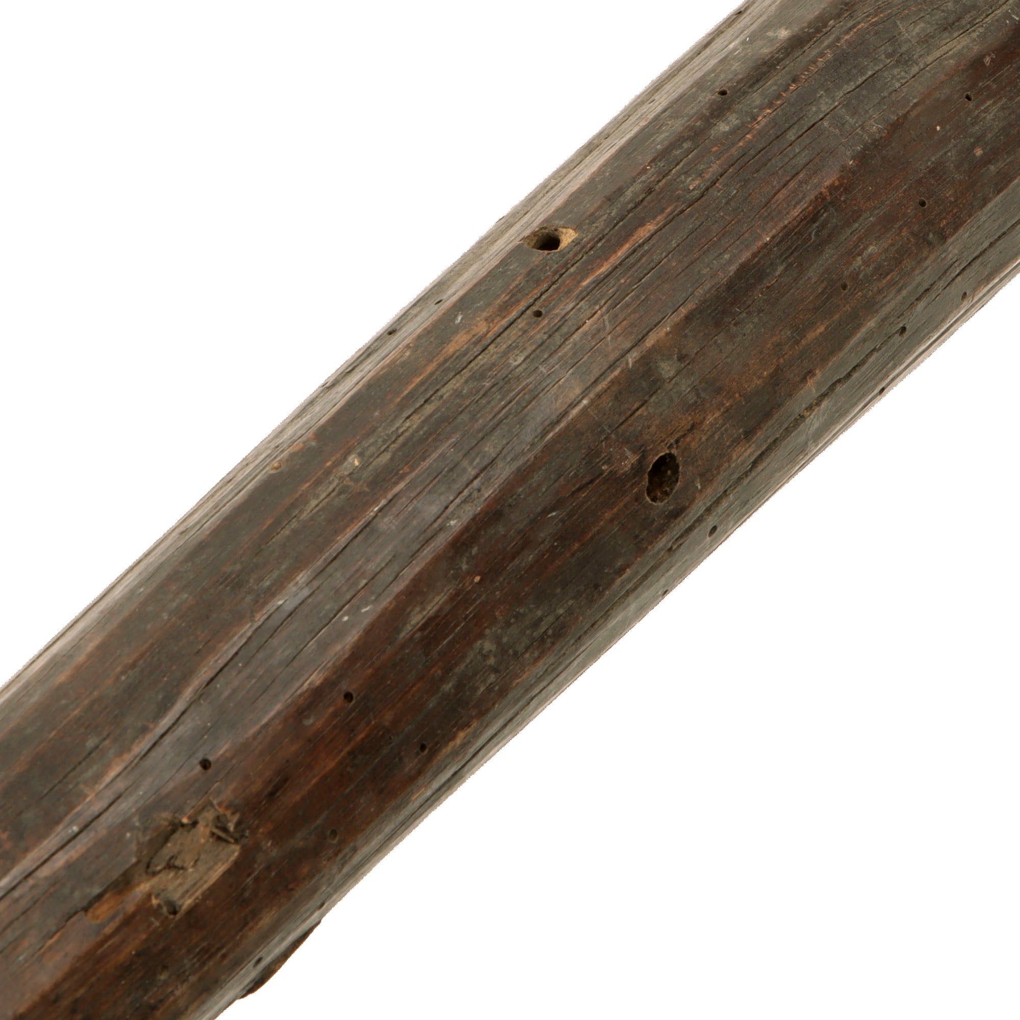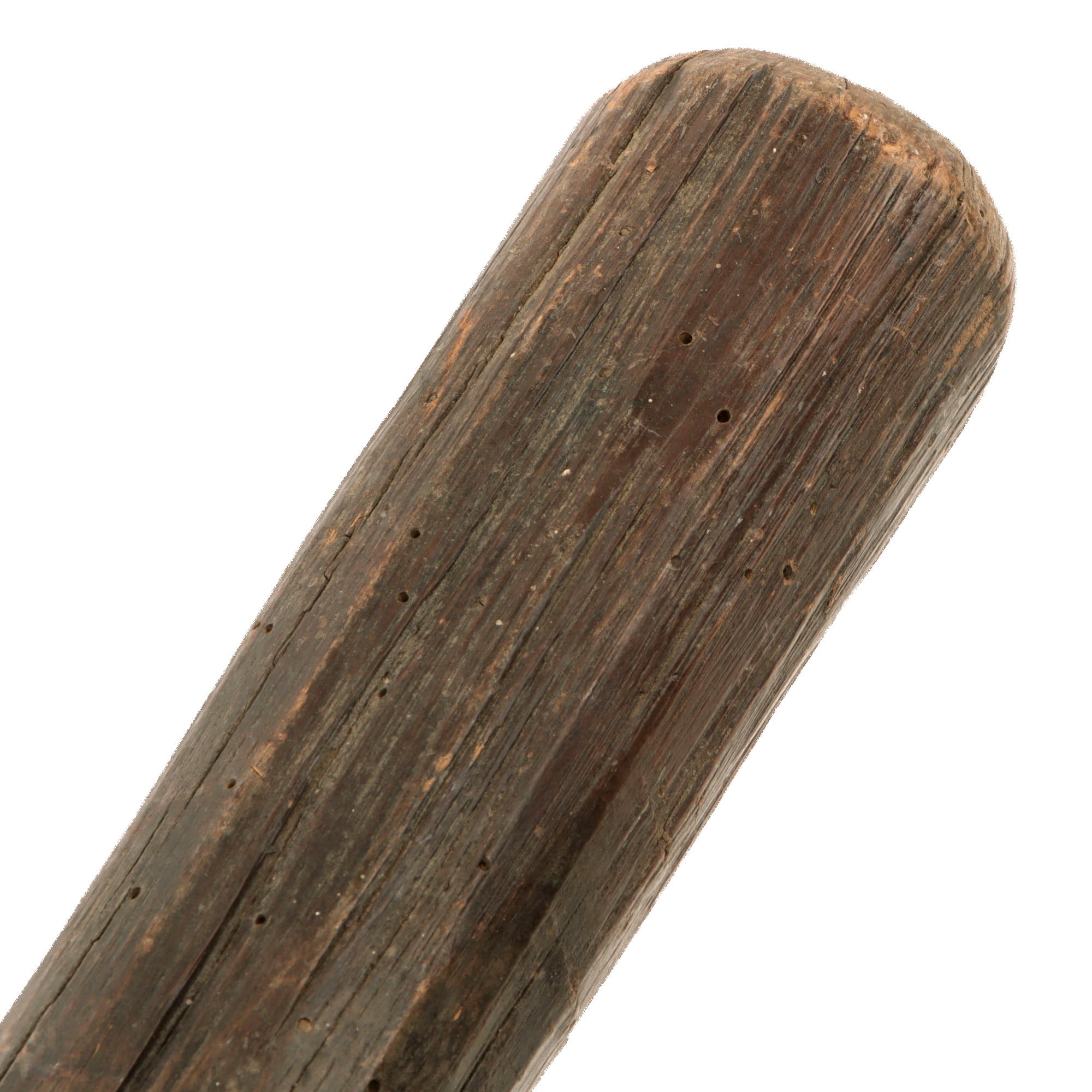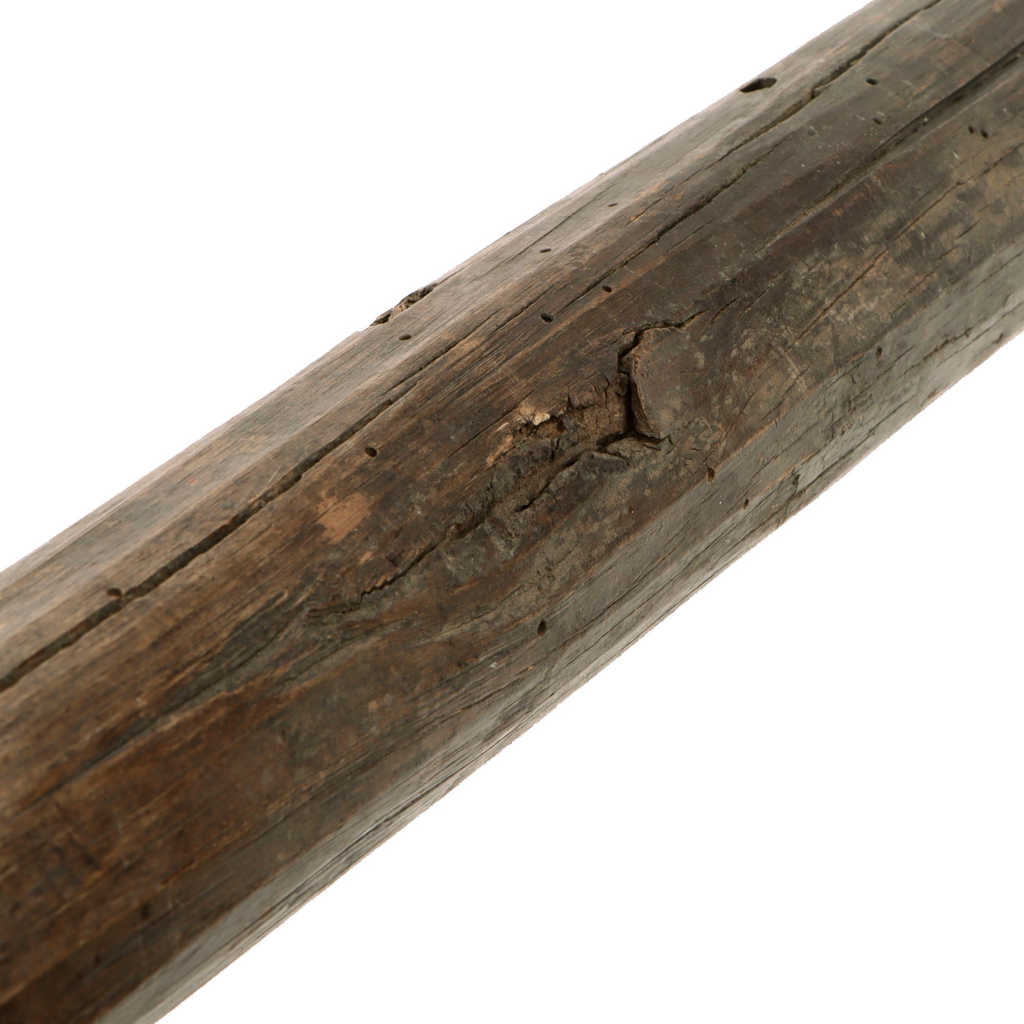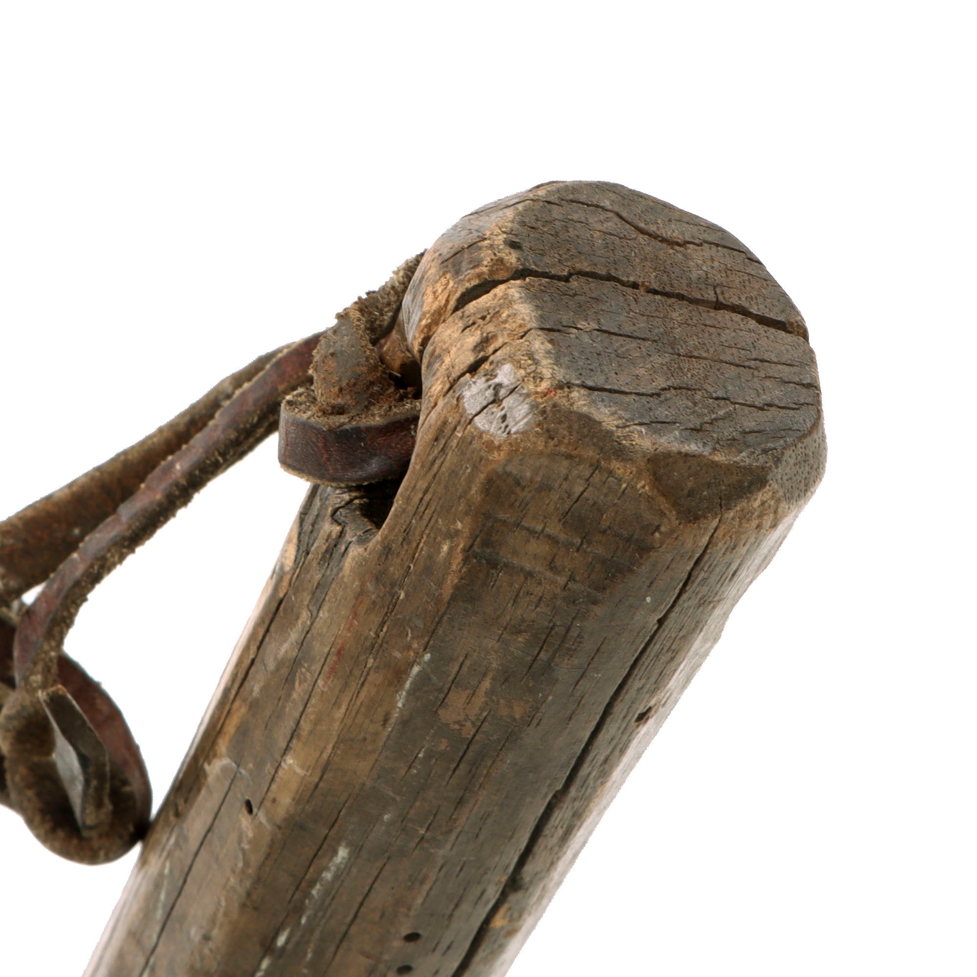 This is a fantastic documented example of a very crude but effective all-wooden trench club, which we believe to be of either German or British origin. There is very heavy woodworn damage across the club as shown with heavy cracking in some spots. The portion of the leather wrist strap remaining shows good patina, and this certainly is a throwback to our Neanderthal past as Machnicki mentions.