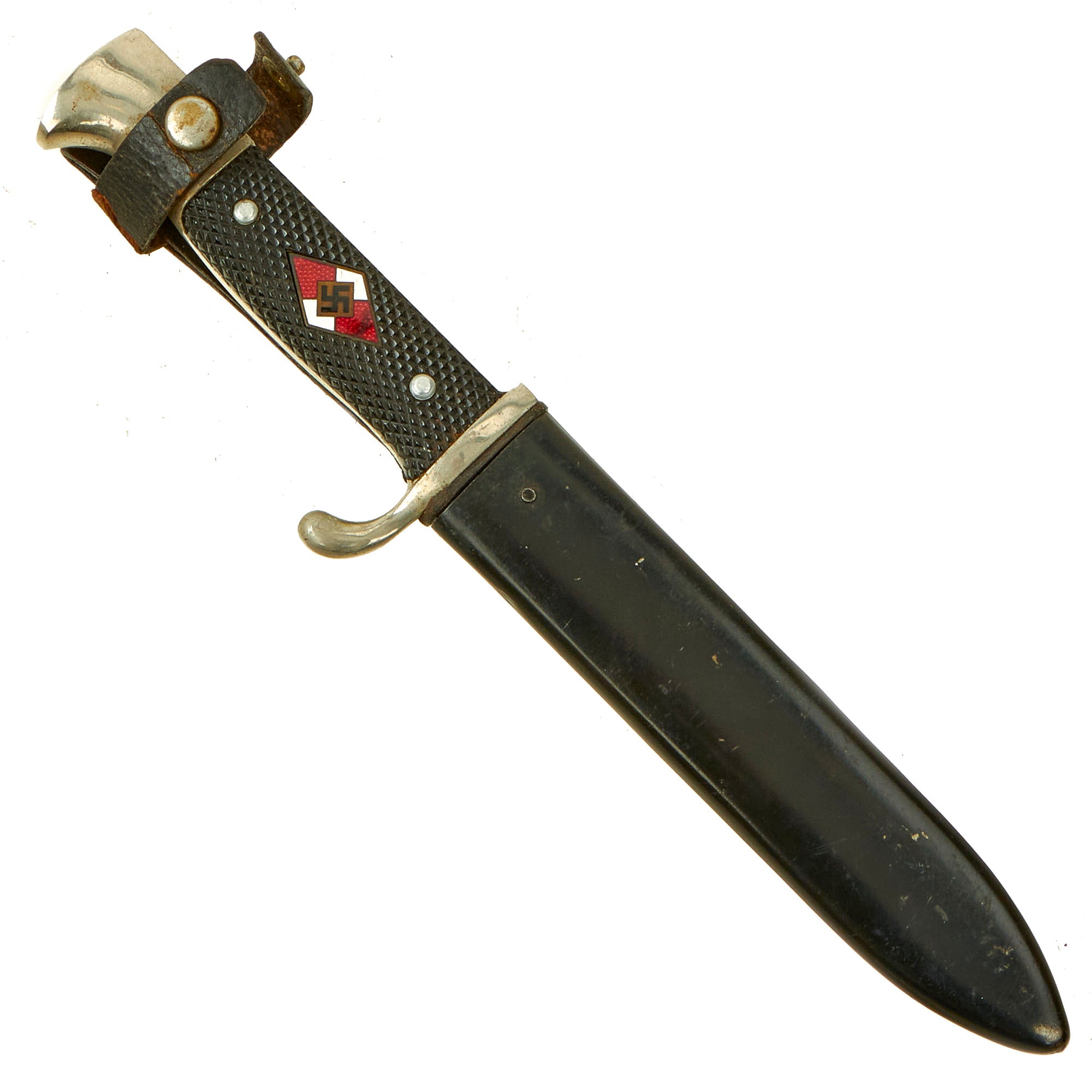 The HJ Leaders were professionals in charge of the training and NSDAP education of the German Youth. They wore a special dagger consisting of silvered hilt fittings with blue-black leather-covered scabbard. The grip was composed of tightly wrapped silver wire, over a wood base. The pommel cap featured an HJ diamond on top, complete with swas. The upper scabbard fitting portrayed an open-winged HJ eagle with swas cut into the bird's chest. The blade was etched with the HJ motto, Blut und Ehre!