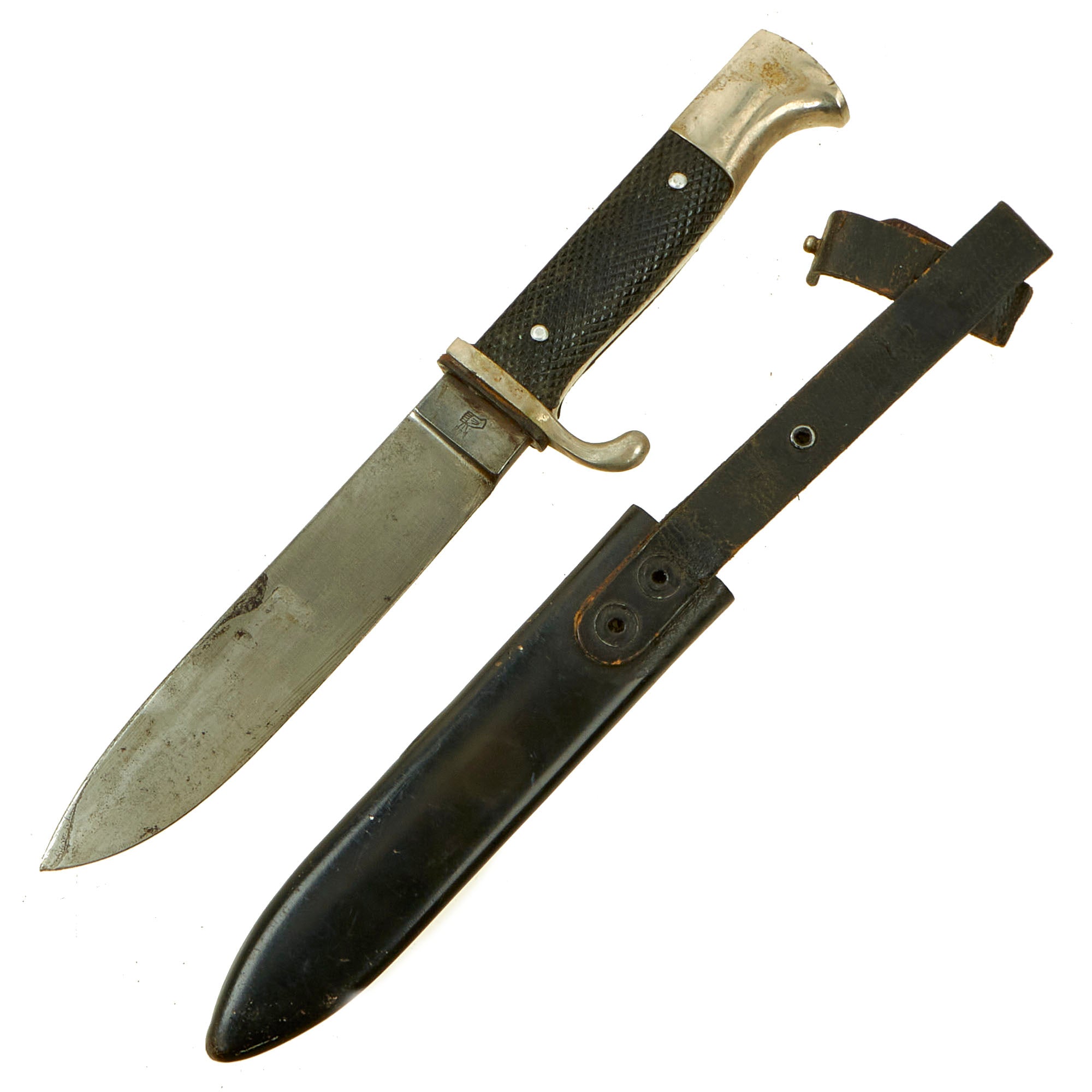 AH believed German youth to be the future of his 3rd Reich. The HJ (AH Jugend) was formed officially in 1935, and with the exception of NSDAP ideology indoctrination was very similar to the Boy Scouts. Beginning at about the age of ten years, both boys (AH Jugend) and girls (Bund Deutscher Mädel) were enlisted in the Party-run organization. The boys only were given HJ Knives after having passed minor exams. The knives had nickeled hilts with black checkered grip plates. The obverse plate was fitted with an enameled HJ swas insignia. Through 1937, these knives were etched with the motto of the organization, Blut und Ehre! (Blood and Honor!). Examples produced after this date were made with plain blades usually bearing an RZM marking.