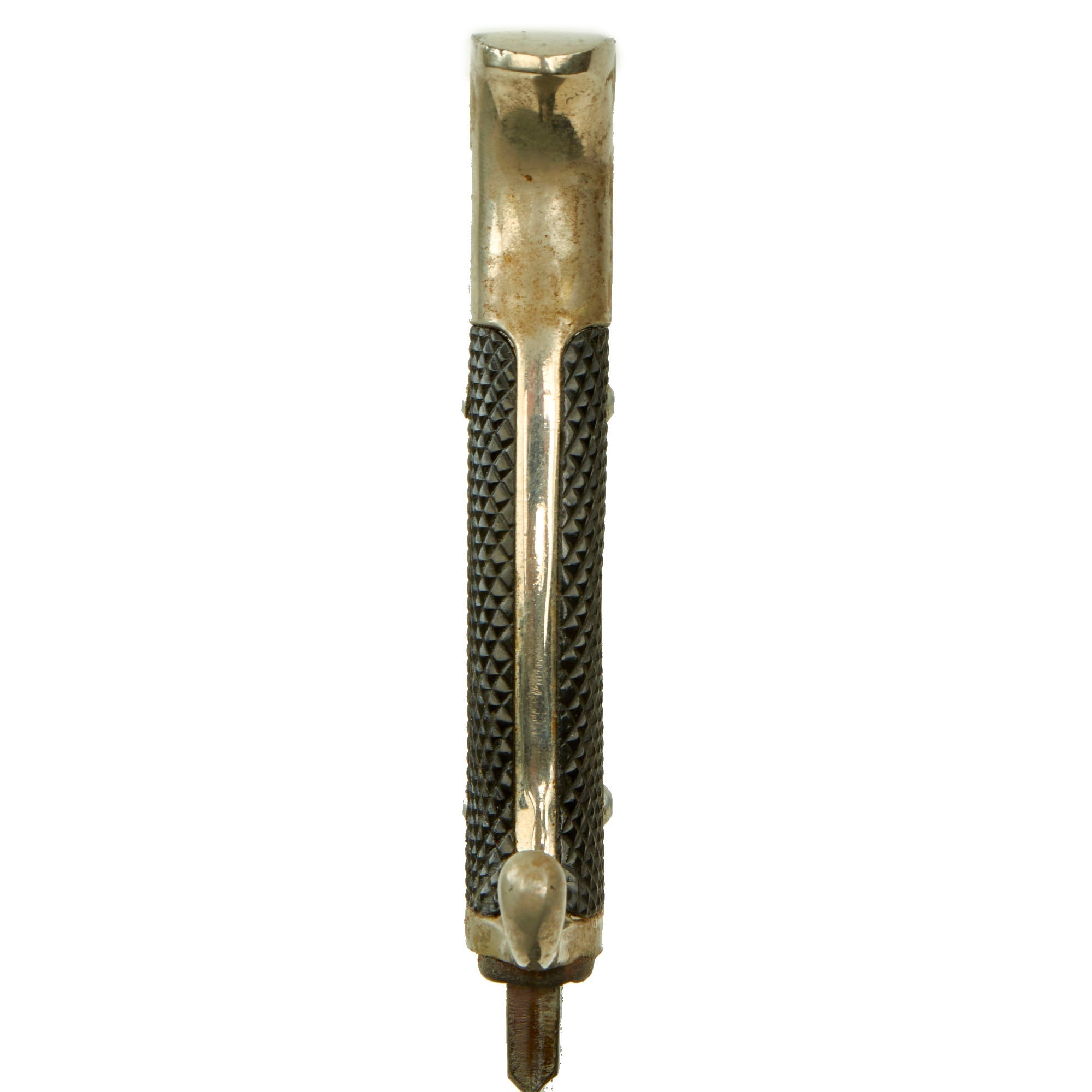 The knife is in very good condition, with a very nice blade showing just a bit of oxidation and wear. The factory final grind cross grain is nearly completely retained. The alloy hilt is in very good condition, showing some denting around the edge, but with mostly intact plating. The bakelite / plastic grip panels are retained by aluminum rivets, and the WWII Period HJ insignia is in very good shape.
