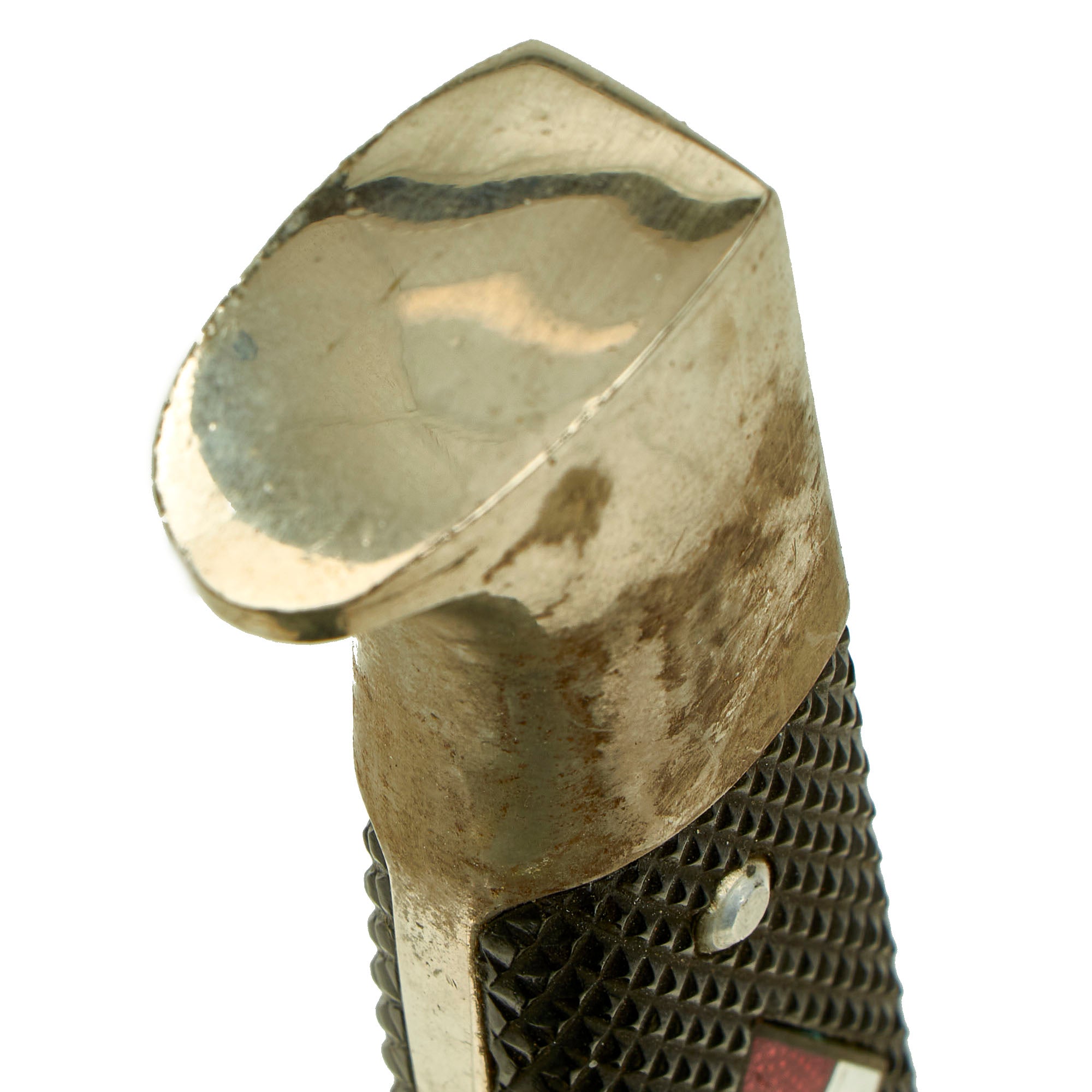 This is one such knife imported by PIC, which was then fitted with an original HJ insignia, probably from a cap. It is in an original scabbard with a belt loop, which is the WWII style. This is however an item intended to deceive, most likely modified during the 1950s-1960s after importation. The lack of an RZM code as well as the PIC marking confirm that this is definitely not a WWII original, however construction wise it is identical to the WWII knives, down to the final grind cross grain on the blade.