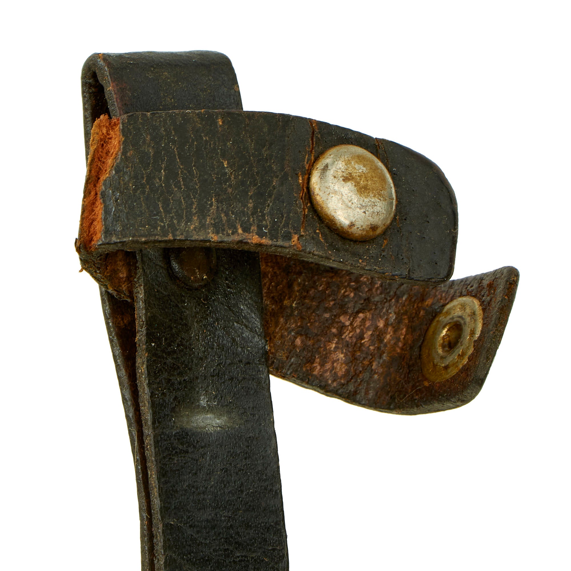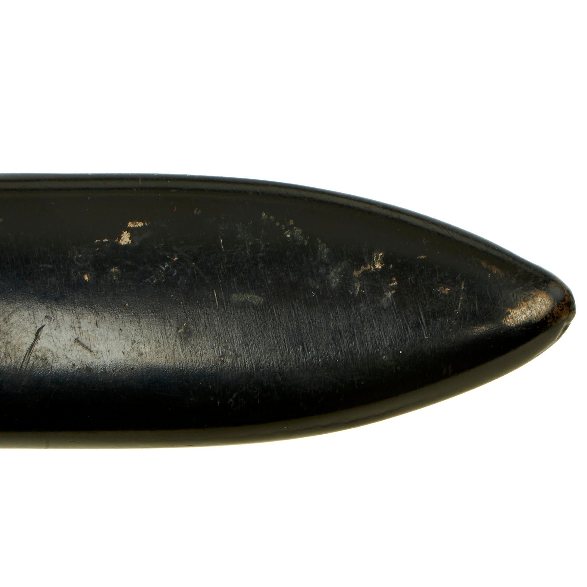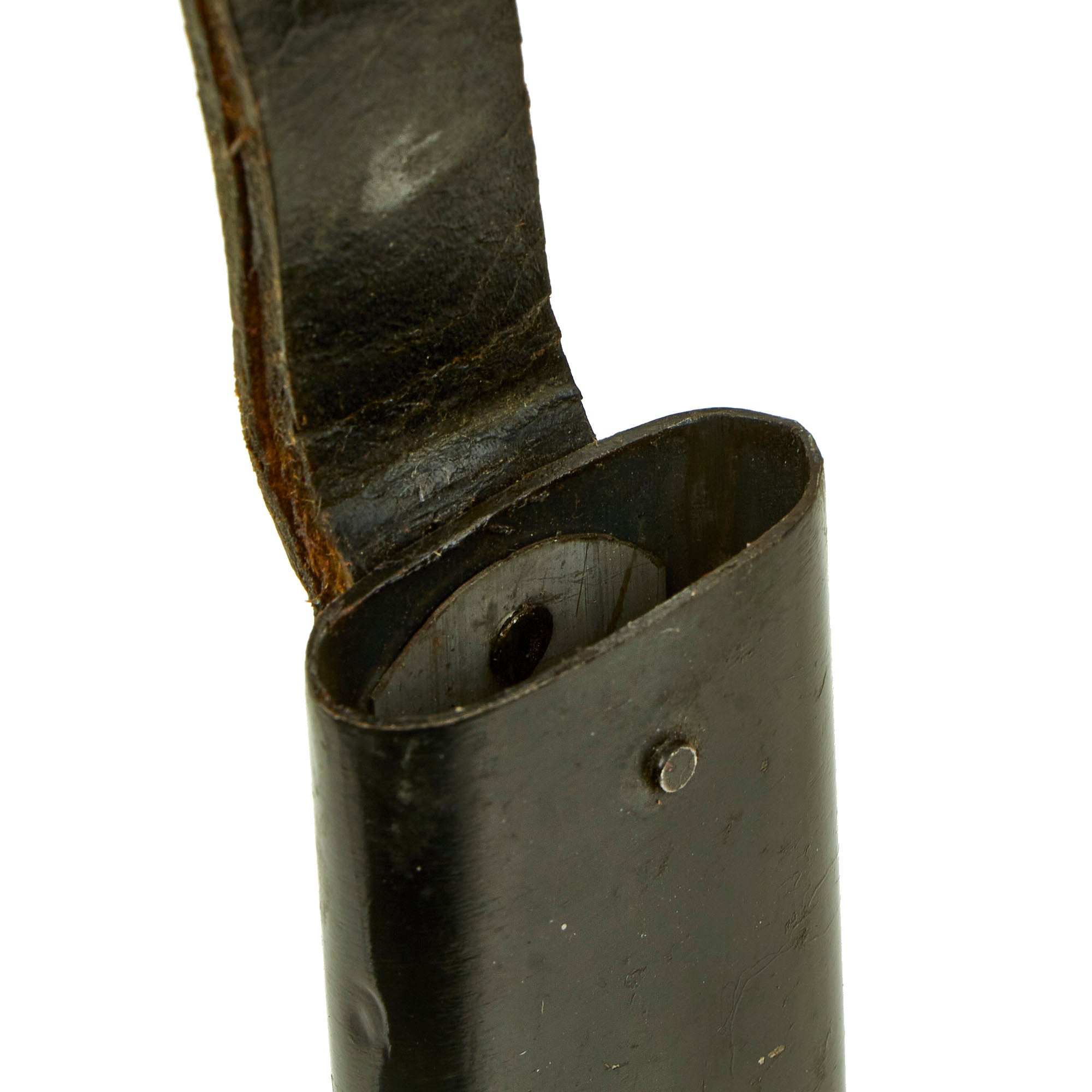 The scabbard retains over 95% of the original black enamel, with just a bit of wear. The belt loop is still present, however the securing loop leather is very delicate.