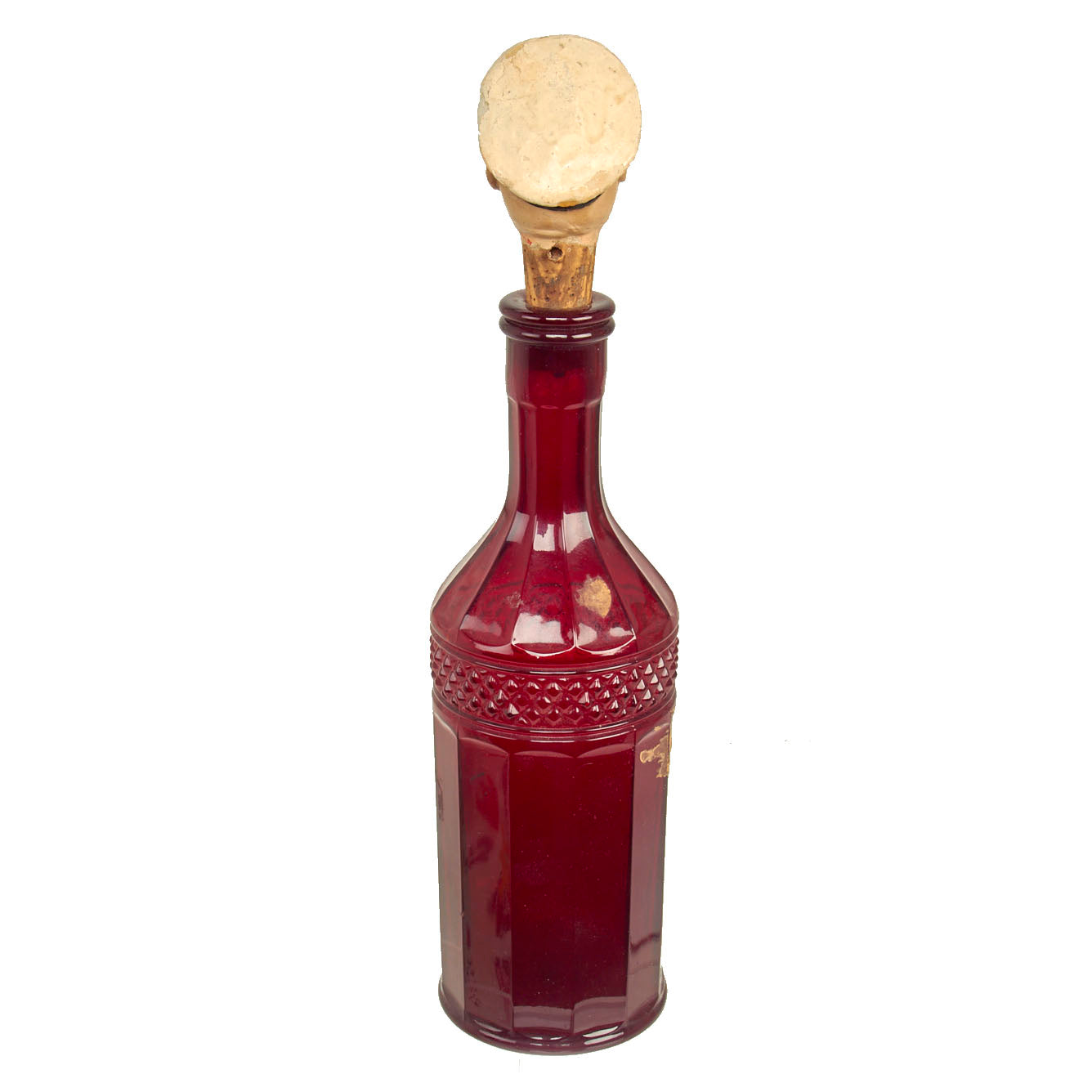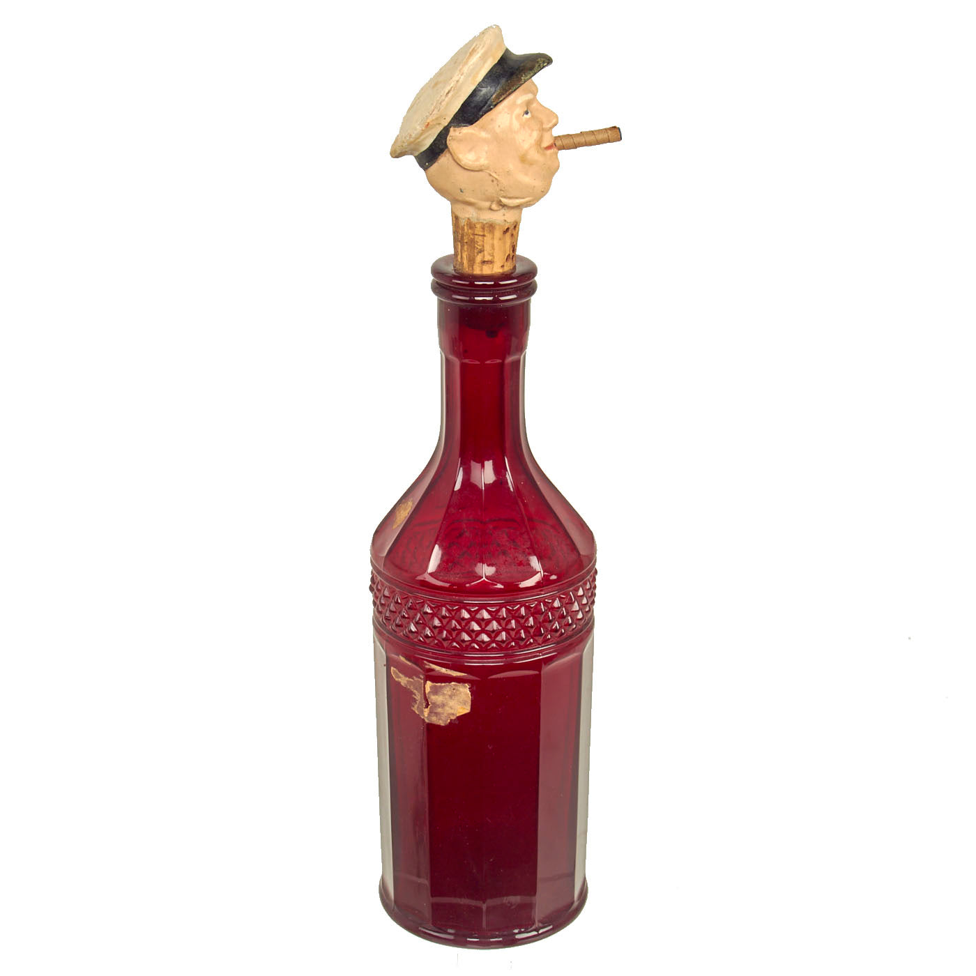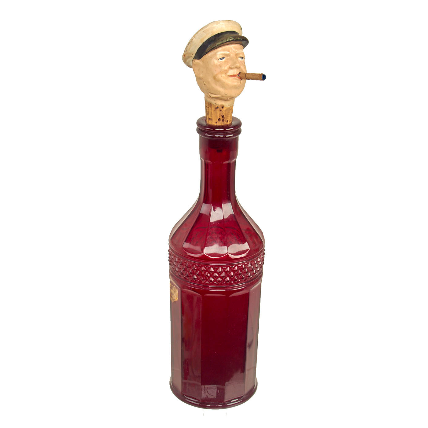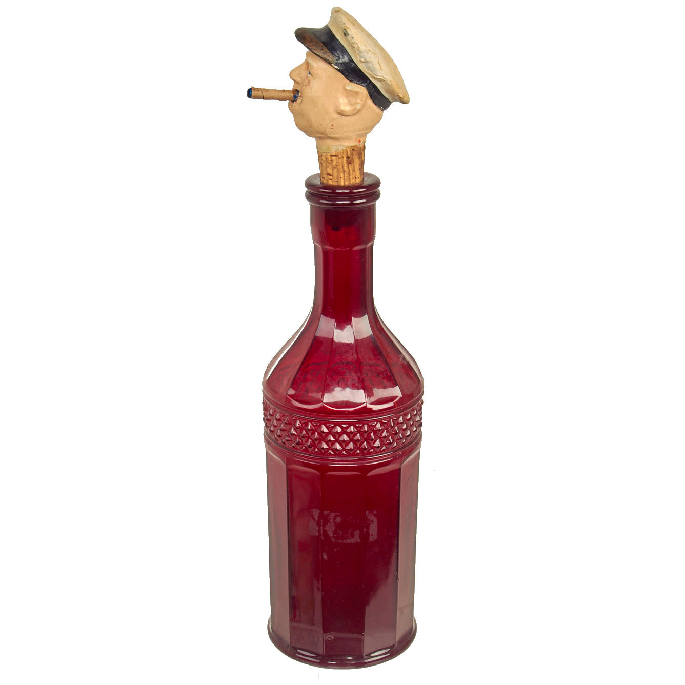 This example is in good condition but there is the expected chipping in the material due to age and use. The relief of Churchill was done well enough to be easily recognized and even has his trademark cigar. The cigar doubles as a breather and or spout for pouring liquid due to being constructed out of a tube. There are no markings present but this is identical to the same construction as many other examples we have seen. The stopper is paired with a lovely red glass bottle which also has no markings present.