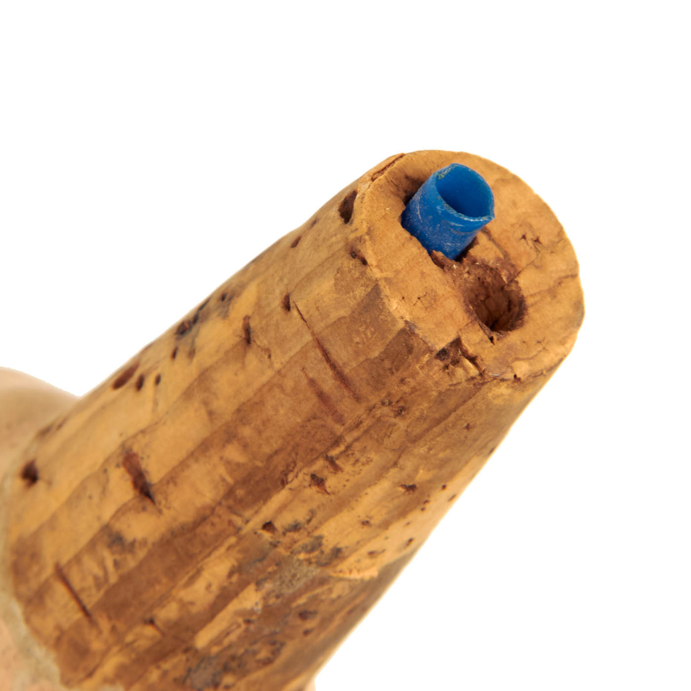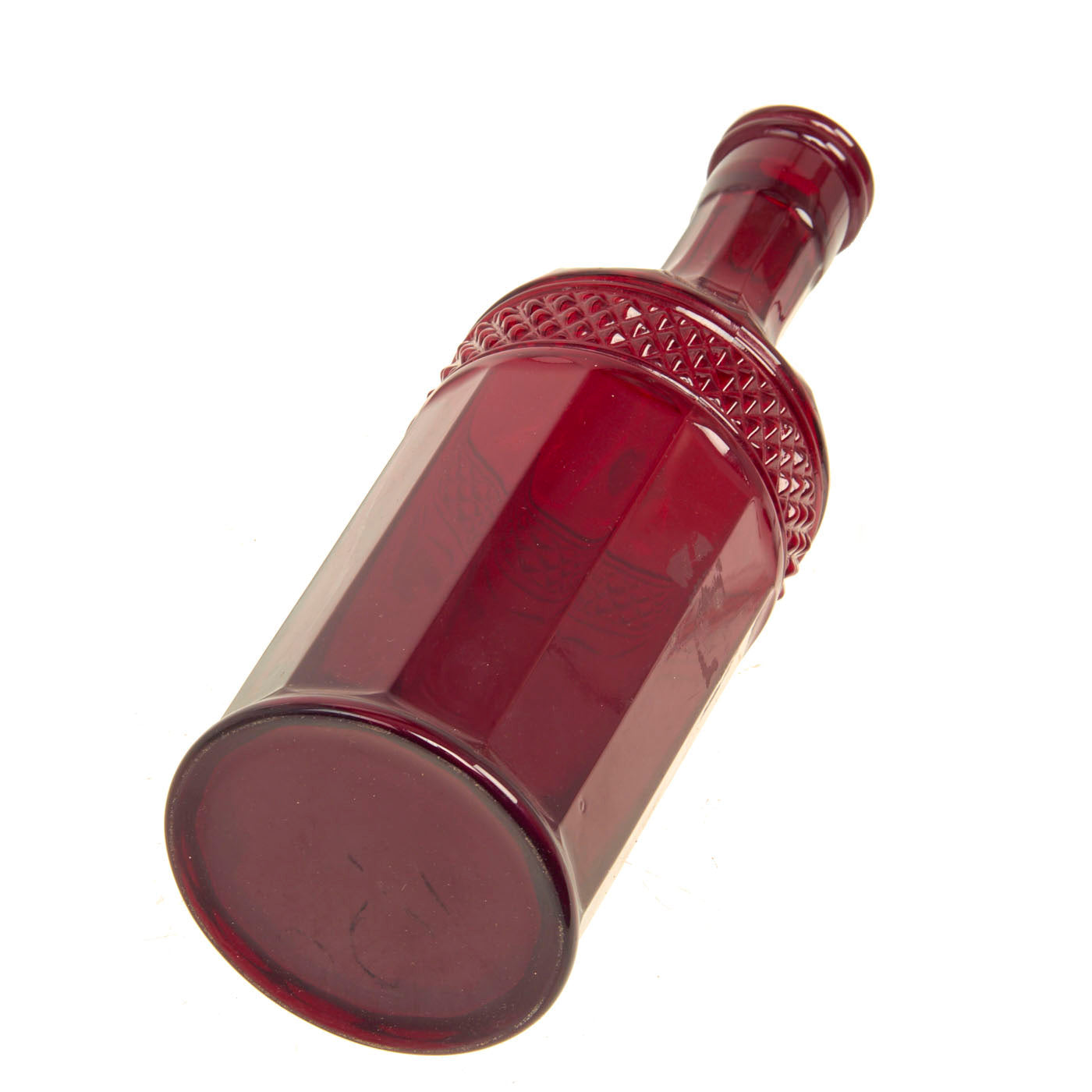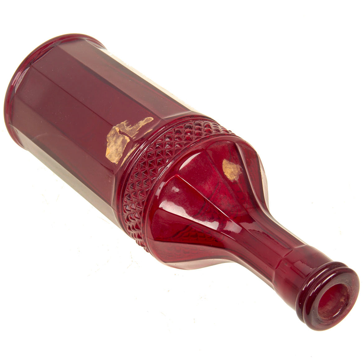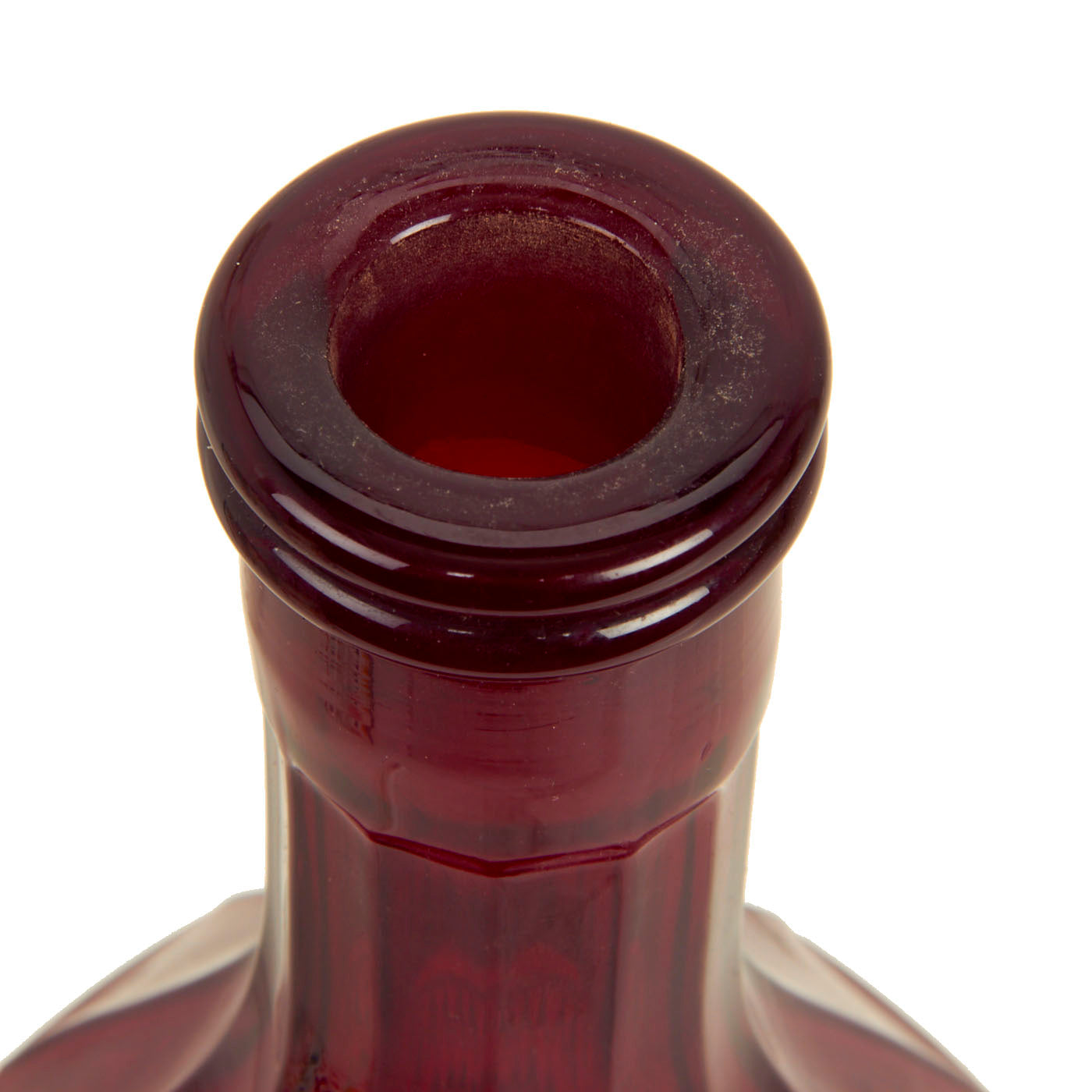 This example is in good condition but there is the expected chipping in the material due to age and use. The relief of Churchill was done well enough to be easily recognized and even has his trademark cigar. The cigar doubles as a breather and or spout for pouring liquid due to being constructed out of a tube. There are no markings present but this is identical to the same construction as many other examples we have seen. The stopper is paired with a lovely red glass bottle which also has no markings present.