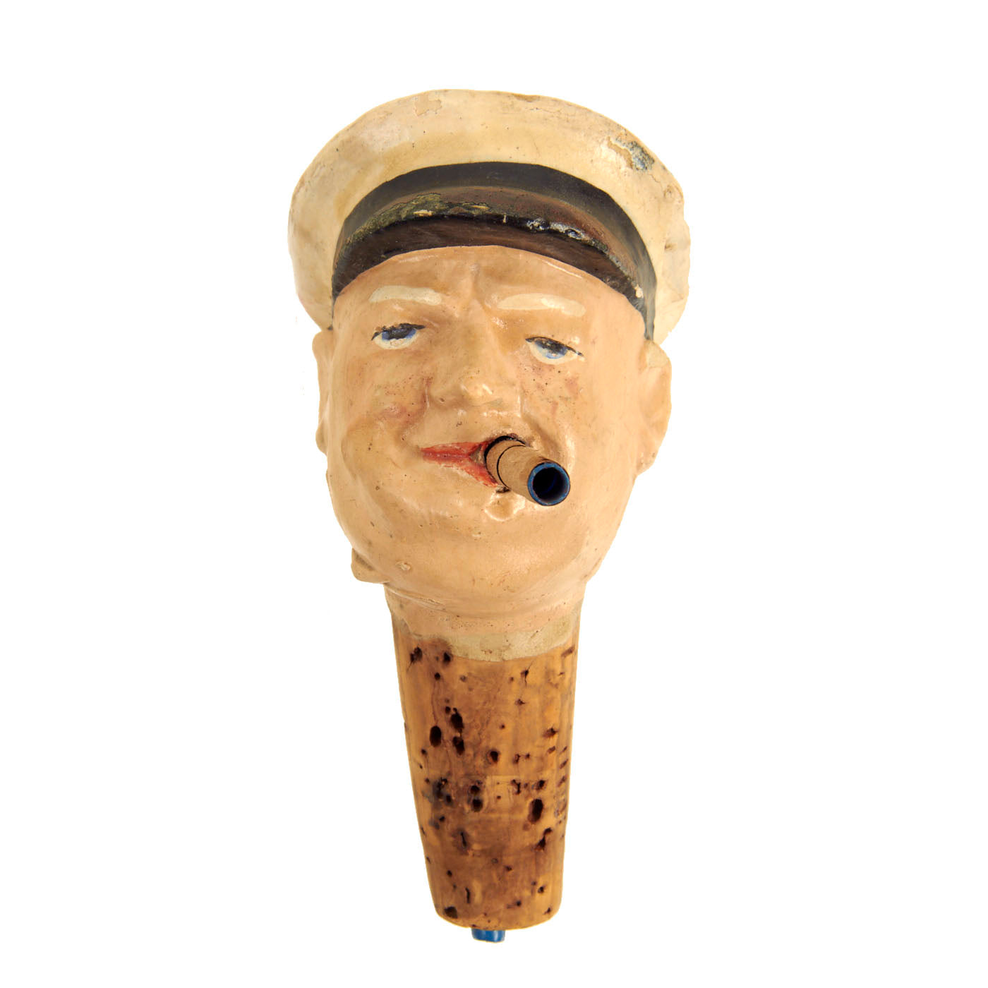 Original Item: Only One Available. This is a lovely example of a novelty cork bottle stopper modeled after Winston Churchill. The German company, Achatit Werkstätten, made these with Hans Schirmer, the founder, and Peter Ludwig, the sculptor/designer. Achatit Werkstätten was one of the major producers in the 1950s and 1960s of the wildly popular wine stoppers, wall masks, sculptures, and plaques that decorated so many modern homes of the era.