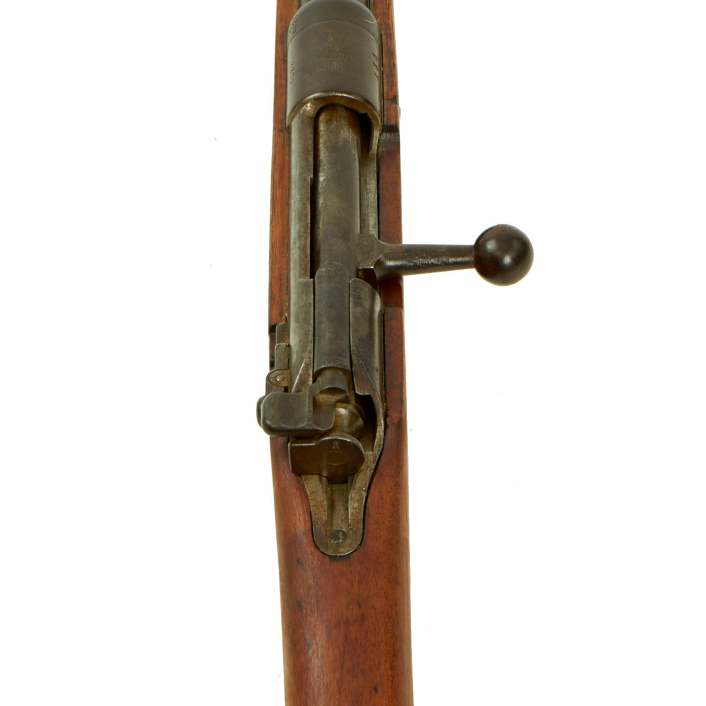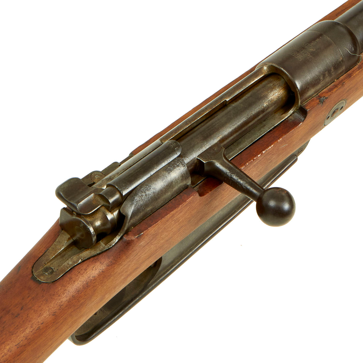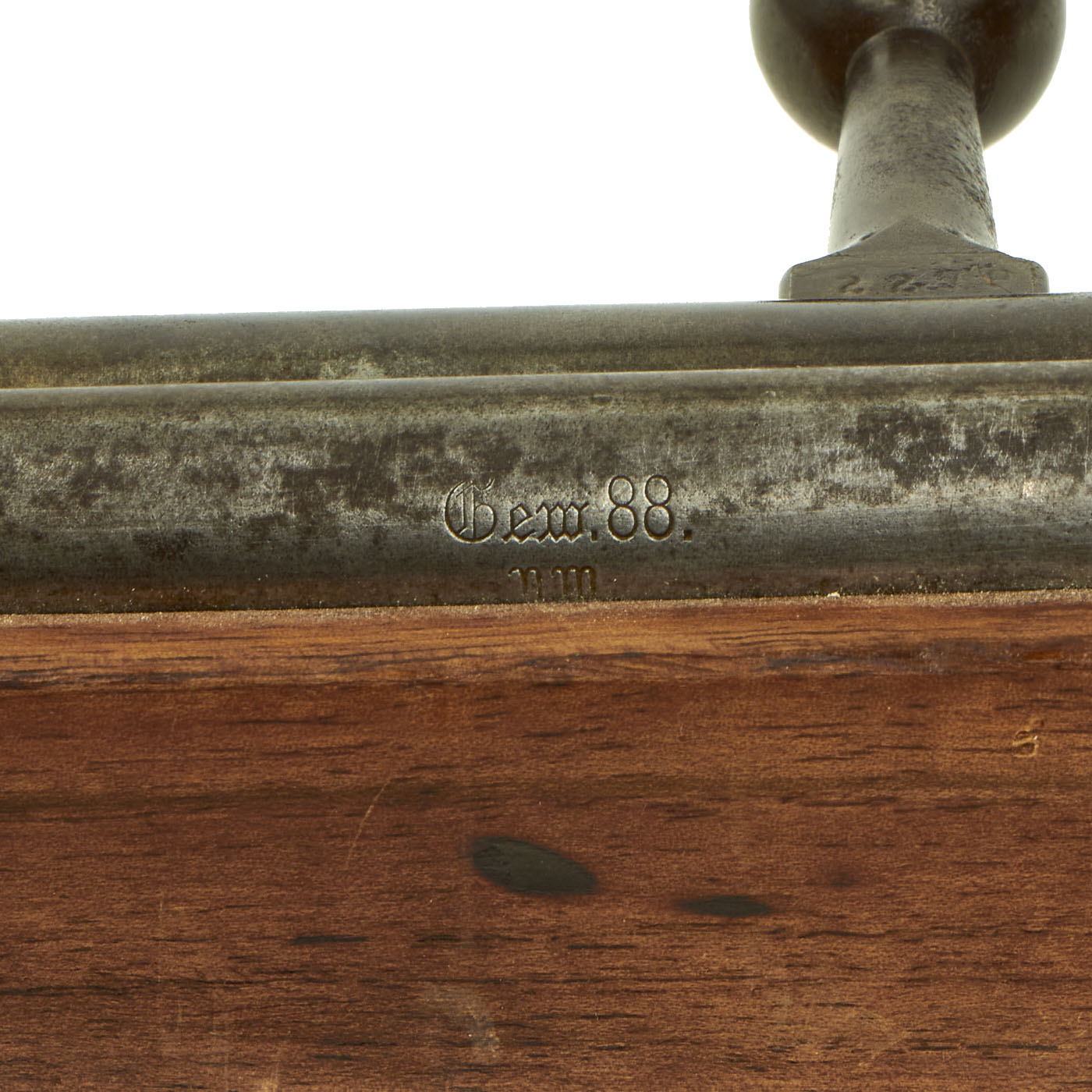 Original Item: Only one Available. This is a very nice example of the iconic German Gewehr 1888 "Commission Rifle", also known as the Gewehr 88, or GEW 88. It was manufactured at the Amberg Imperial Arsenal, located in Amberg, Bavaria, and then and then saw long service, as indicated by the large number of different markings on the gun. It definitely looks to have been reconditioned at arsenal, where parts were often replaced with those from other rifles. It also does not have any export markings from Turkey or other countries, so this was never shipped off as WWI aid. We very rarely see these rifles in this configuration!