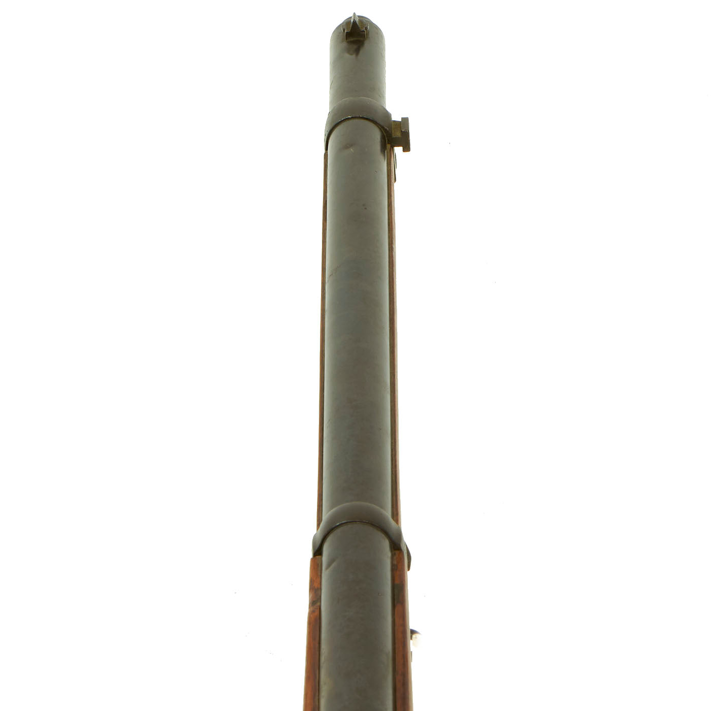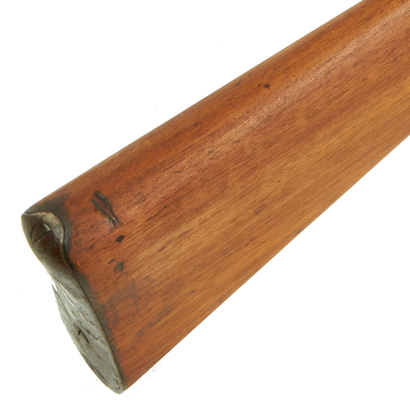 There is some wear on the bolt bearing surfaces, and some areas of light oxidation staining on the bolt. However, the bore is in excellent condition with crisp lands and grooves and a bright finish. It looks to have seen very little use during service. The bolt extractor, which is easily lost during cleaning, is still present, as is the rare double slot cleaning rod. The rifle cycles and dry fire well, however the end of the firing pin was removed or broke off at some point.