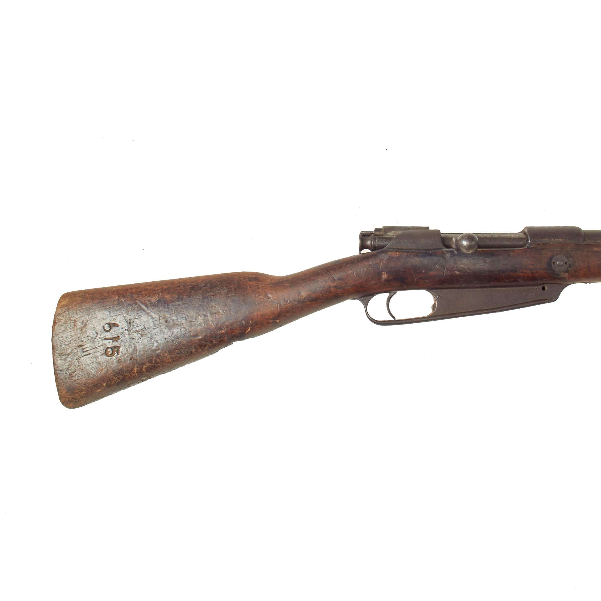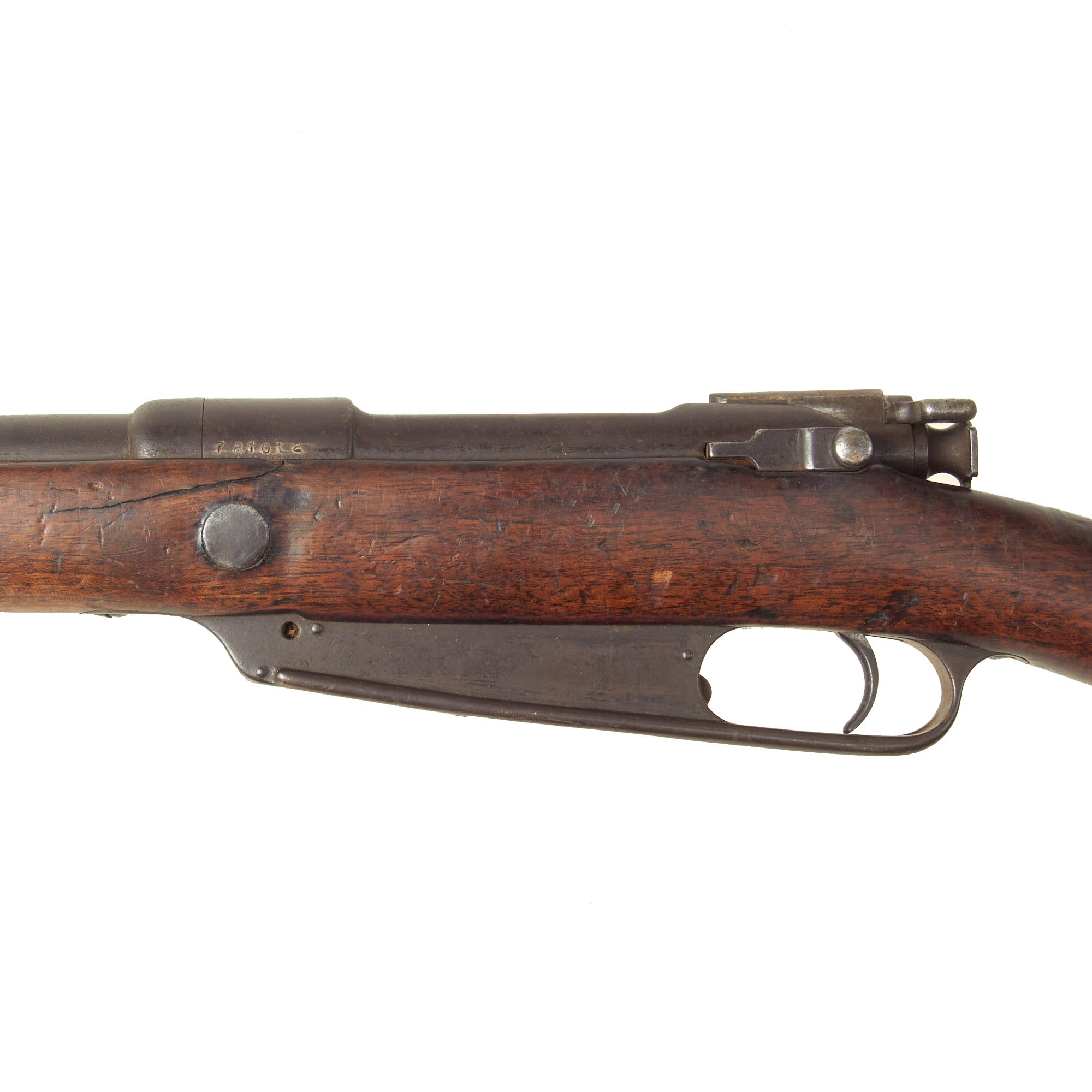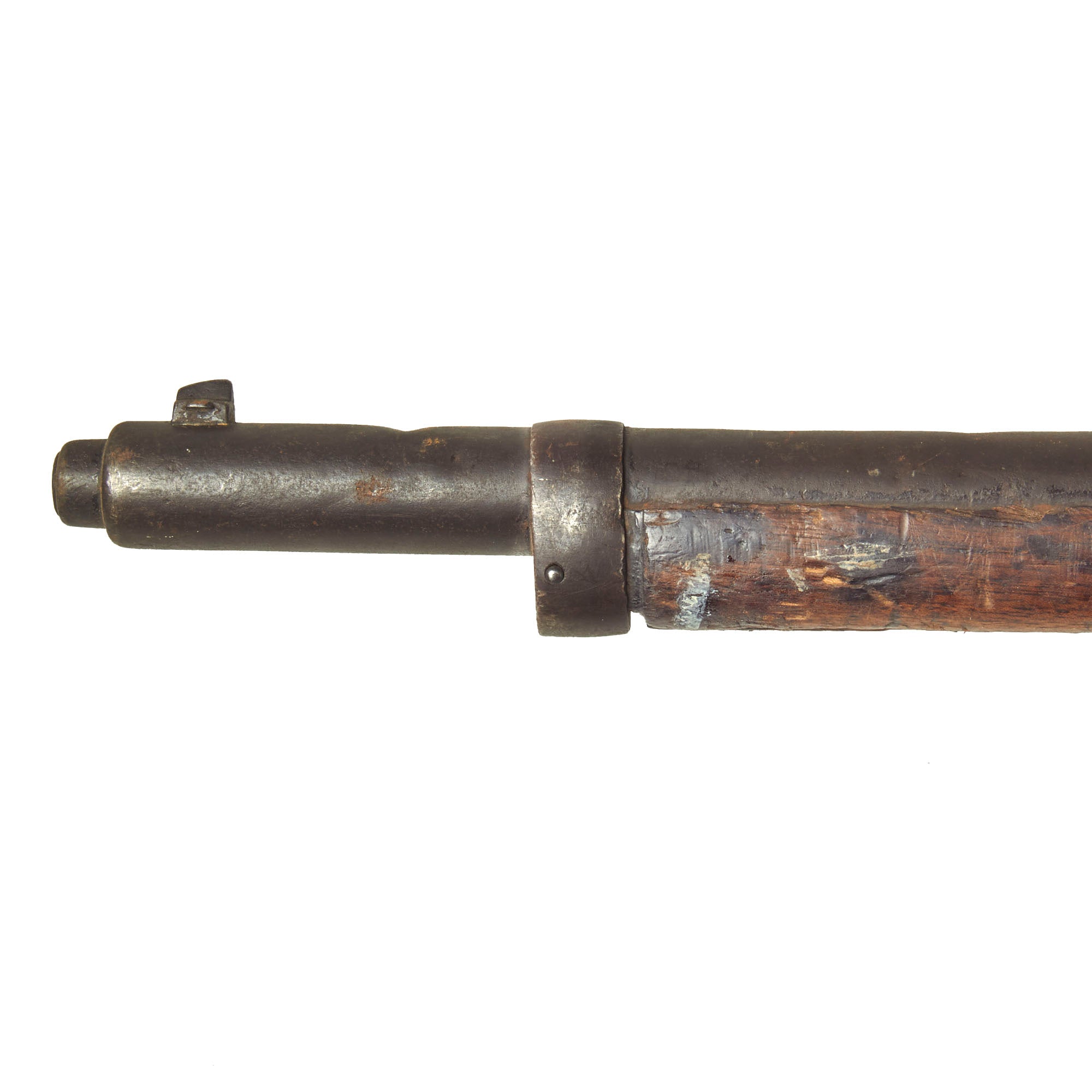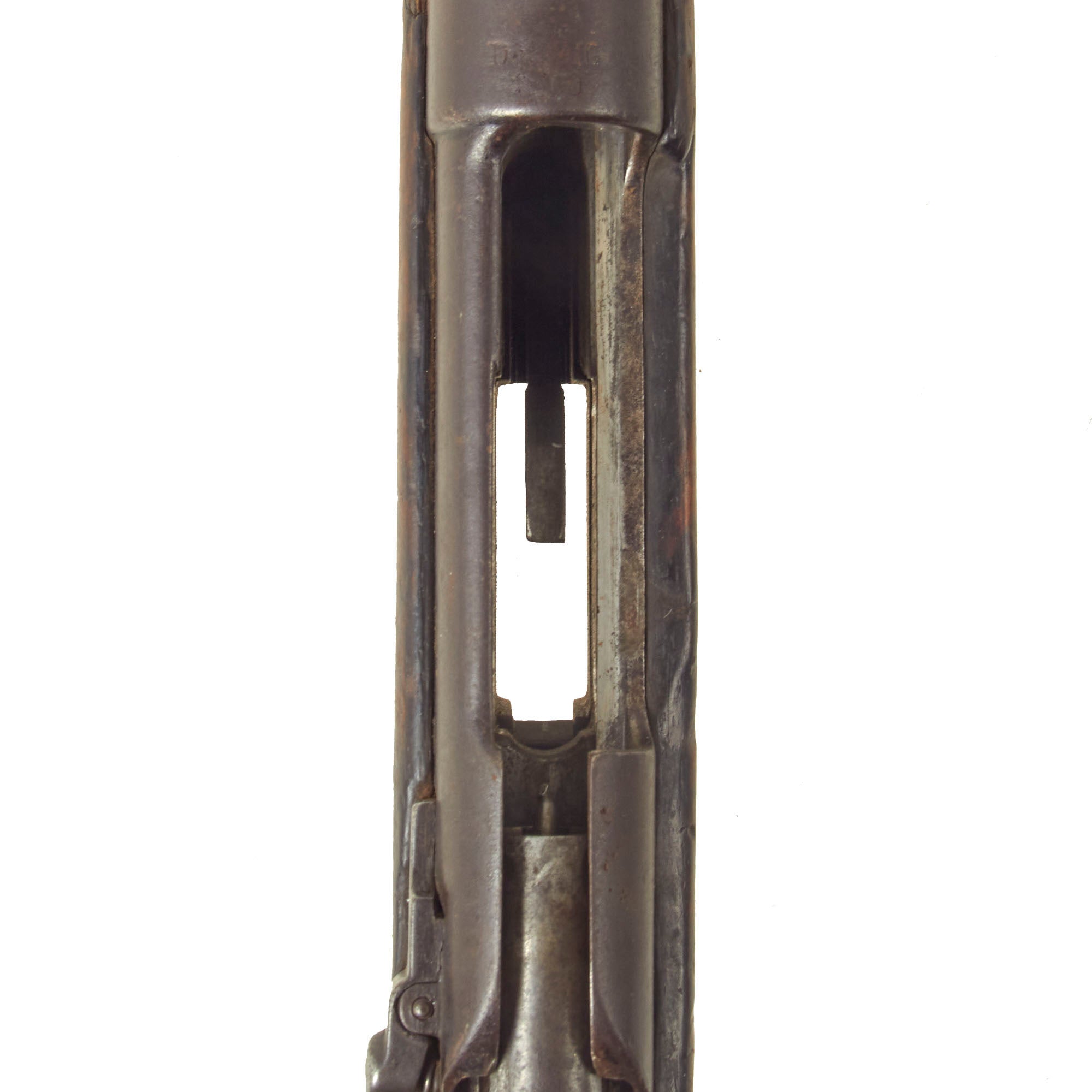 The right side of the receiver is very faintly marked Gew. 88 n German blackface type and also has re-marked serial number 781012on the receiver, barrel jacket (remarked), and magazine housing. Over the chamber it is very faintly marked DANZIG. / 1890., for manufacture at the Imperial arsenal in Danzig on the Baltic Sea Coast.