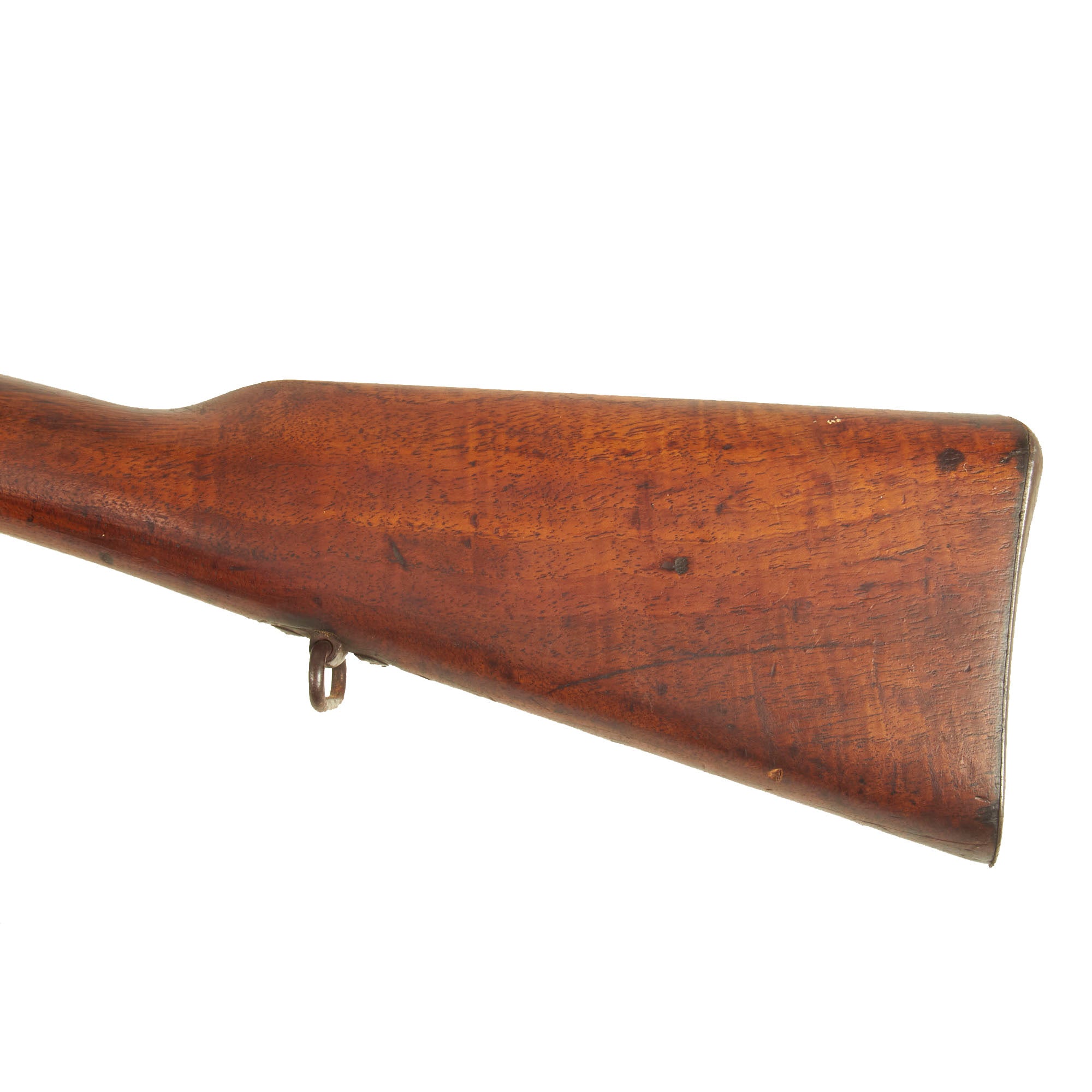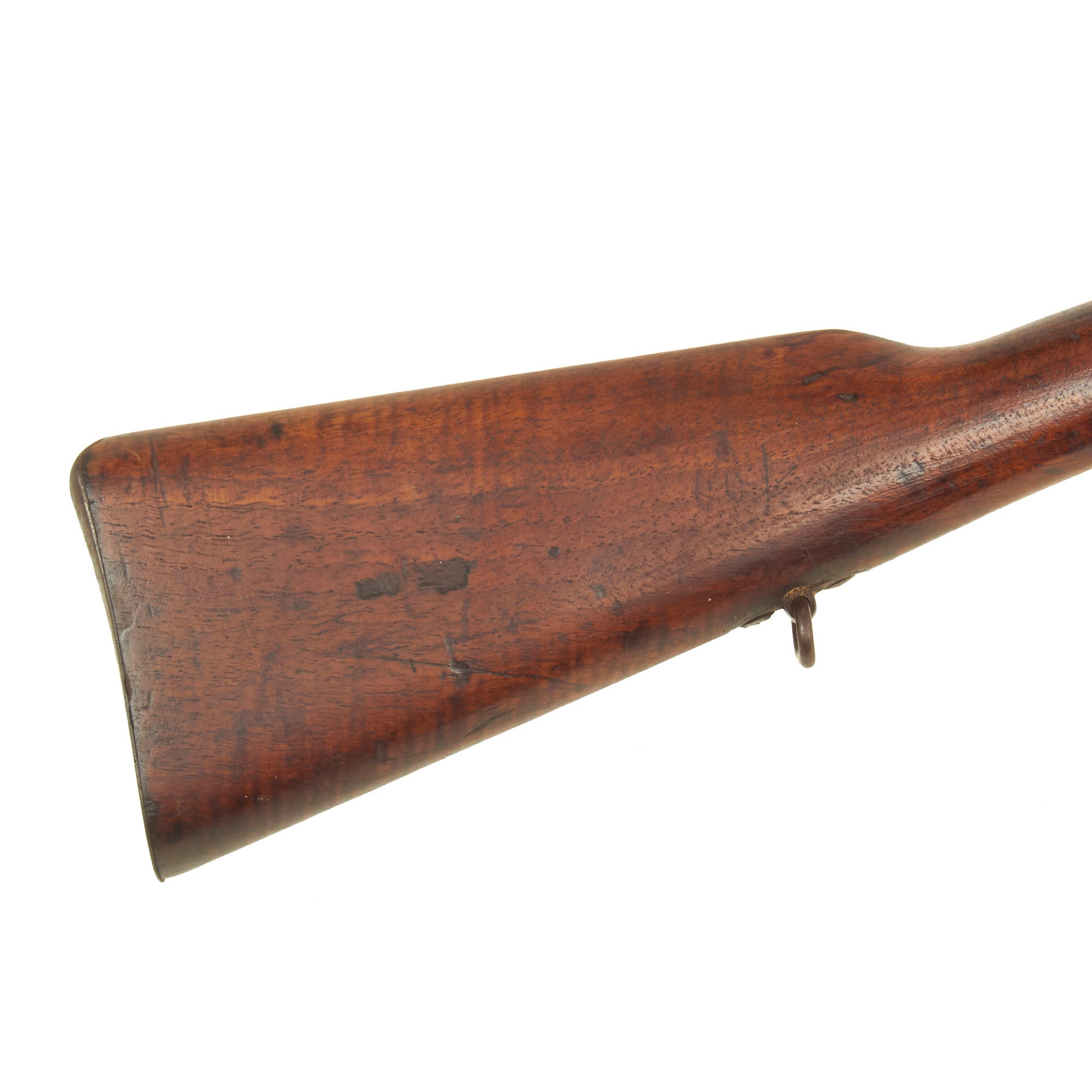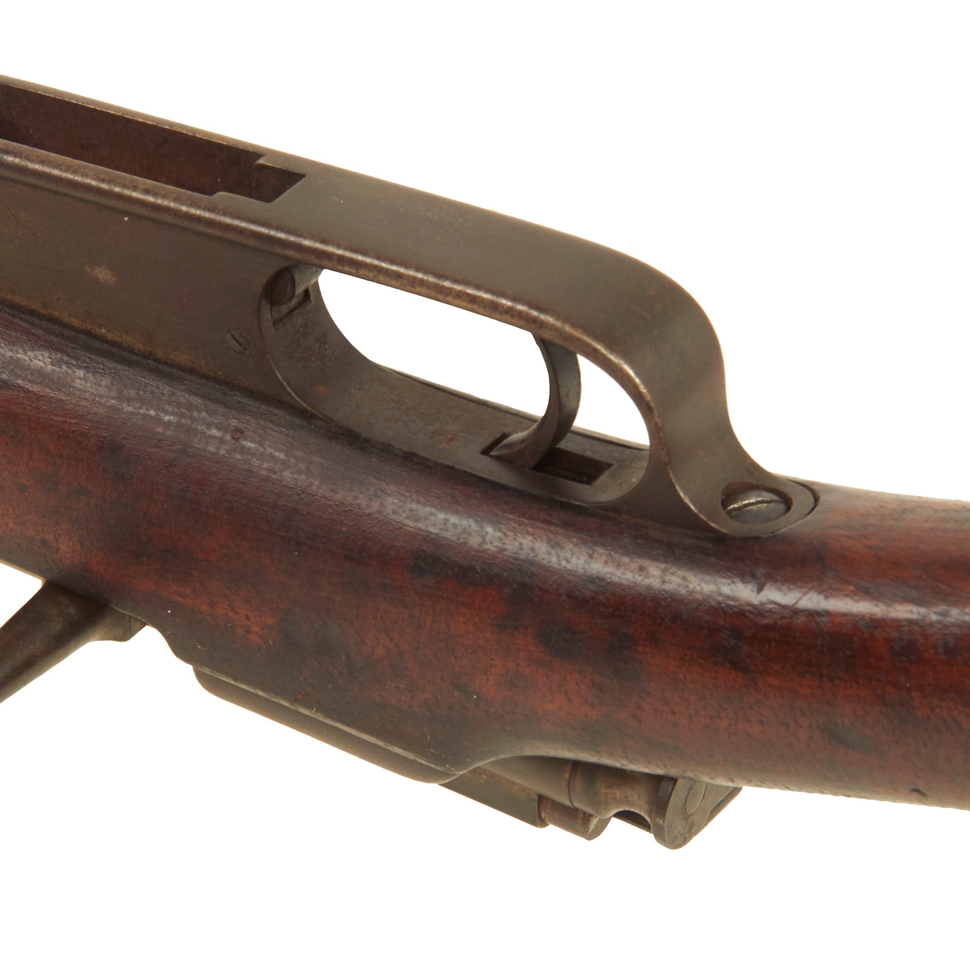 The rifle still bears one original German regimental designation, stamped on the upper barrel band / nose cap: 4. G. R. 10. 217.. This indicates issue to the Königin Augusta Garde-Grenadier-Regiment Nr. 4., 10th Company, 217th Weapon. Also known as the 4th (Queen Augusta) Guards Grenadiers, this unit was first raised 5 May 1860 and was garrisoned in Berlin. Given the condition of the rifle, we assume it was put back into service during WWI and we would imagine that this rifle also saw training use with the Guard Corps, and was never in line to send overseas. That also explains the wear on the rifle, which definitely saw long active service.