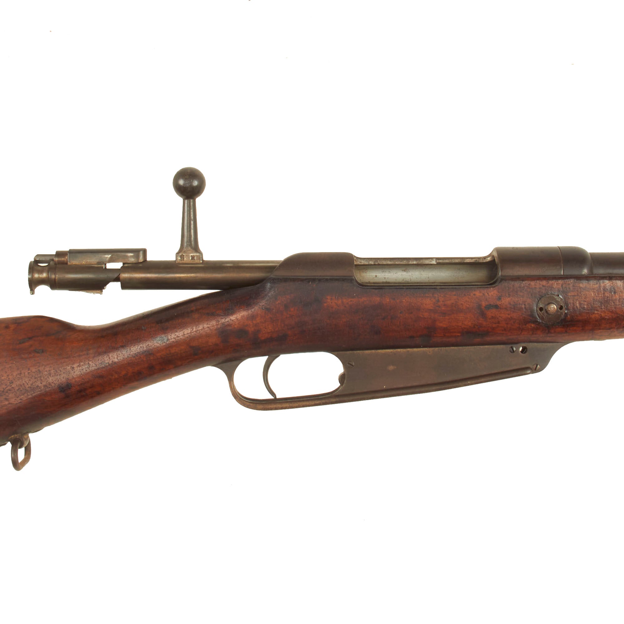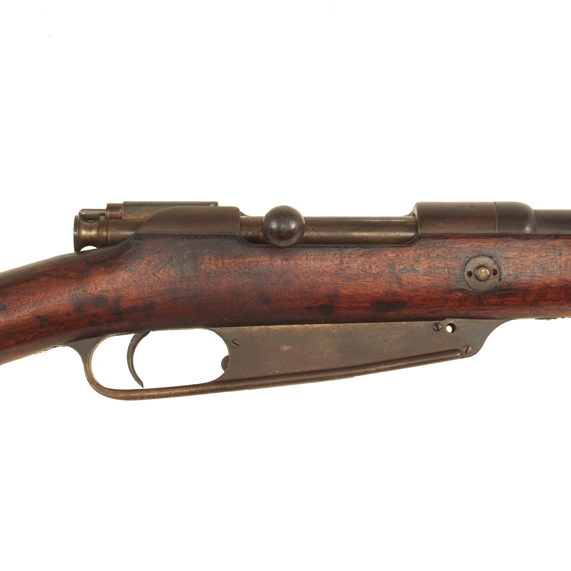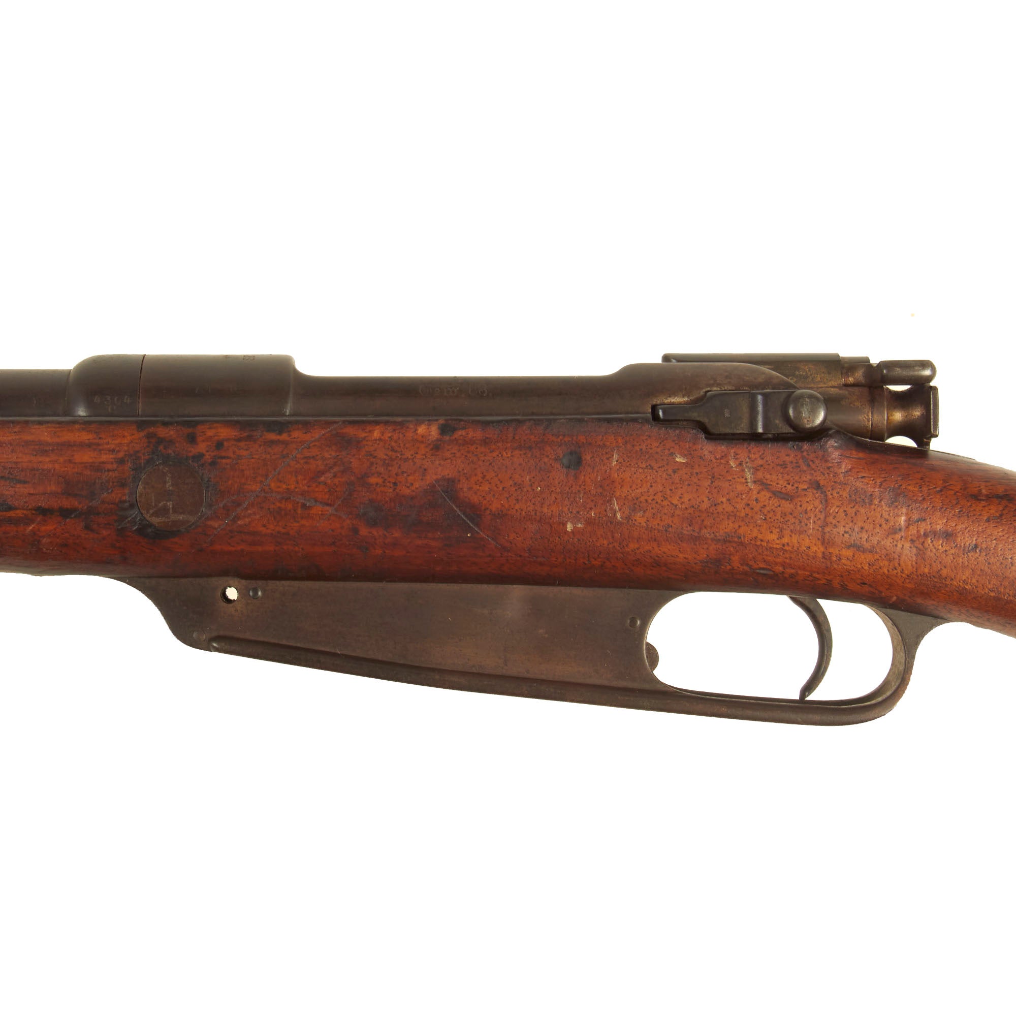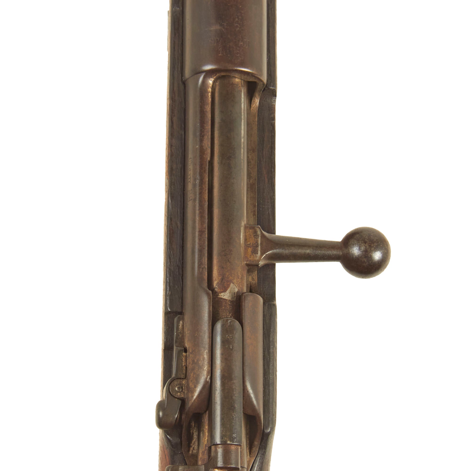The right side of the receiver is correctly marked Gew. 88 in German blackface type and also has serial number 4304 / c on the barrel jacket, while the receiver marking is worn away. The other parts are all unmatching, typical for a rifle that was serviced serviced at a regimental arsenal over the years. Over the chamber it is marked faintly with CROWN / SPANDAU / 1895, for manufacture by the Imperial Arsenal in Spandau.