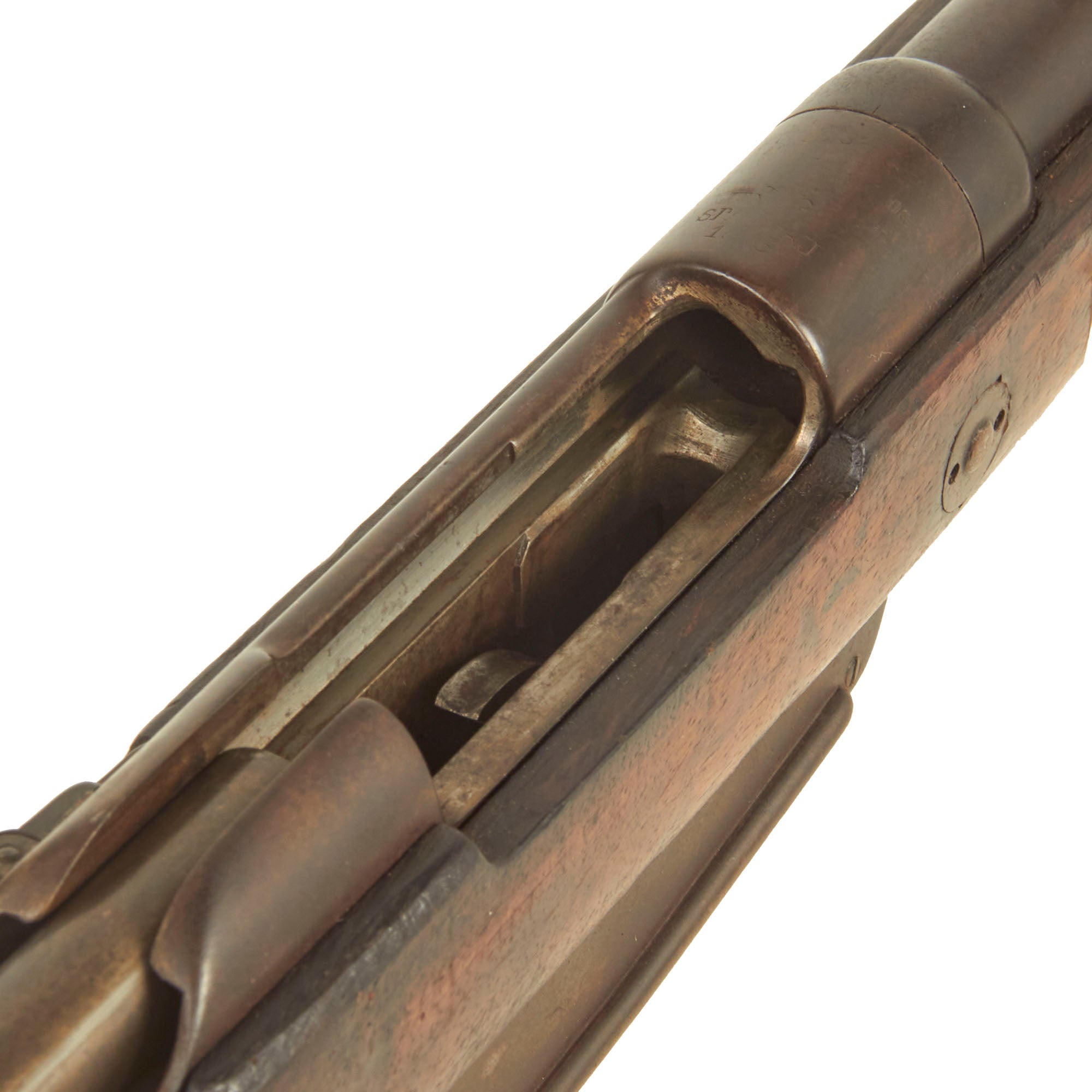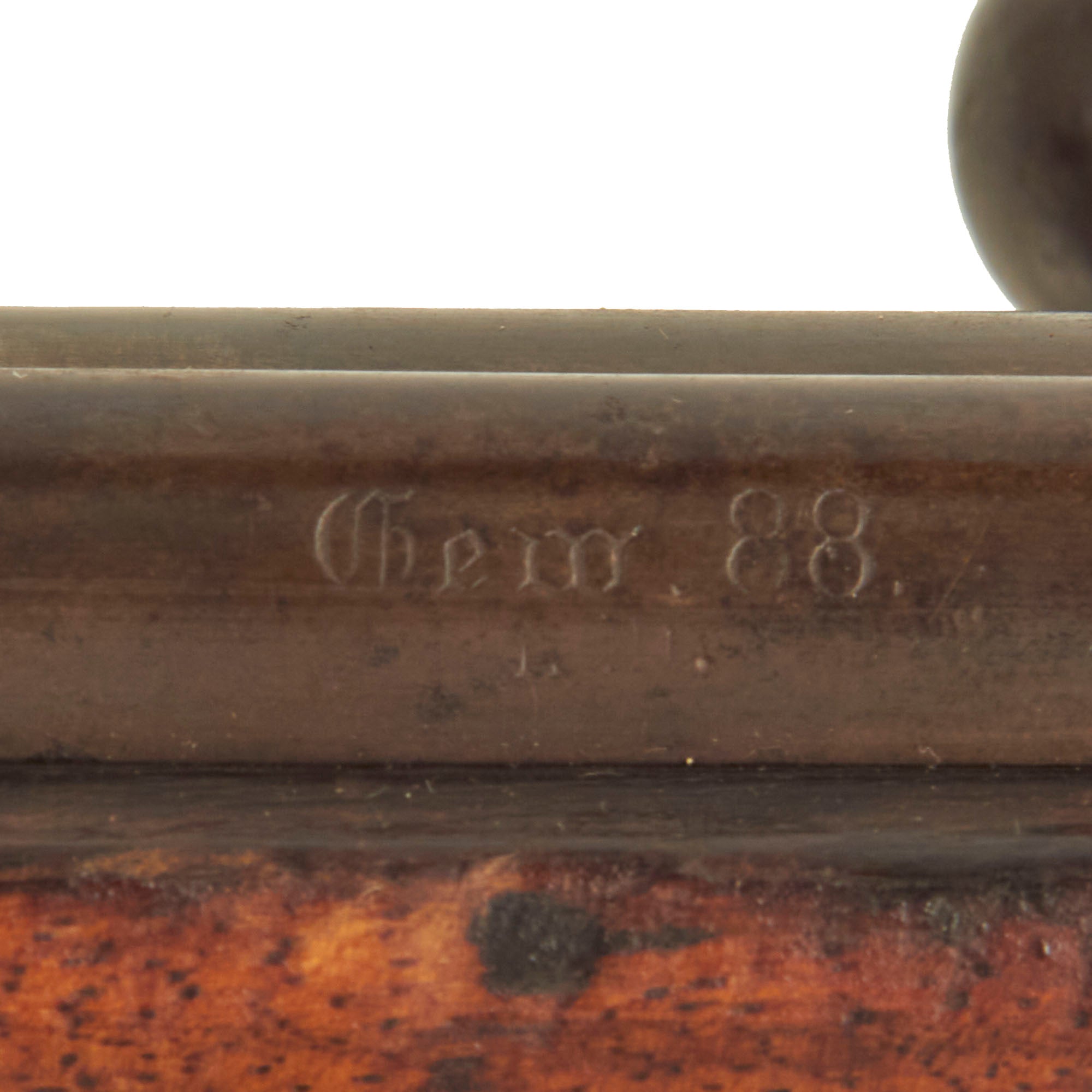 These rifles were originally chambered for 7.92mm Patrone 88 ammunition and had a fixed magazine. As with virtually all Gewehr 88 rifles in service, this example was converted to take the 7.92×57mm Mauser S Patrone, and has an S stamped above the chamber, indicating the conversion. The Spitzer-shaped S Cartridge was ballistically superior to the M/88, however the chamber required modification to accept the thicker walled shell casing. This rifle has the "S", but not the notch at the front of the receiver, and it has no stripper clip guides, so it was not converted after 1905 for the clips. The design of the clips necessitated making a notch in the front receiver, so the cartridge tips would clear it.