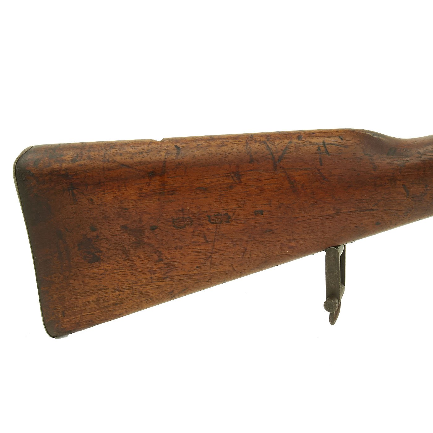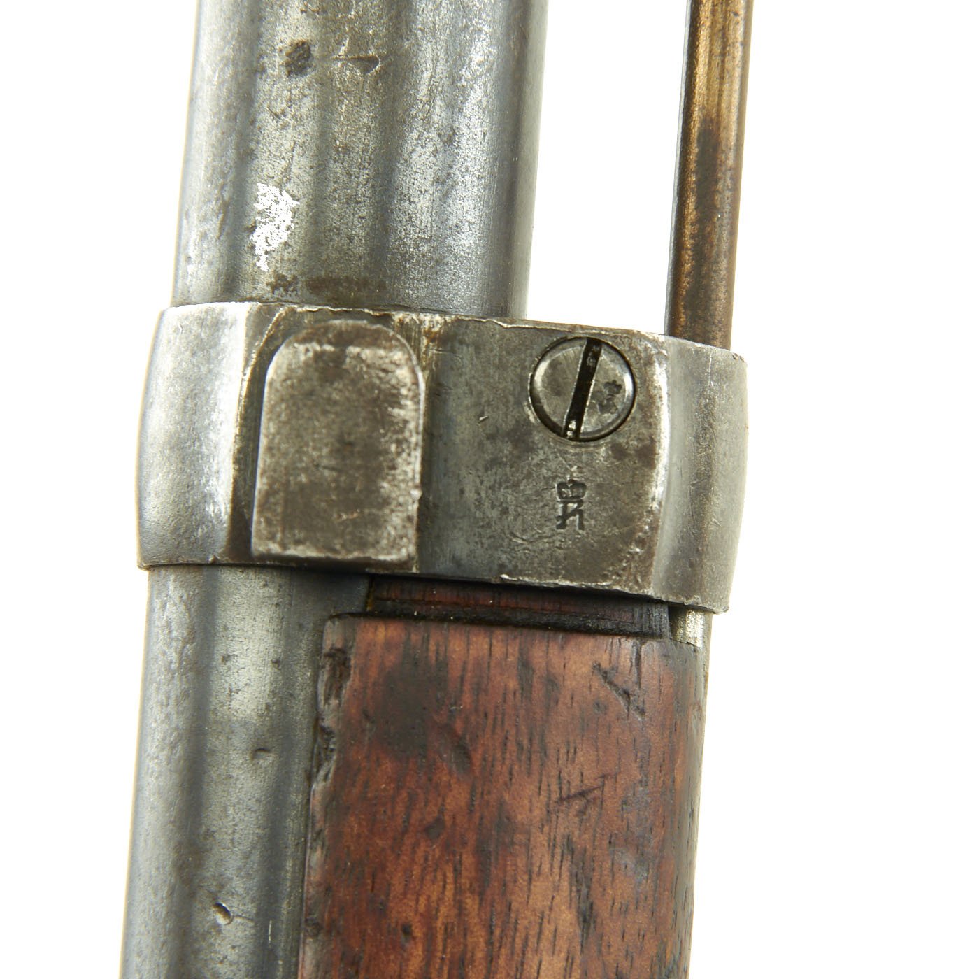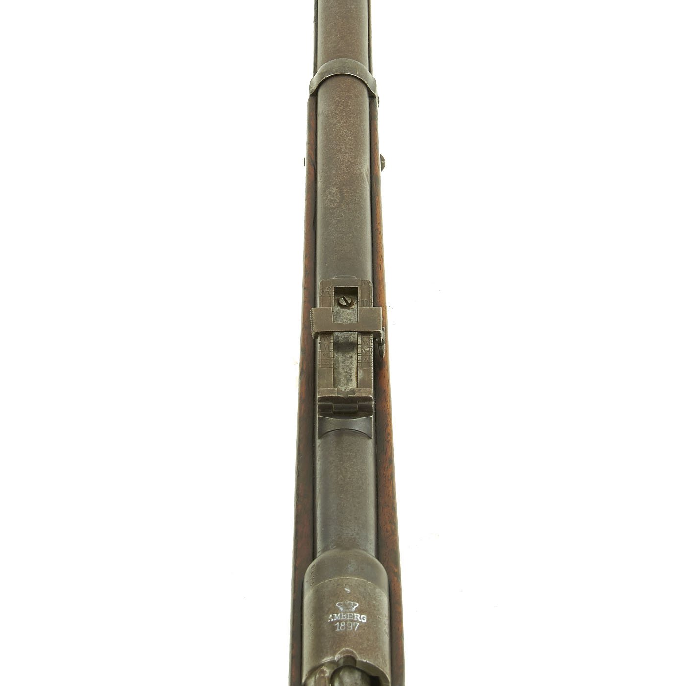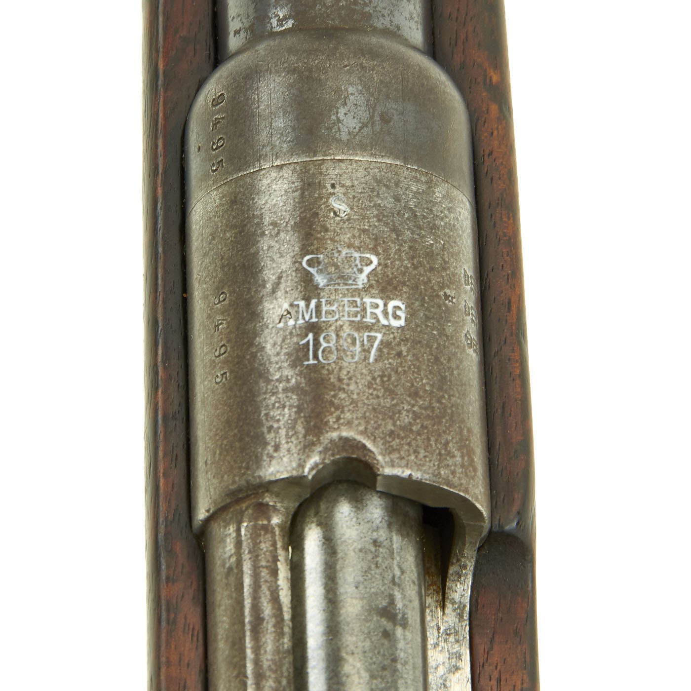 Original Item: Only one Available. This is a good example of the iconic German Gewehr 1888 "Commission Rifle", also known as the Gewehr 88, or GEW 88. It was manufactured at the Amberg Imperial Arsenal, located in Amberg, Bavaria, and then and then saw long service, as indicated by the large number of different markings on the gun. There were German regimental markings on the lower band, but they have been stamped out so they are no longer legible.