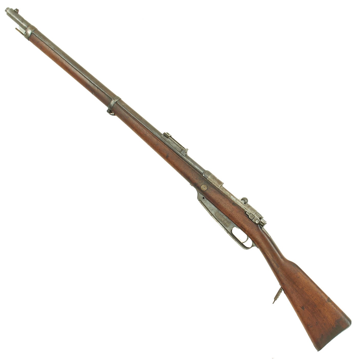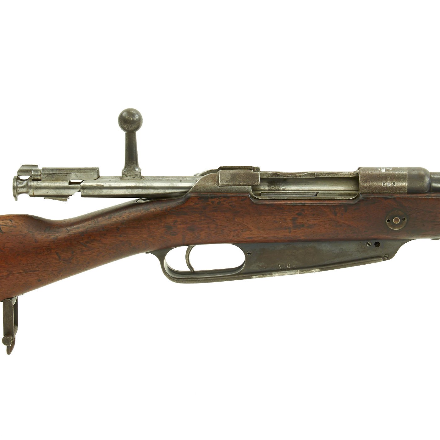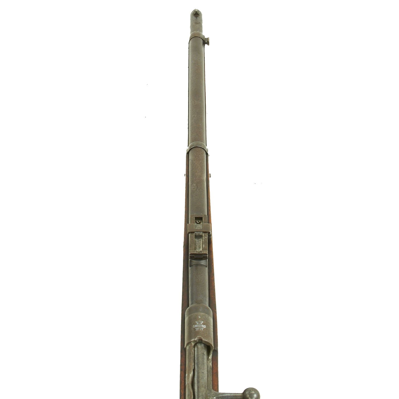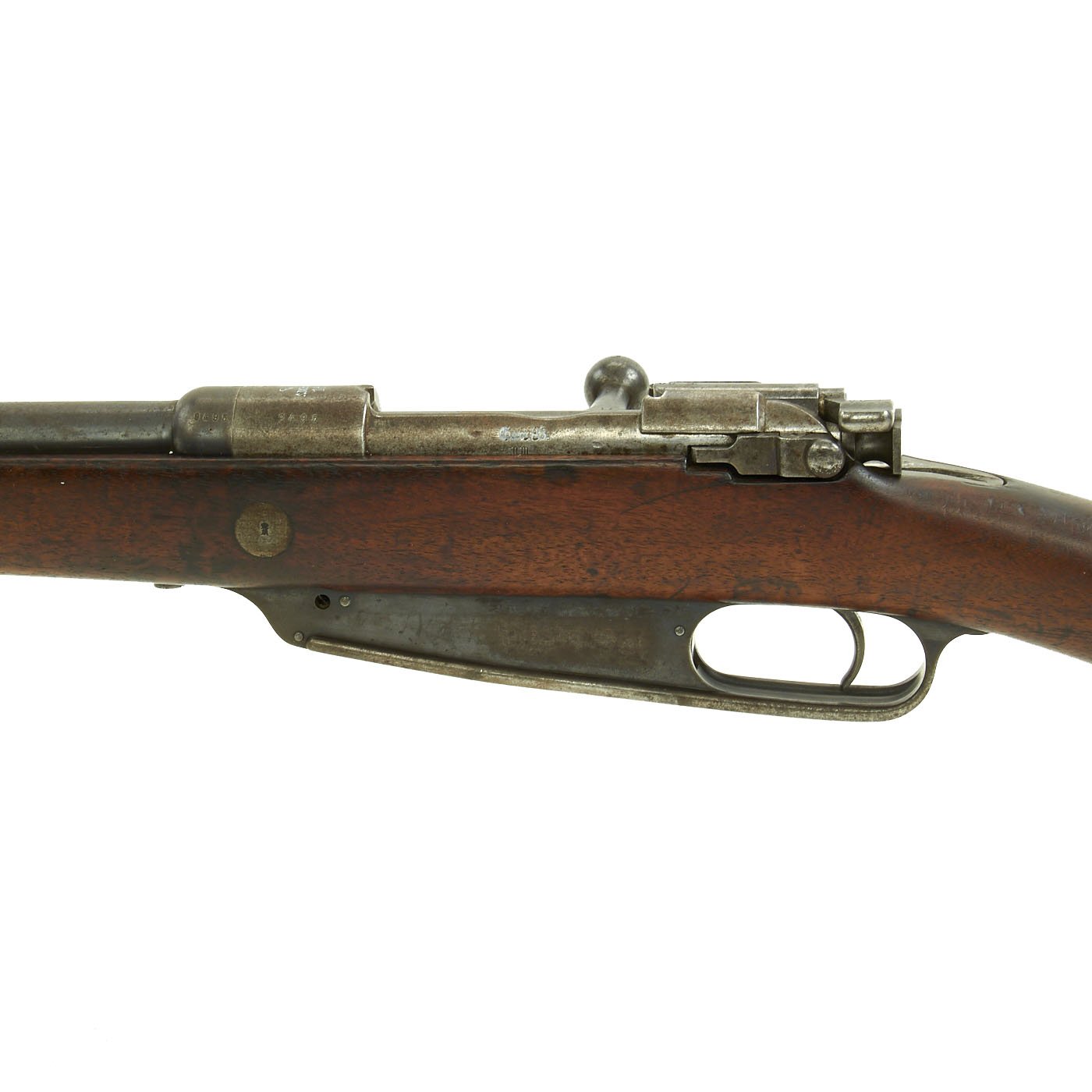 Original Item: Only one Available. This is a good example of the iconic German Gewehr 1888 "Commission Rifle", also known as the Gewehr 88, or GEW 88. It was manufactured at the Amberg Imperial Arsenal, located in Amberg, Bavaria, and then and then saw long service, as indicated by the large number of different markings on the gun. There were German regimental markings on the lower band, but they have been stamped out so they are no longer legible.