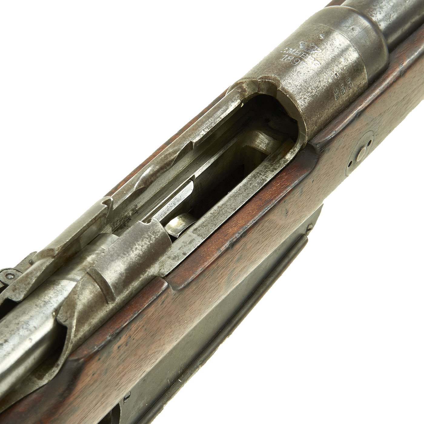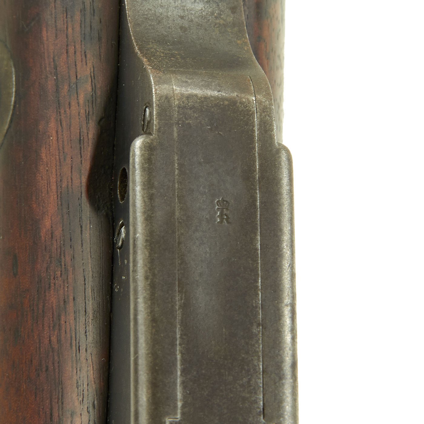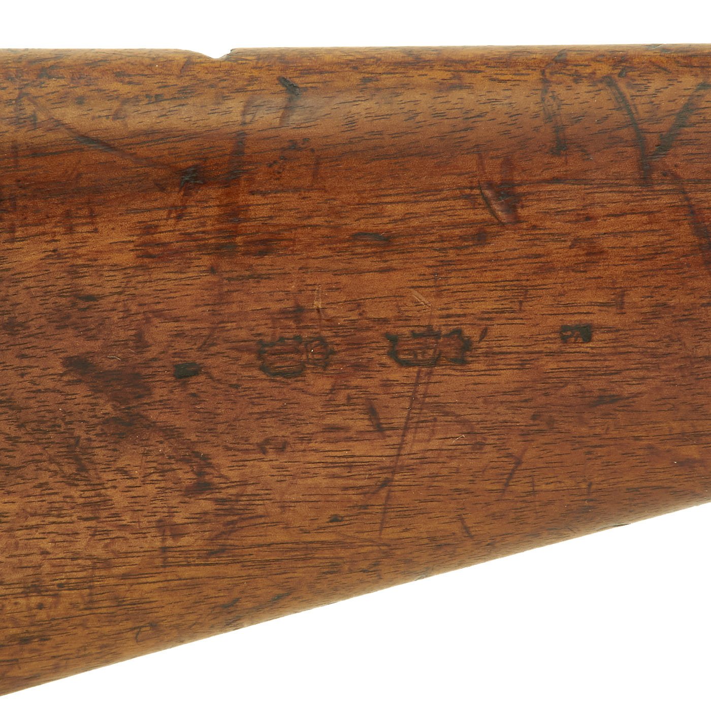 Rifle is in good used condition, with a good stock and metalwork which looks to still have some of the original blued finish on the barrel, with the receiver being bright steel. As the stock has has been sanded a bit, the proofs are partly worn away. There is a crack on the left side of the stock near the lower barrel band. It does have wear on the bolt bearing surfaces, however the bore is actually very nice. It has clear lands and grooves, with a bright finish and no real signs of oxidation. Tthe bolt extractor, which is easily lost during cleaning, is still present, though the rare double slot cleaning rod is unfortunately absent. The rifle cycles correctly, but there is a lot of grease inside the bolt, so the firing pin presents very slowly.