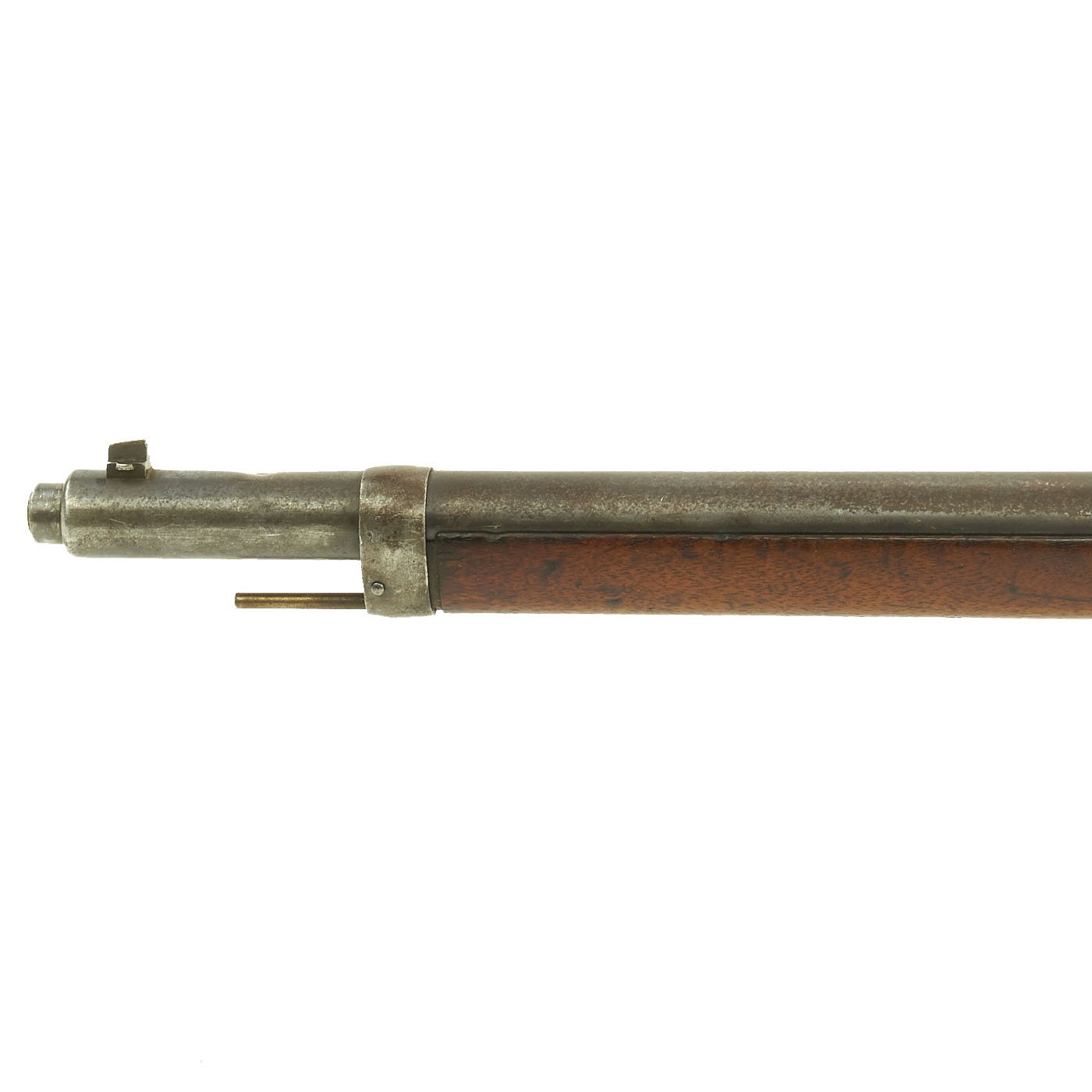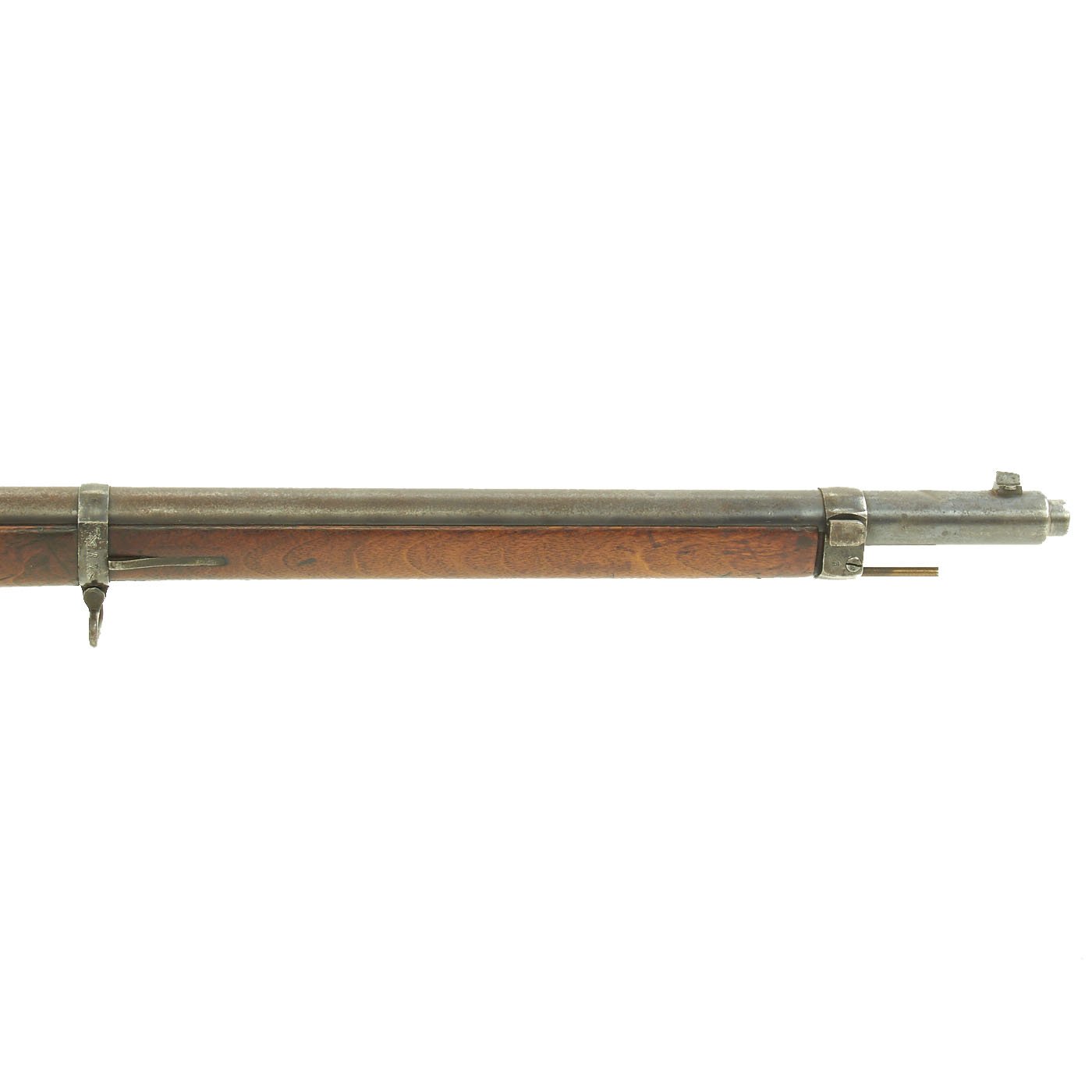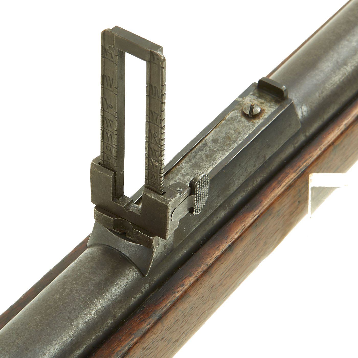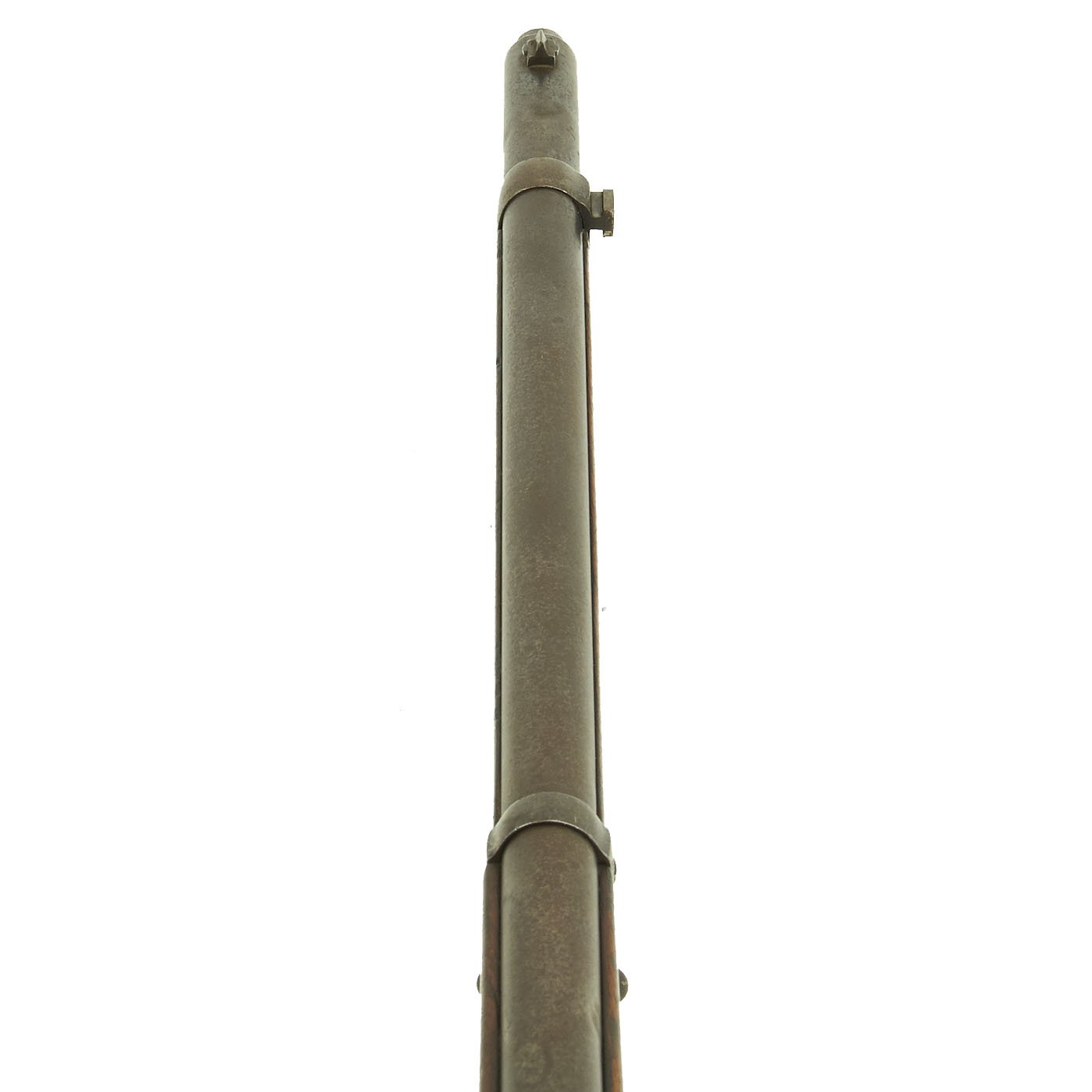 Rifle is in good used condition, with a good stock and metalwork which looks to still have some of the original blued finish on the barrel, with the receiver being bright steel. As the stock has has been sanded a bit, the proofs are partly worn away. There is a crack on the left side of the stock near the lower barrel band. It does have wear on the bolt bearing surfaces, however the bore is actually very nice. It has clear lands and grooves, with a bright finish and no real signs of oxidation. Tthe bolt extractor, which is easily lost during cleaning, is still present, though the rare double slot cleaning rod is unfortunately absent. The rifle cycles correctly, but there is a lot of grease inside the bolt, so the firing pin presents very slowly.