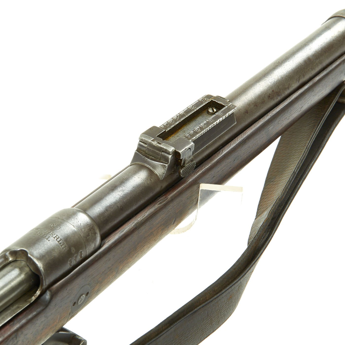 Fitted to the rifle is a very nice original German rifle sling, the type used on the Gewehr 88 and later Mauser Gewehr 98. It still has the correct parade loop, and is in really good shape, with lots of original cross hatching present. There is even an extra sling end clip attached to the front of the trigger guard.