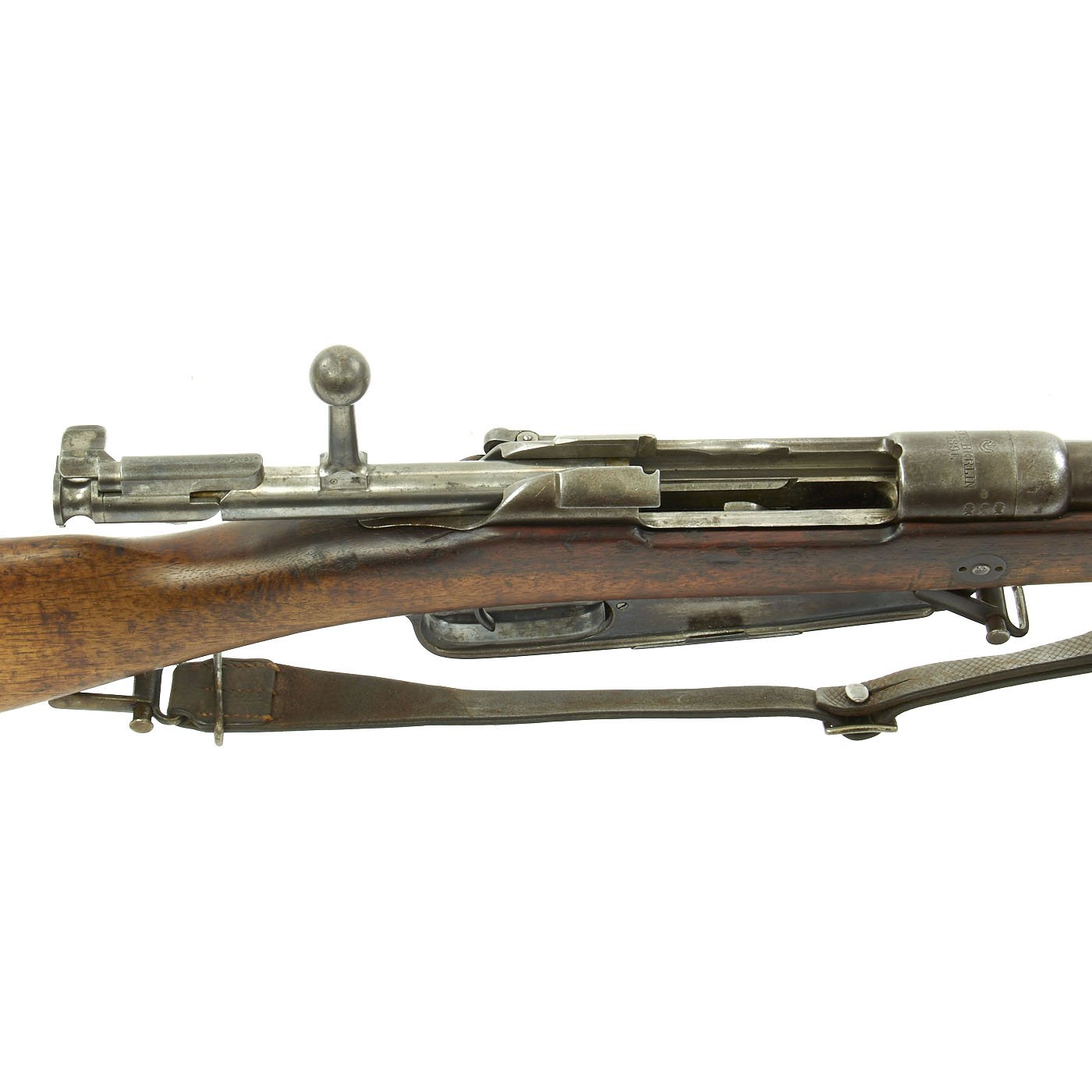 These rifles were originally chambered for 7.92mm Patrone 88 ammunition and had a fixed magazine. As with virtually all Gewehr 88 rifles in service, this example was converted to take the 7.92×57mm Mauser S Patrone, and has an S stamped above the chamber, indicating the conversion. The Spitzer-shaped S Cartridge was ballistically superior to the M/88, however the chamber required modification to accept the thicker walled shell casing. This particular rifle does has notched plates welded to the rear of the receiver on either side to accept the 1905 pattern stripper clips, making this a Gewehr 88/05 S. It also has the tell tale "notch" cut into the rear of the receiver, as the loaded clip would run into this area. It is faintly marked and dated 1914 on the magazine floor plate, indicating the year it was converted to a 88/05 S.