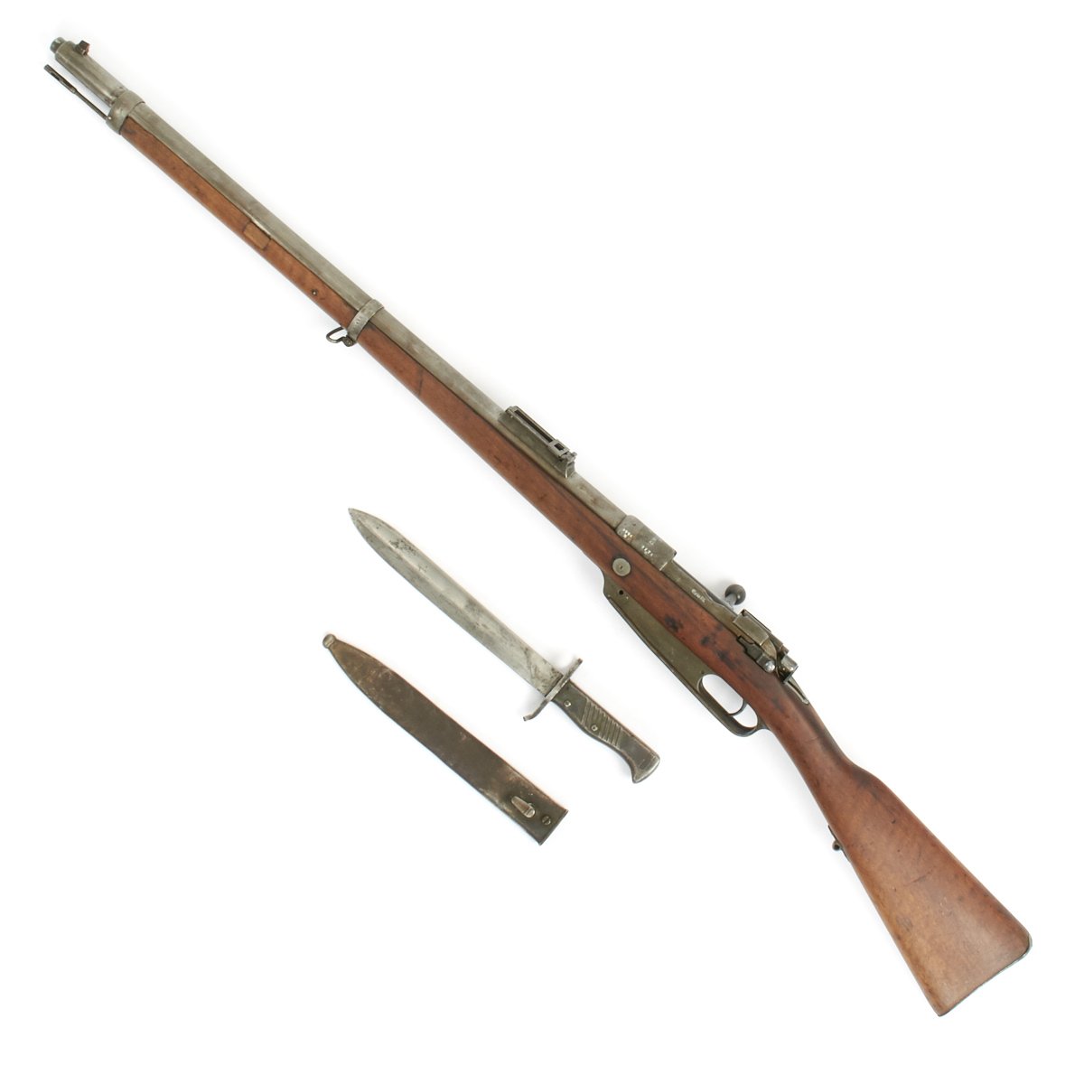 An absolutely genuine GERMAN contract M-1888 Service Rifle with cut-down Ersatz Butcher Bayonet and scabbard issued to a German Infantry Regiment in 1896 and subsequently shipped as Military Aid to Turkey during or before World War One. This possibly saw service on TWO fronts of the Great War. Fully cleaned and ready to display.