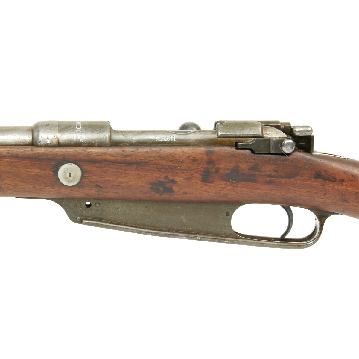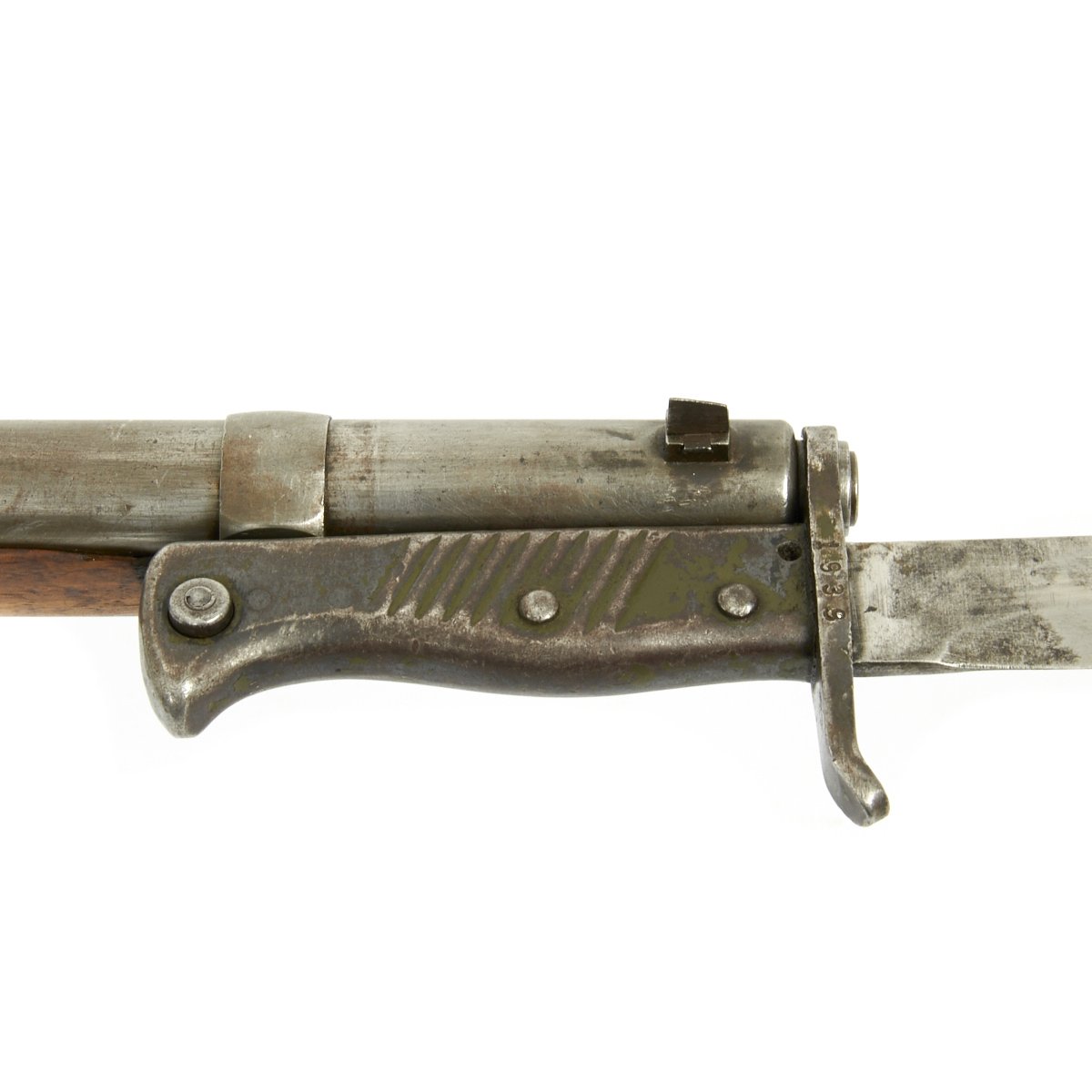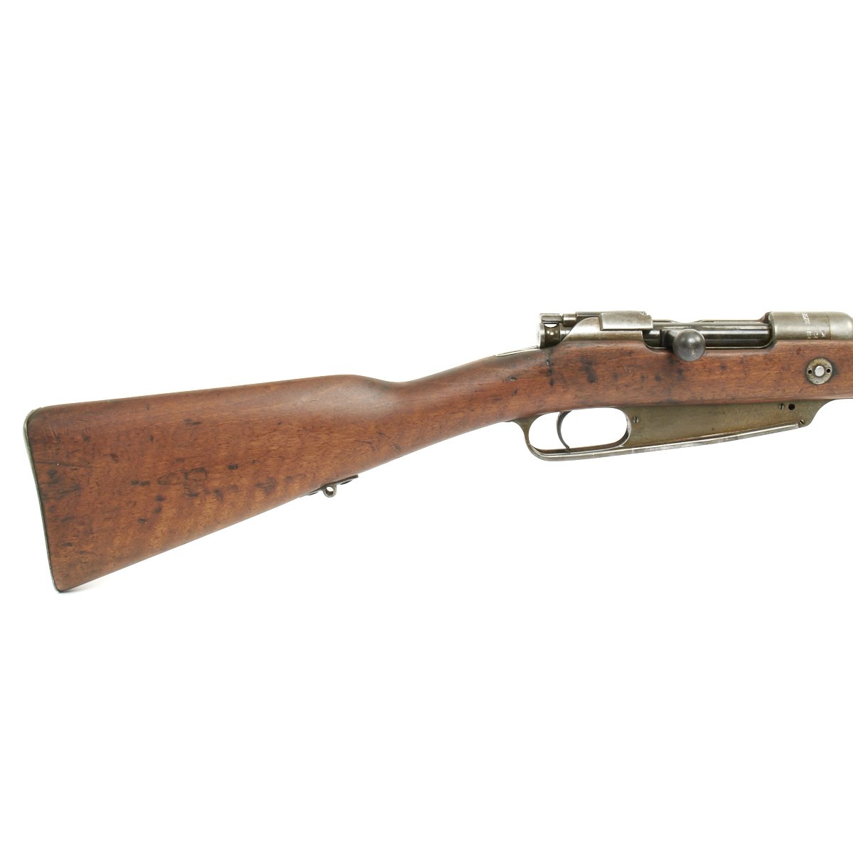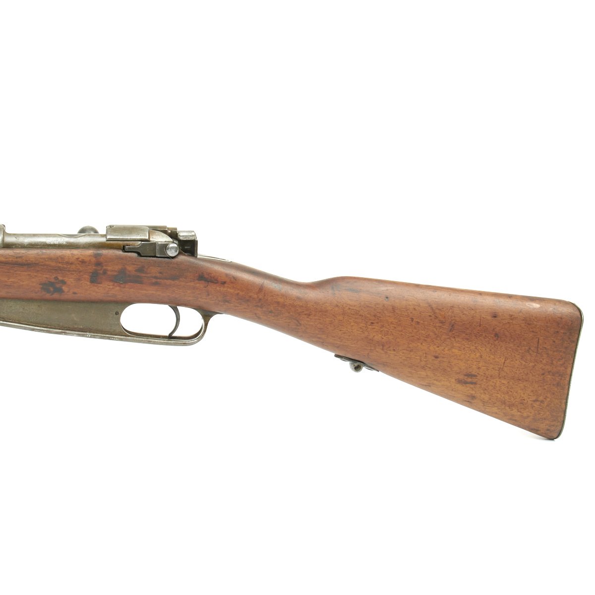 Rifle is in good used condition, with a solid stock and metalwork with a nice gray patina. The clip on floor plate for the magazine has also been removed. There have been some minor repairs to the stock It does have wear on the bolt bearing surfaces, and the bore shows clear lands and grooves, and is mostly bright, with a small amount of darkening. The rear sling swivel has also been replaced with a Mauser GEW 98 style fitting.