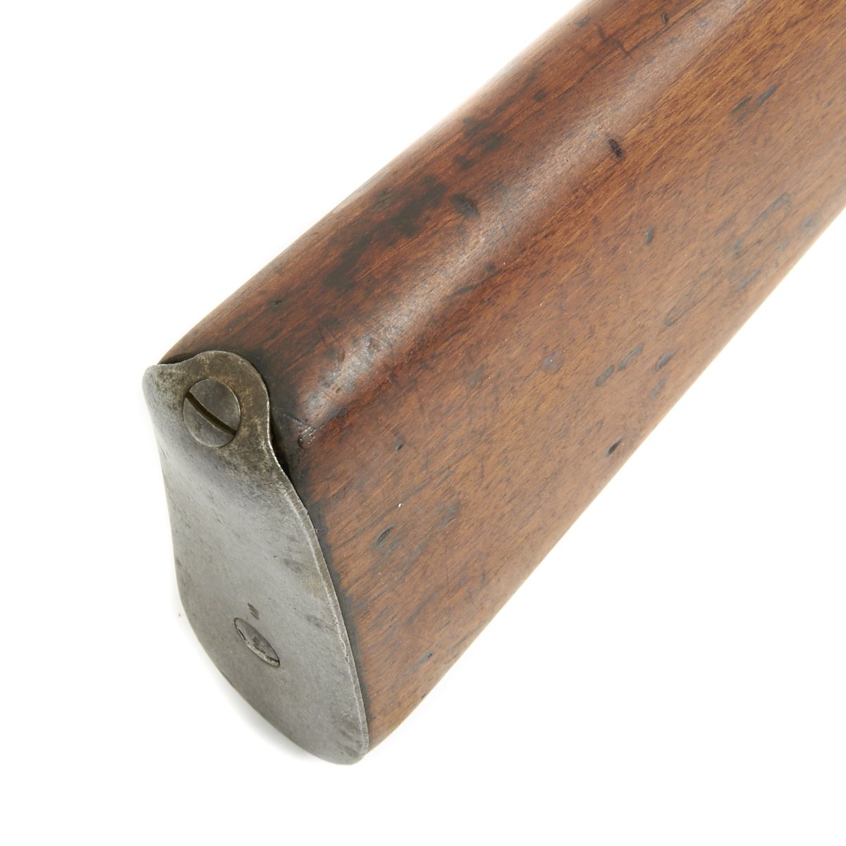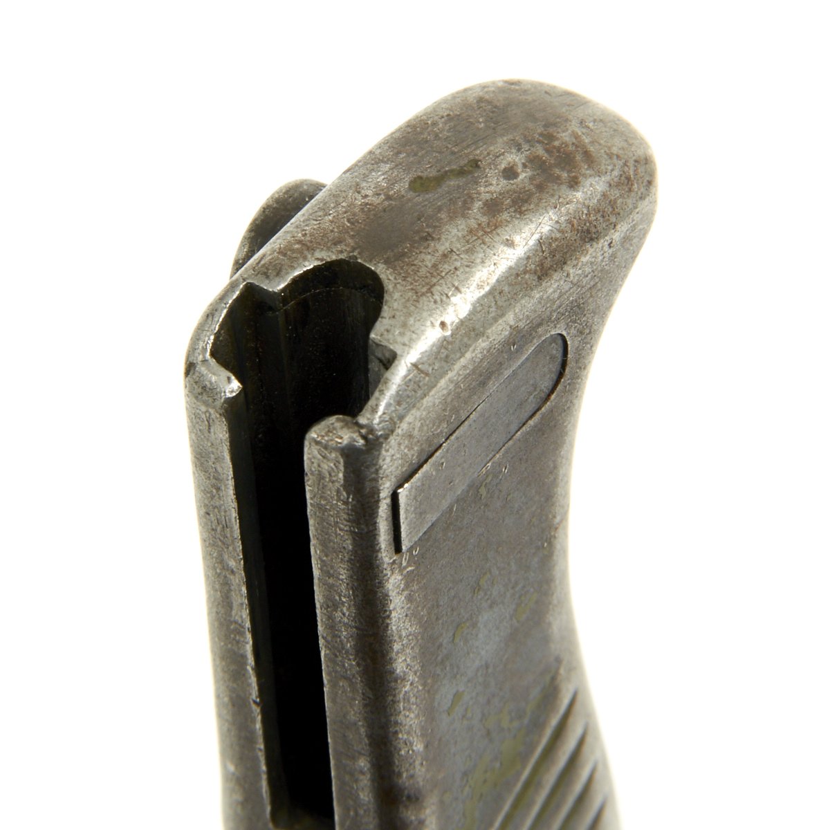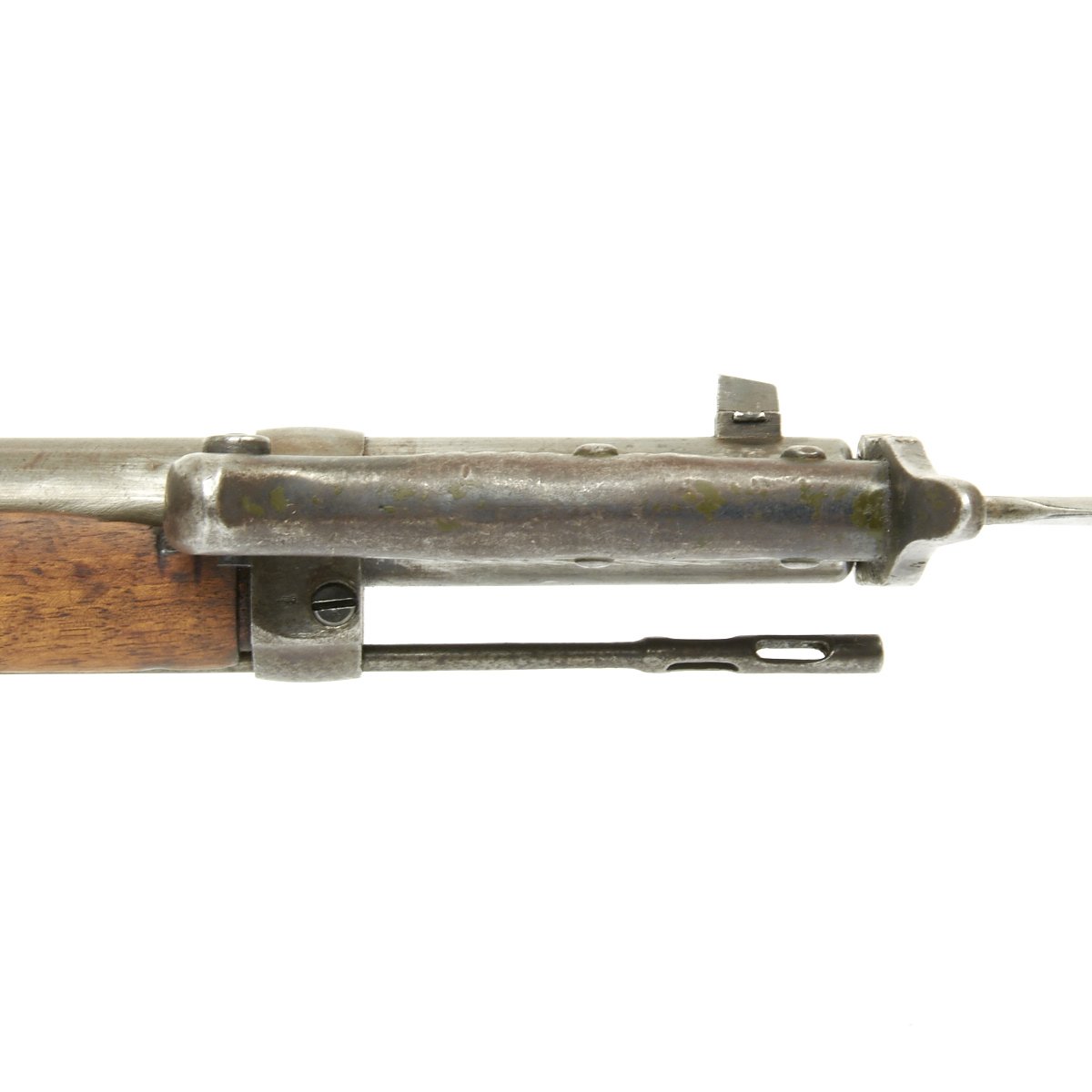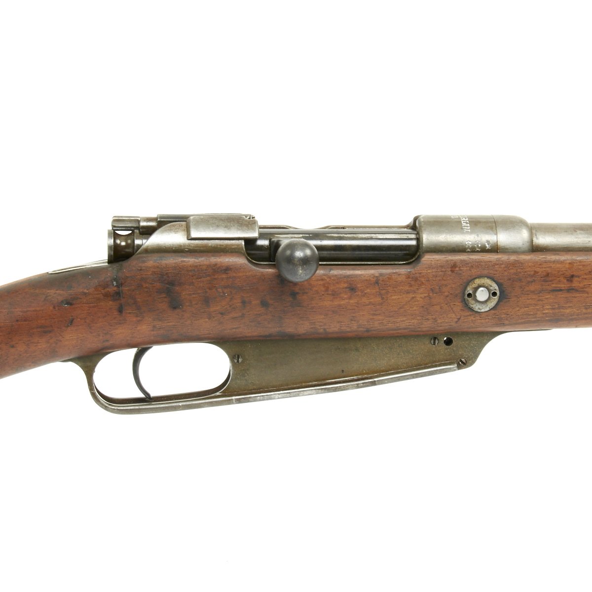 Rifle is in good used condition, with a solid stock and metalwork with a nice gray patina. The clip on floor plate for the magazine has also been removed. There have been some minor repairs to the stock It does have wear on the bolt bearing surfaces, and the bore shows clear lands and grooves, and is mostly bright, with a small amount of darkening. The rear sling swivel has also been replaced with a Mauser GEW 98 style fitting.