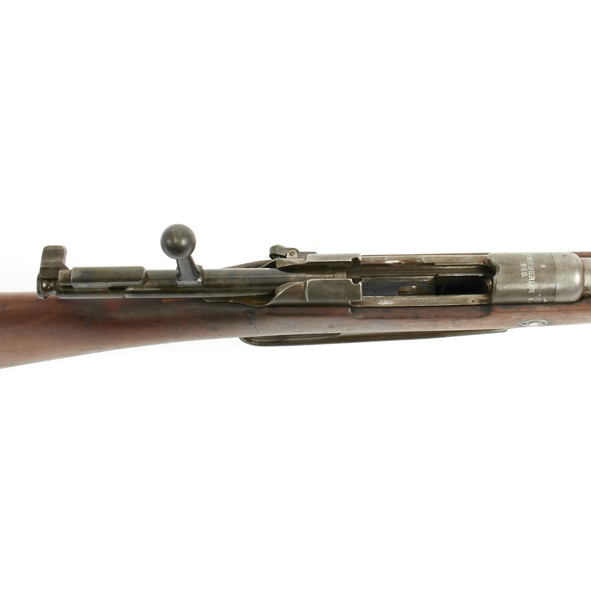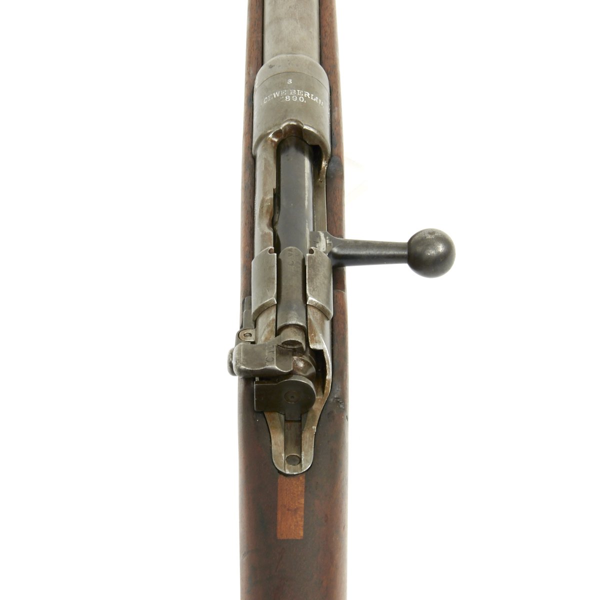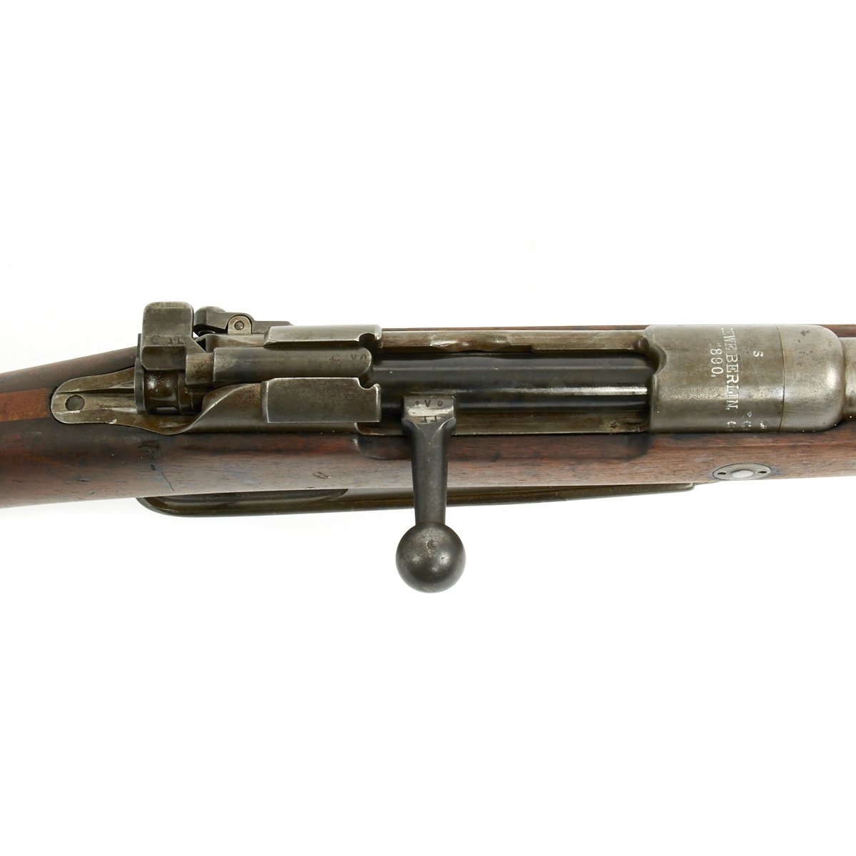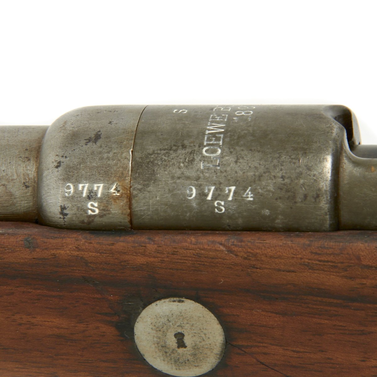 It even retains its very unusual correct M-1888 cleaning rod with double slots, which were often lost or broken over the years. The right side of the receiver is marked Gew. 88 in German blackface type and also has serial number 9774 / S on the barrel and receiver. Over the chamber it is marked LOEWE BERLIN / 1890. However in addition this rifle was then shipped to Germany's World War One Ally TURKEY, who stamped a CRESCENT MOON the bolt components, which are also now numbered with Arabic script. The sight also had been converted to have Arabic script numerals