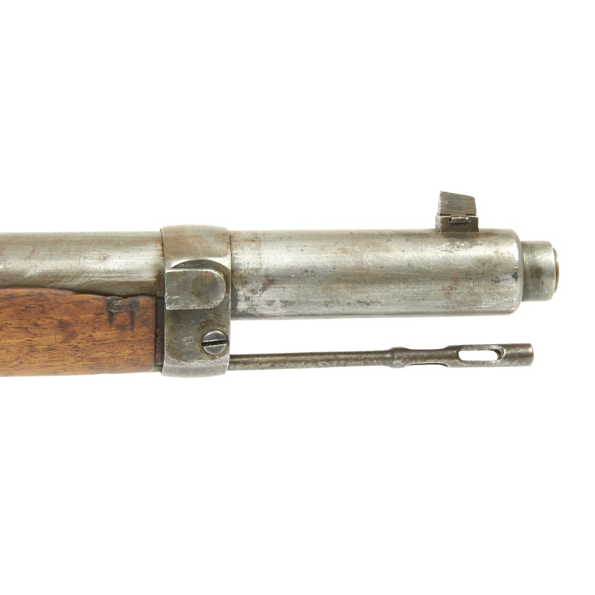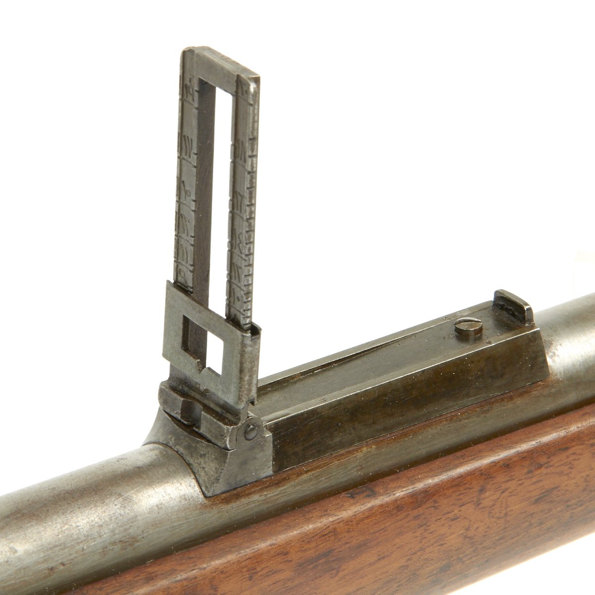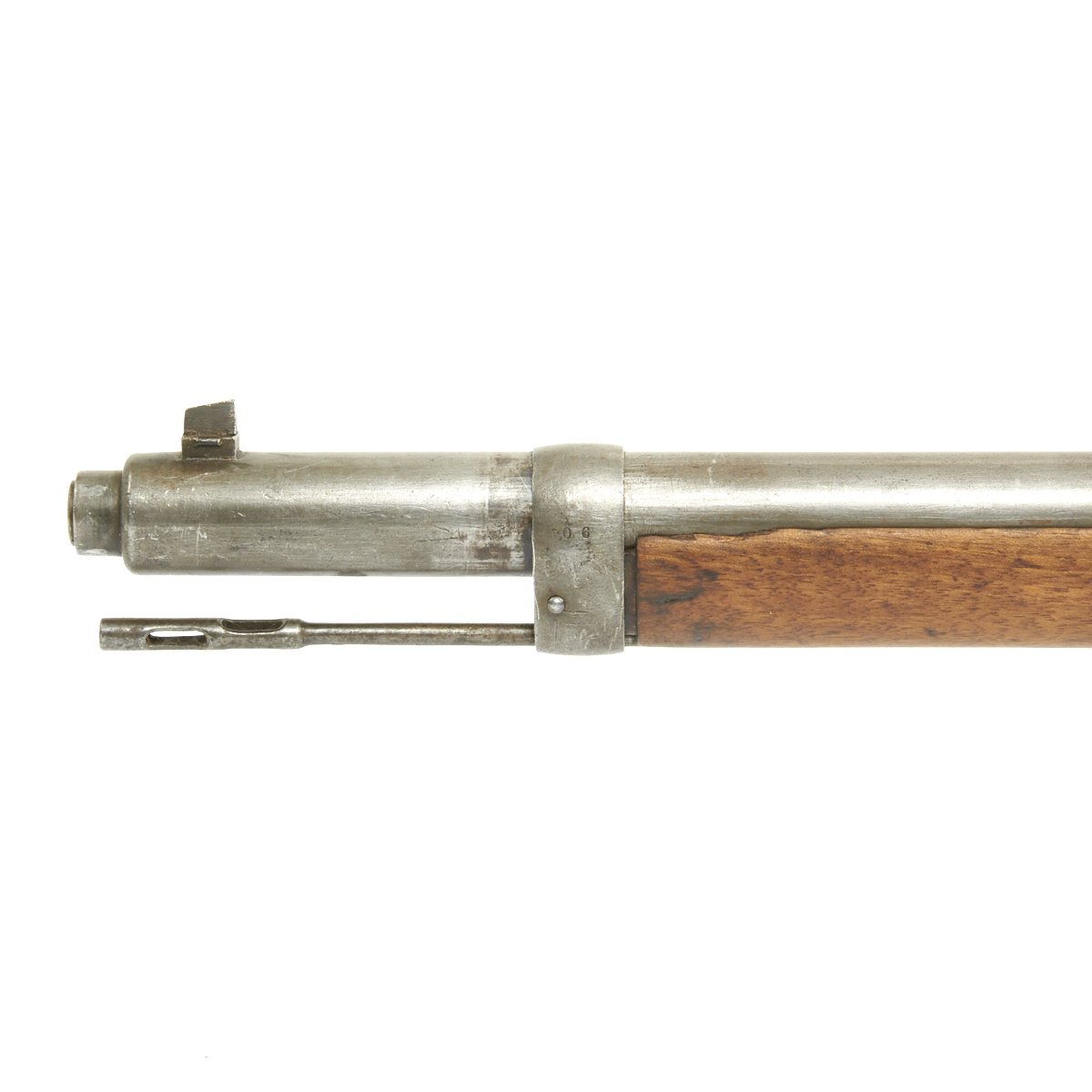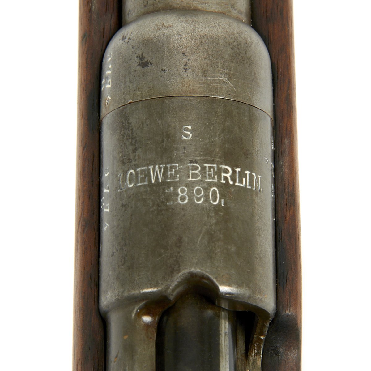 It even retains its very unusual correct M-1888 cleaning rod with double slots, which were often lost or broken over the years. The right side of the receiver is marked Gew. 88 in German blackface type and also has serial number 9774 / S on the barrel and receiver. Over the chamber it is marked LOEWE BERLIN / 1890. However in addition this rifle was then shipped to Germany's World War One Ally TURKEY, who stamped a CRESCENT MOON the bolt components, which are also now numbered with Arabic script. The sight also had been converted to have Arabic script numerals