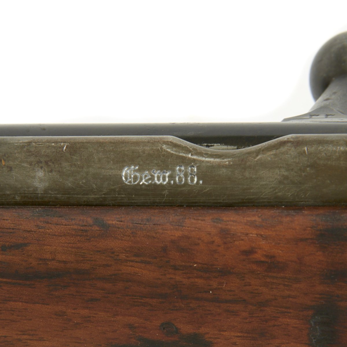These rifles were originally chambered for 7.92mm Patrone 88 ammunition and had a fixed magazine. As with virtually all Gewehr 88 rifles in service, this example has the the tell tale "notch" cut into the rear of the receiver ring to accept the slightly longer spitzer-type S Patrone cartridge. This indicates that it was converted to take the 7.92×57mm Mauser S Patrone, and has an S stamped above the chamber, indicating the conversion. The Spitzer-shaped S Cartridge was ballistically superior to the M/88, however the chamber required modification to accept the thicker walled shell casing. This particular rifle does also has notched plates welded to the rear of the receiver on either side to accept the 1905 pattern stripper clips, making this a Gewehr 88/05 S.