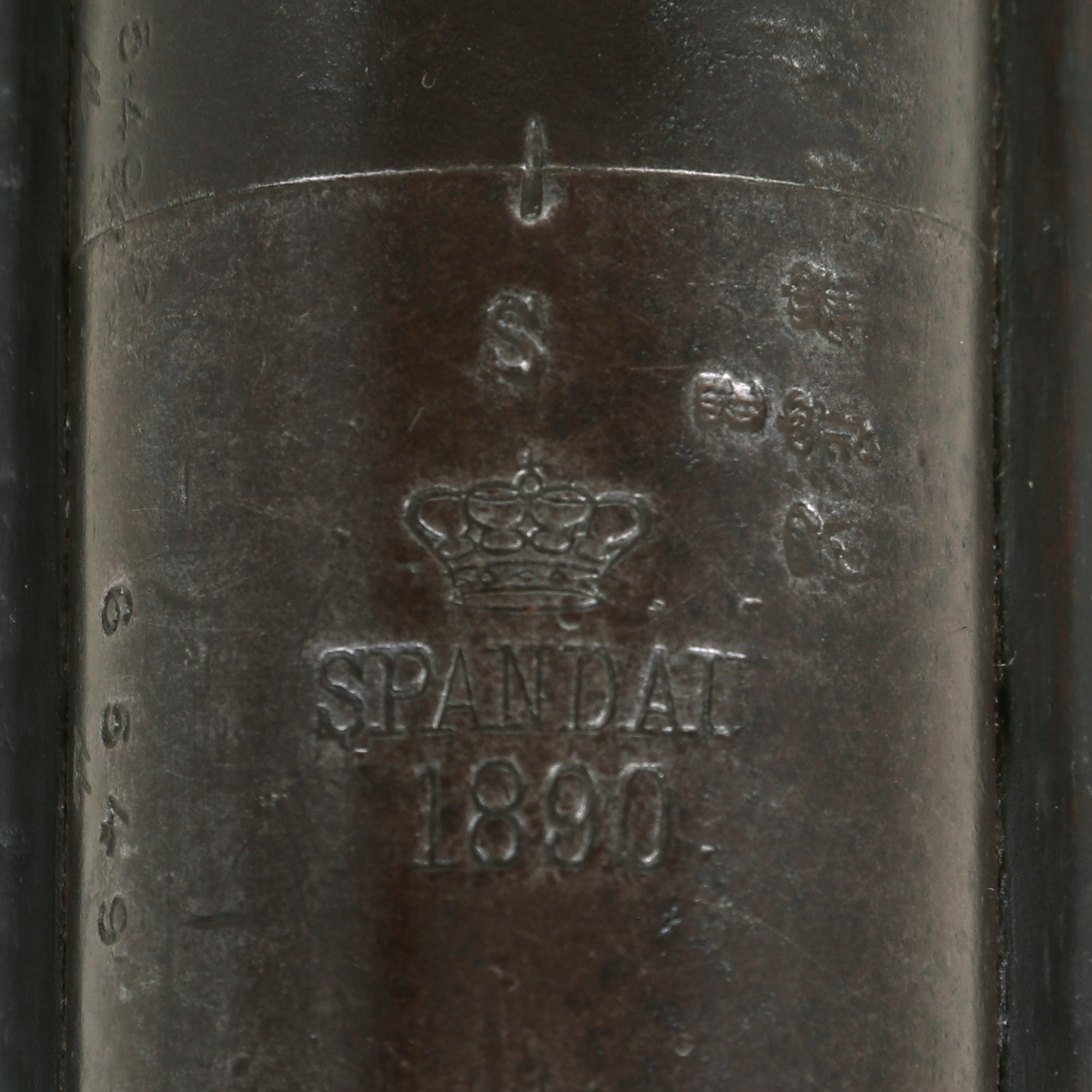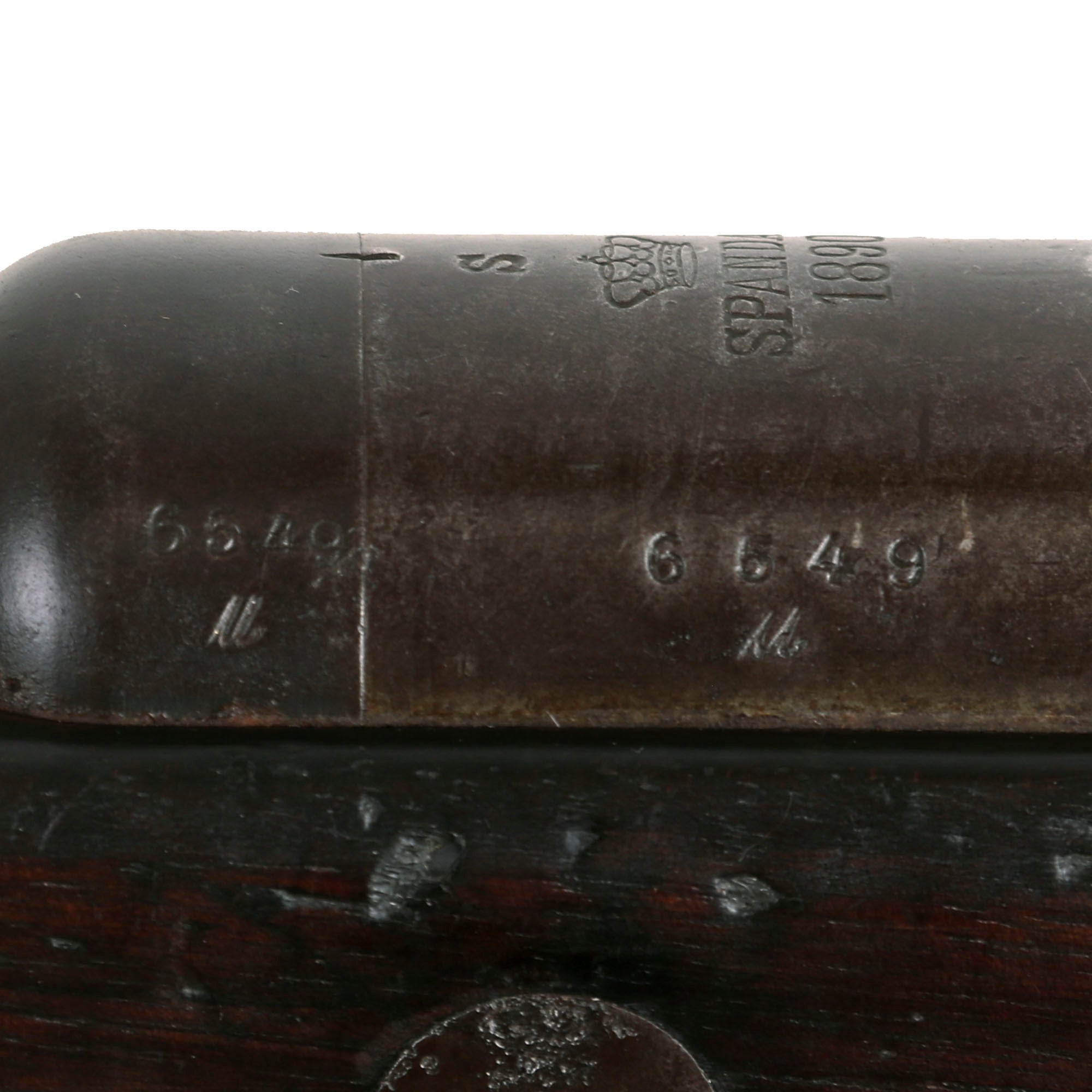 The right side of the receiver is marked Gew. 88 in German blackface type and also has serial number 6549 / u on the receiver, barrel jacket, and magazine housing. The bolt is non-matching, as they were easily swapped at arsenal, however the barrel bands and many of the other smaller components bear shortened number 49. Over the chamber it is clearly marked CROWN / SPANDAU / 1890, for manufacture by the Imperial Arsenal in Spandau. There are NO Turkish markings on this rifle, which is definitely a rarity. Virtually all of the 98/05 S converted rifles we have seen were sent to the Ottoman Empire as War Aid during the first world war.