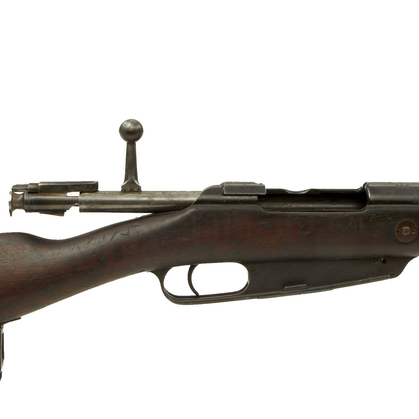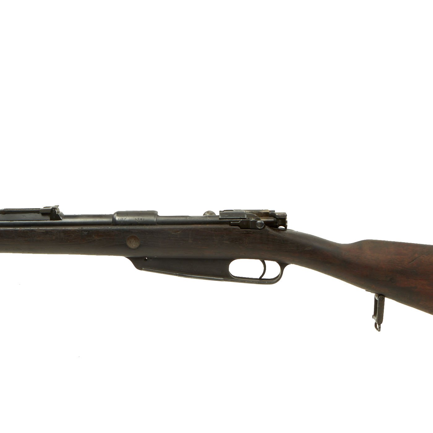 The right side of the receiver is marked Gew. 88. in German blackface type, partly removed by a notch in the receiver to help with the feed strip. The rifle bears serial numbers 4240 / f on the barrel and receiver, while the bolt, trigger guard, and other components all have different numbers, the hallmark of an arsenal refurbished rifle. his gun was definitely re-worked at arsenal before being issued for reserve use during WWI, and possibly earlier. Over the chamber it is clearly marked CROWN / SPANDAU / 1891, for manufacture by the Imperial Arsenal in Spandau. However in addition this rifle was then shipped to Germany's World War One Ally TURKEY, who stamped a CRESCENT MOON above the crown on the receiver.