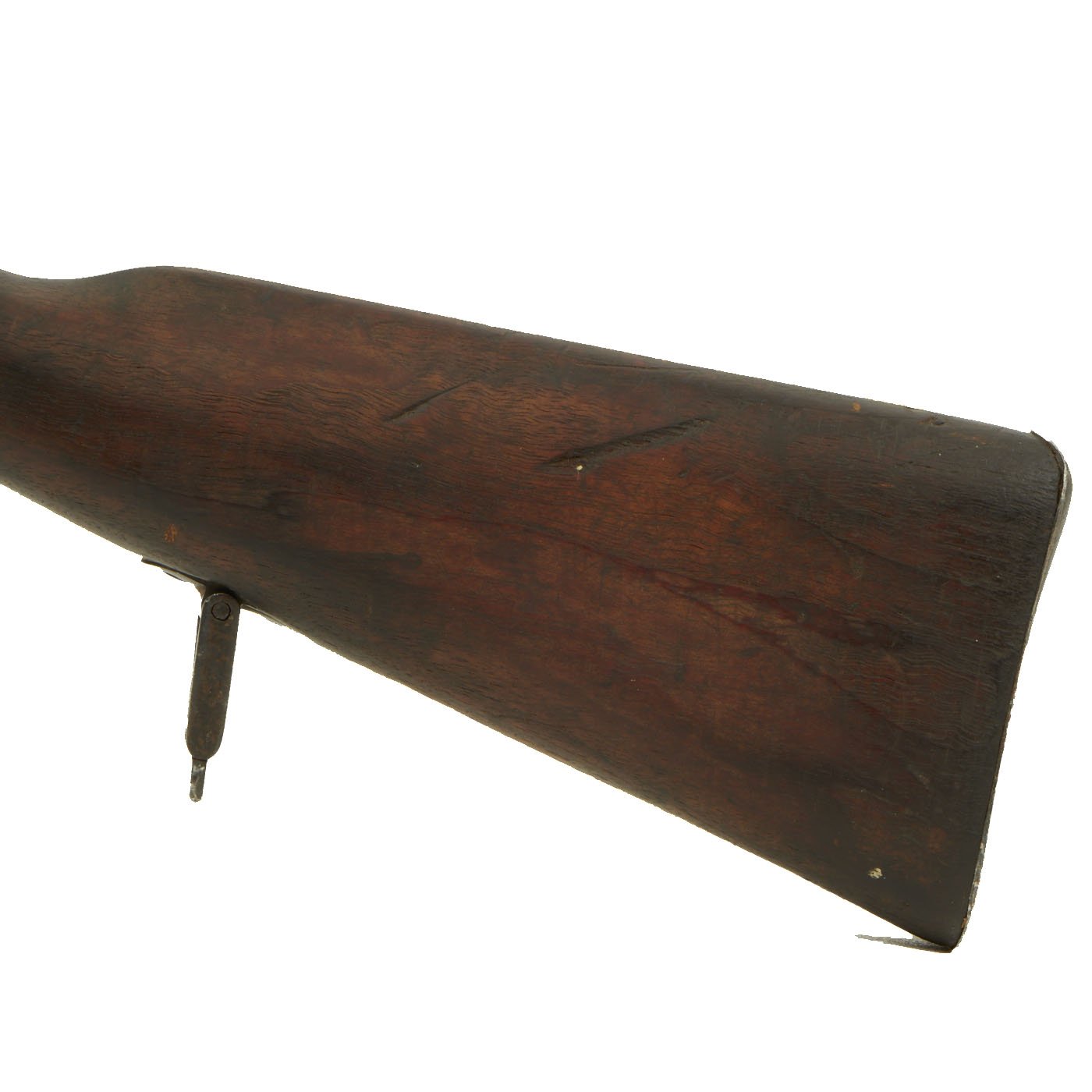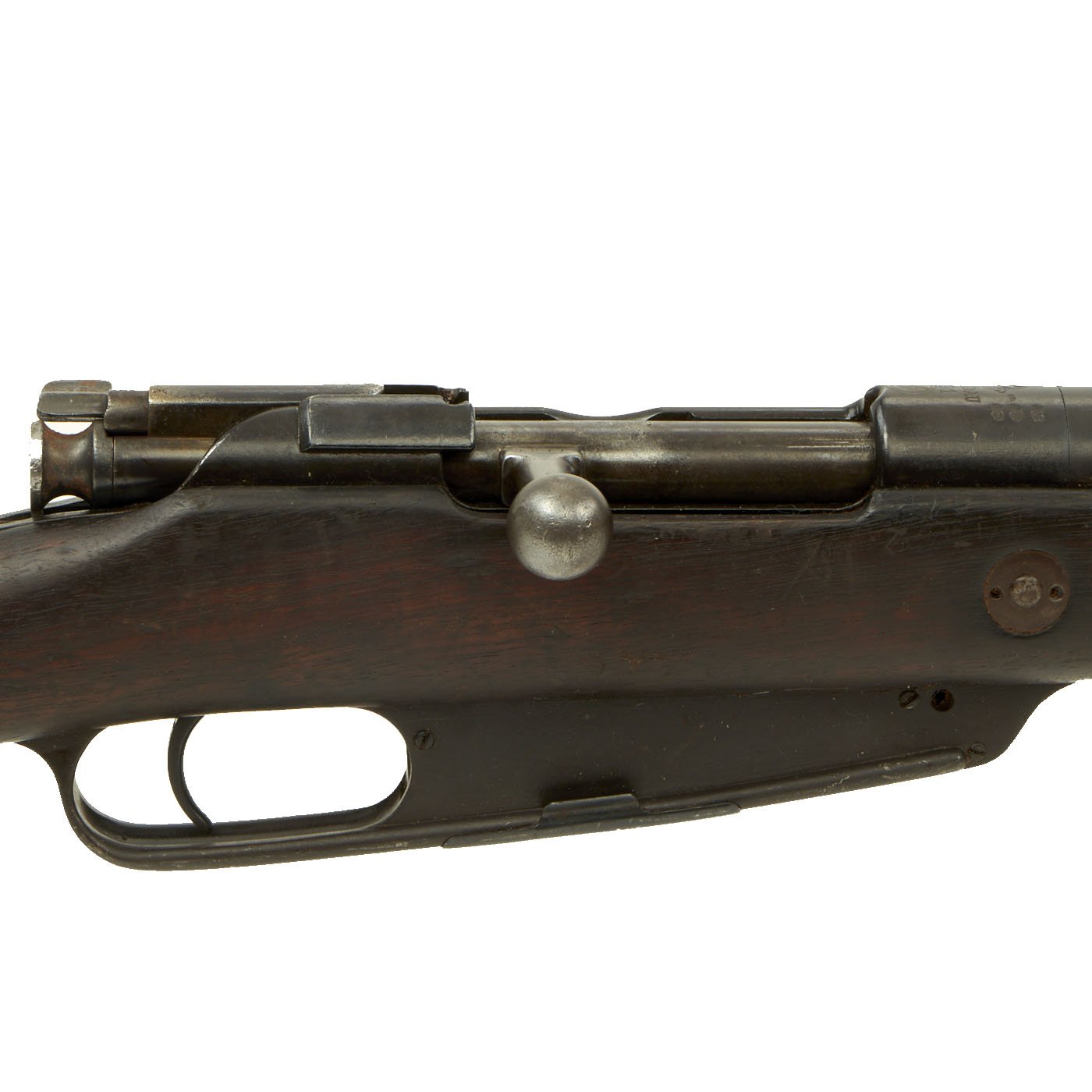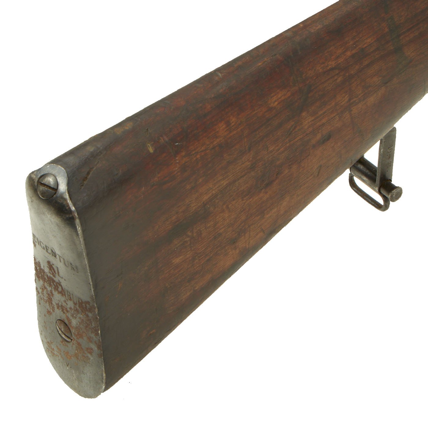 Original Item: Only one Available. This is a good example of the iconic German Gewehr 1888 "Commission Rifle", also known as the Gewehr 88, or GEW 88. It was manufactured during 1890 at the Spandau Imperial Arsenal, located in Berlin, and then and then saw long service, as indicated by the large number of different markings on the gun. It still retains original German regimental markings on the lower band, which were crossed out: 5. R. J. 1. 42.. This is for a "Reserve" regiment, as indicated by the stylized "R" marking. It is very likely that this is not the original regimental marking that this gun was issued with, as it definitely been arsenal refurbished.