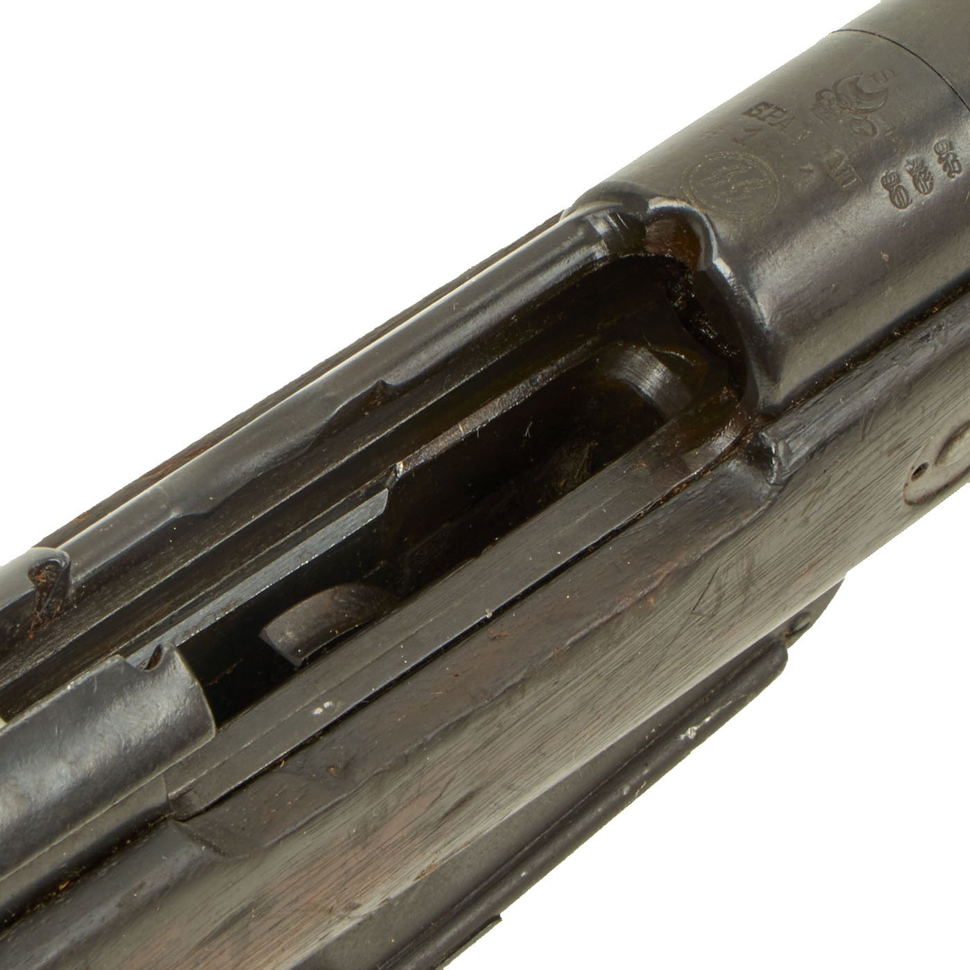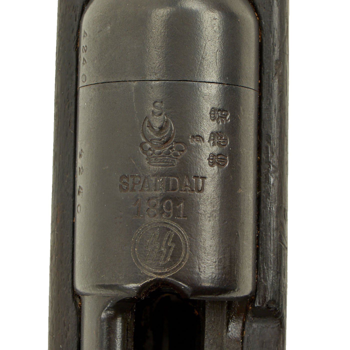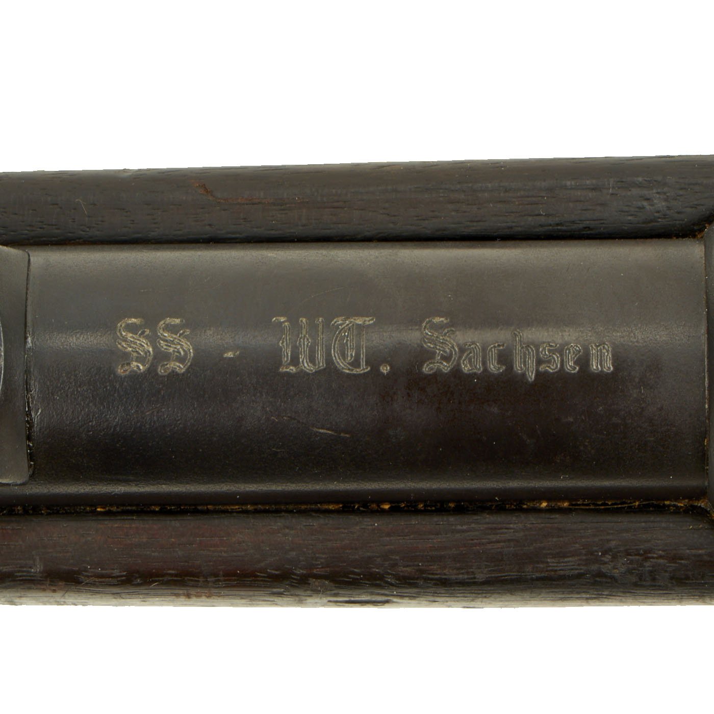 Below the date however, is a much more interesting marking, the ᛋᛋ doppelte Siegrune (Double Sig/Victory Rune) marking inside double circles, the issue marking for the German Schutzstaffel (SS), the ruthless paramilitary organization of the NSDAP. Additionally, the barrel jacket has been marked in German Blackletter typeface with SS - WT. Sachsen between the sight and receiver. This would indicate issue to some SS unit in Saxony, Germany. We are not sure what type of unit this would be. We had considered it might be "SS - VT" but that seems unlikely. The markings definitely all were added at the same time, and after WWI service.
