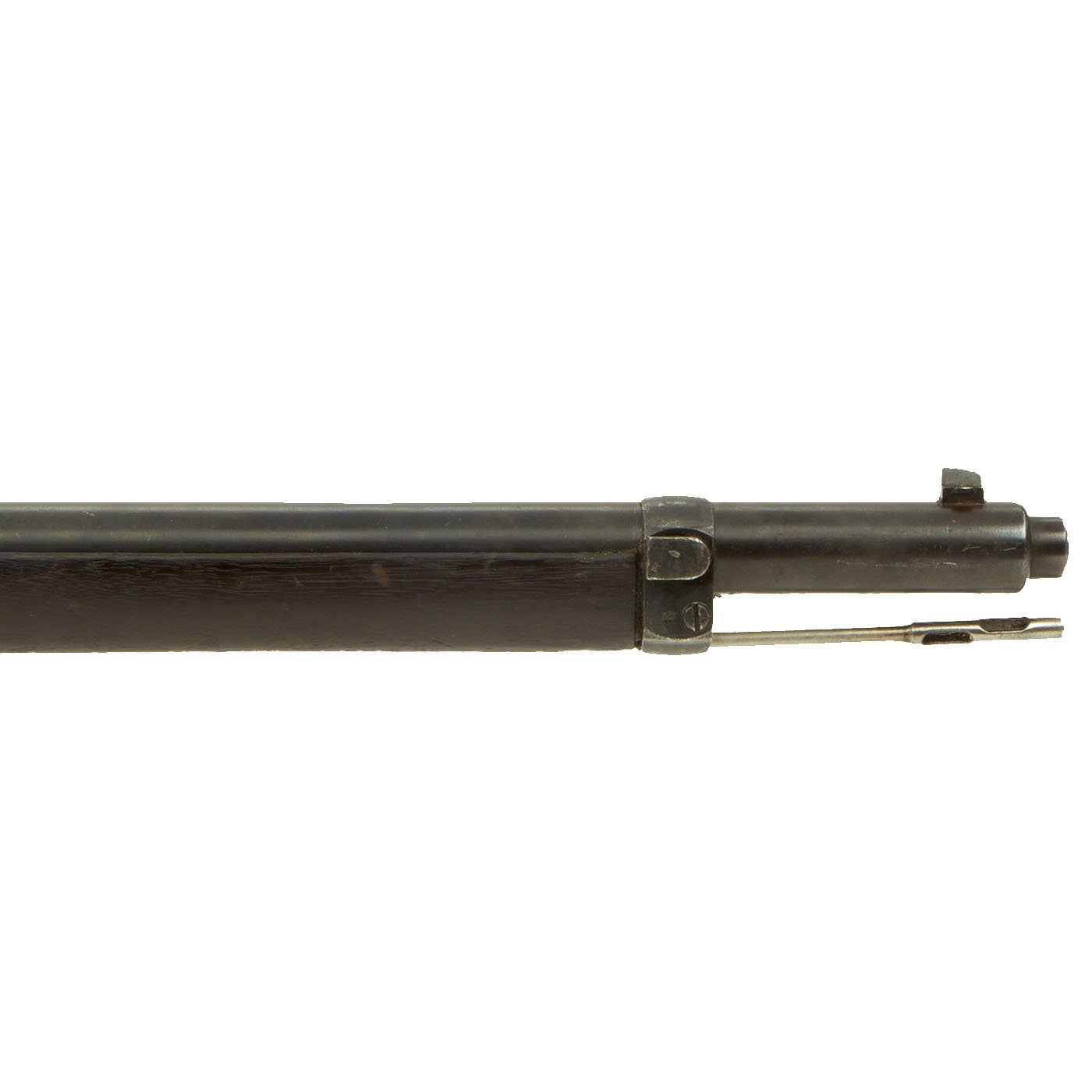 Rifle is in very good used condition, with a solid stock and metalwork. It still retains the rare "double slot" cleaning rod, which is in good shape. The metalwork overall has a plum patina with light peppering, and some areas of original bluing still present. The stock does not have any repairs or major damage, though it does have a good amount of dents, scratches, and dings from long service.