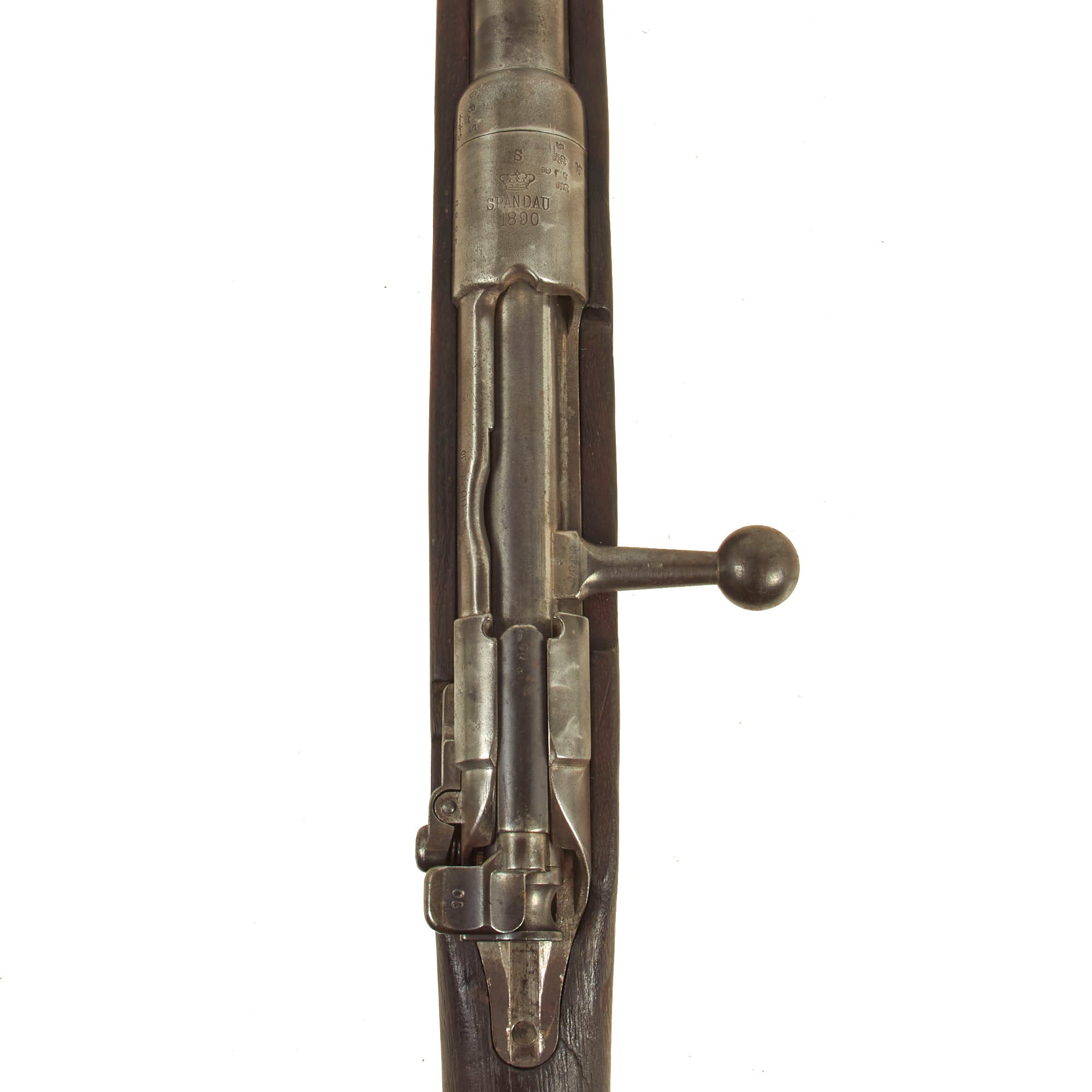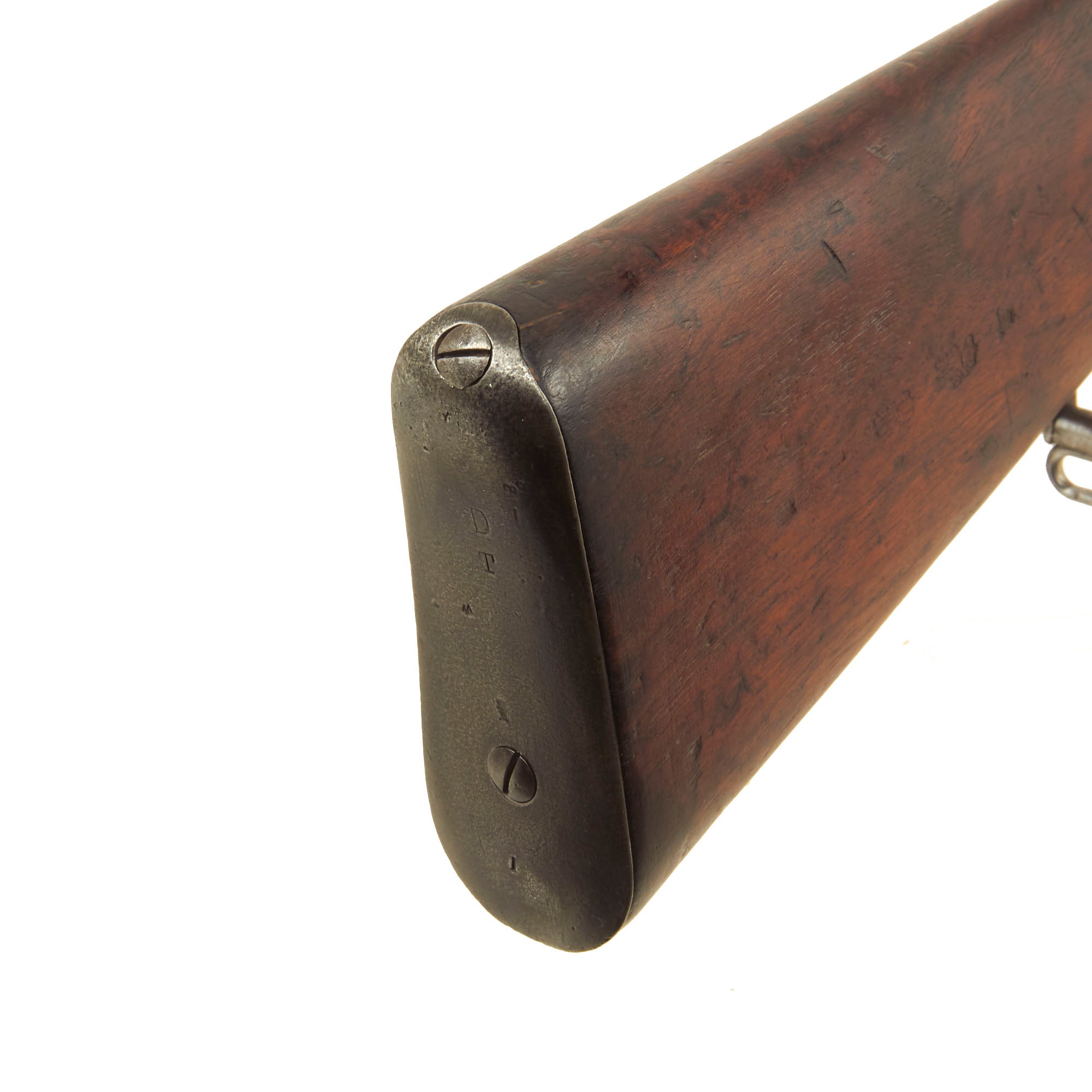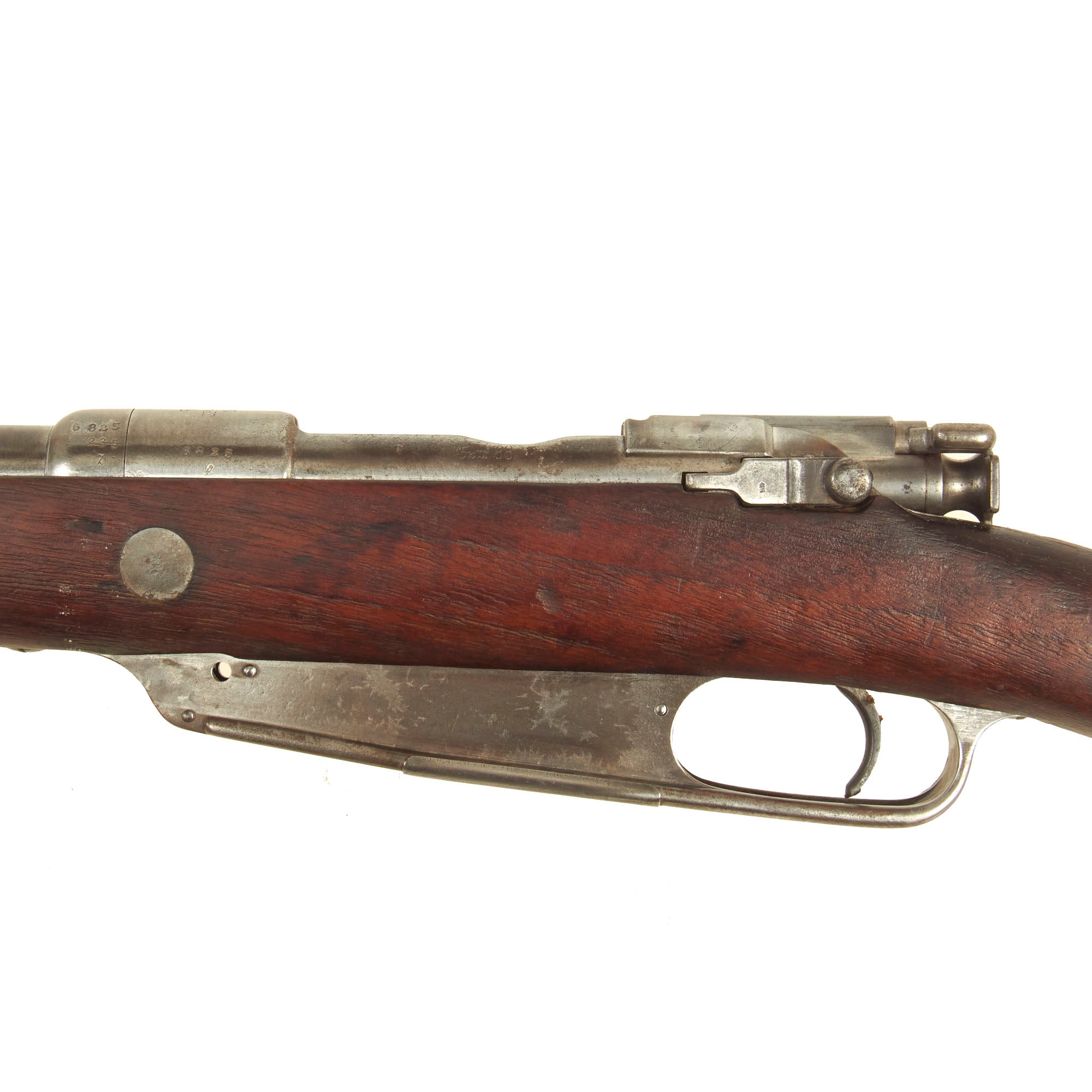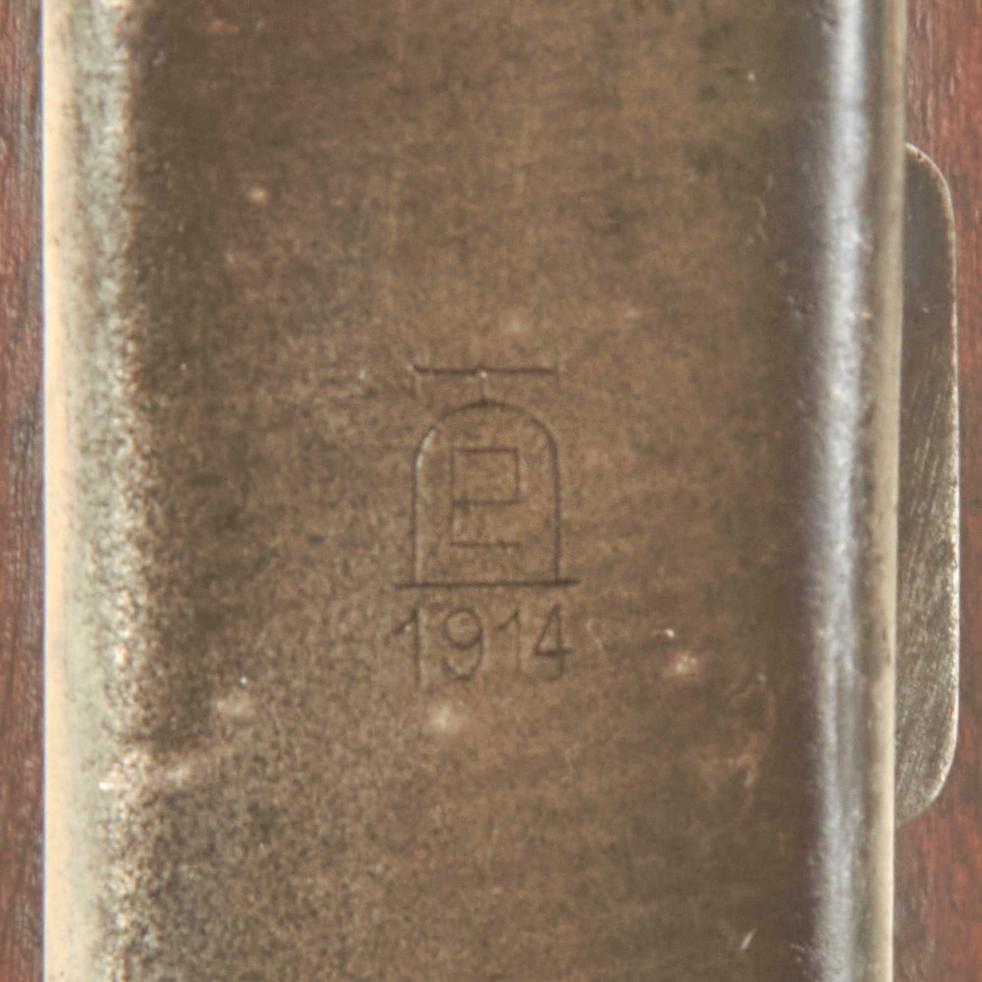 These rifles were originally chambered for 7.92mm Patrone 88 ammunition and had a fixed magazine. As with virtually all Gewehr 88 rifles in service, this example was converted to take the 7.92×57mm Mauser S Patrone, and has an S stamped above the chamber, indicating the conversion. The Spitzer-shaped S Cartridge was ballistically superior to the M/88, however the chamber required modification to accept the thicker walled shell casing. This particular rifle has notched plates welded to the rear of the receiver on either side to accept the 1905 pattern stripper clips, making this a Gewehr 88/05 S. It also has the tell tale "notch" cut into the rear of the receiver, as the loaded clip would run into this area. The magazine floor plate is dated 1914, most likely the year of the last conversion.