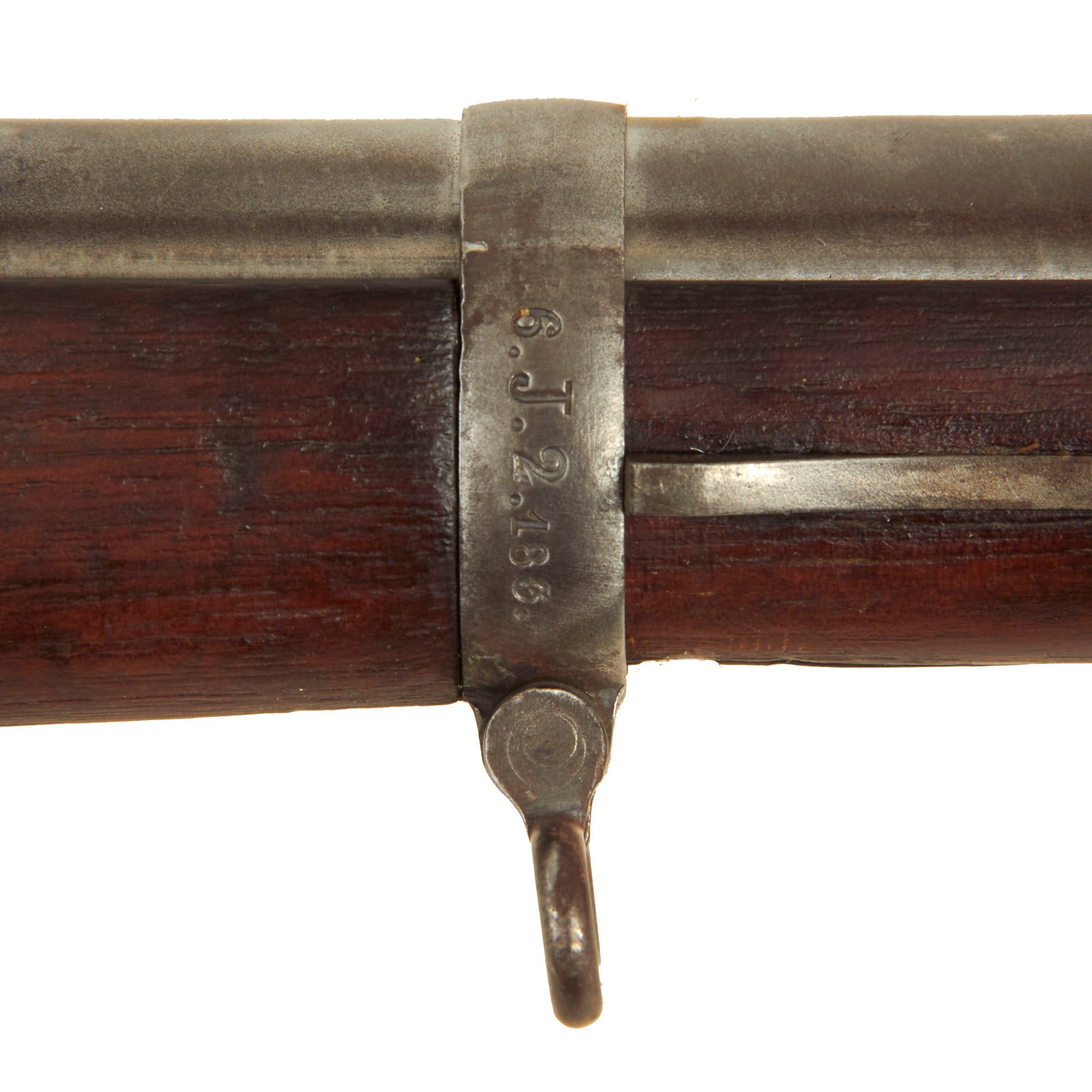 The rifle bears two German regimental designations on it, 6. J. 2. 185. on the lower barrel band, and 1. R. 8. 103 on the upper barrel band. The first of these is a front line unit, possibly a Jäger light infantry unit, while the second looks to be a reserve unit. Definitely some nice research potential here!