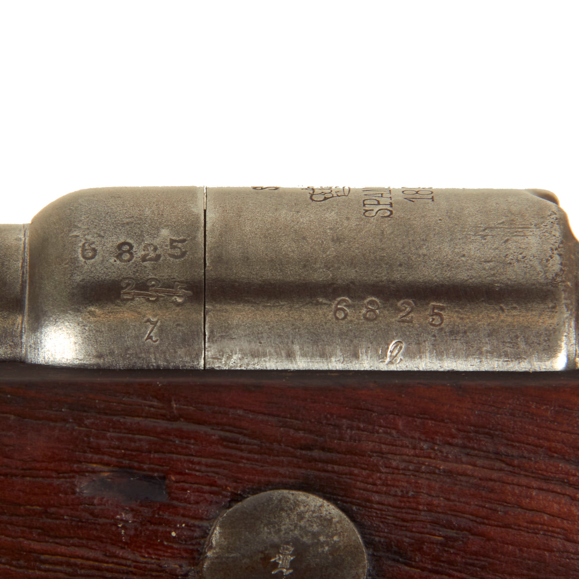The right side of the receiver is marked Gew. 88 in German blackface type and also has serial number 6825 l on the receiver, which matches the number 6825 on the magazine housing. The barrel jacket had the original serial number crossed out and was remarked 6825 to match the receiver, while the bolt was left non matching. Most of the other parts are all unmatching, typical for an arsenal refurbished rifle. Over the chamber it is clearly marked CROWN / SPANDAU / 1890, for manufacture by the Imperial Arsenal in Spandau. However in addition this rifle was then shipped to Germany's World War One Ally TURKEY, who completely remarked the rear sight graduations with Eastern Arabic style numbers.