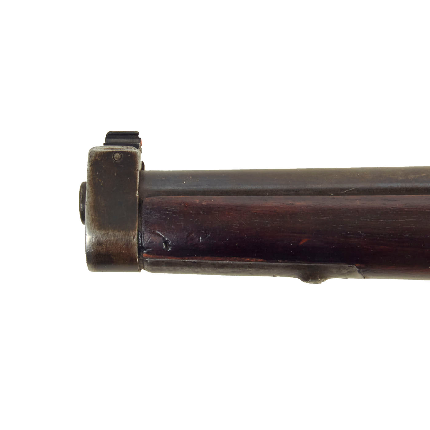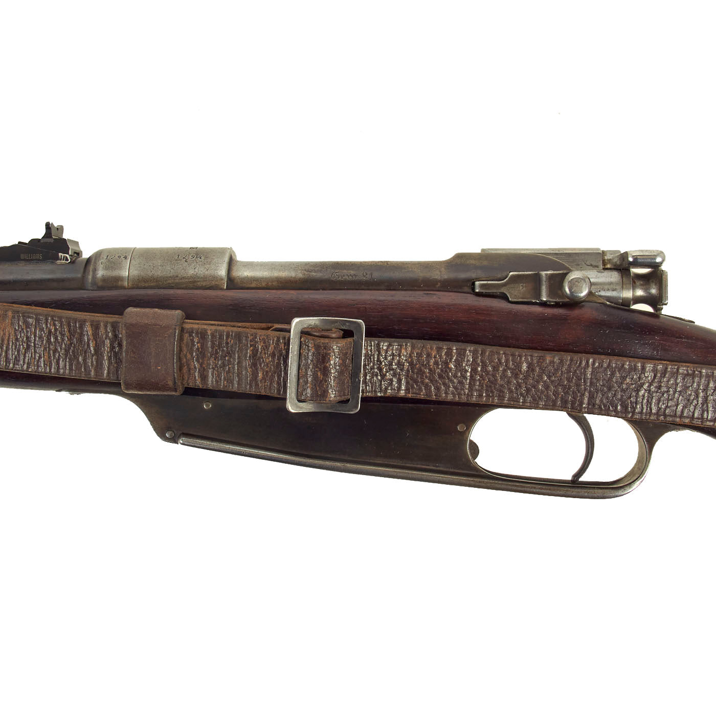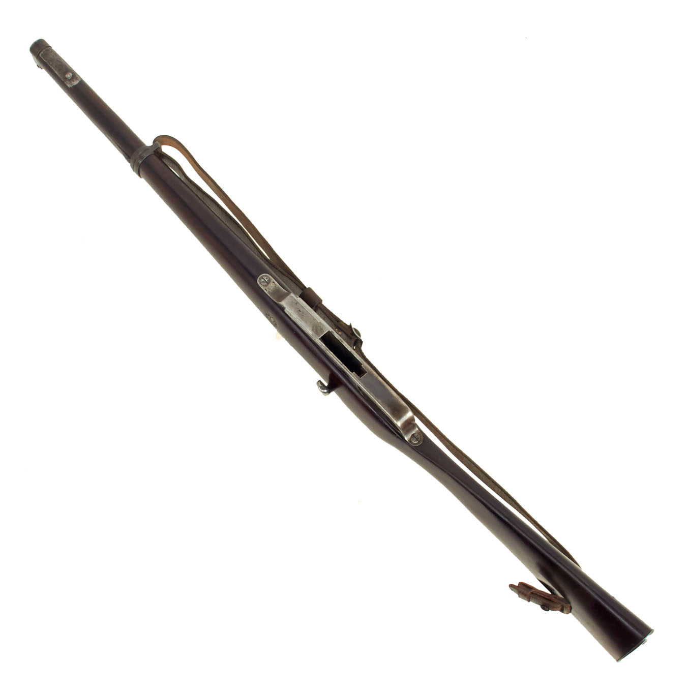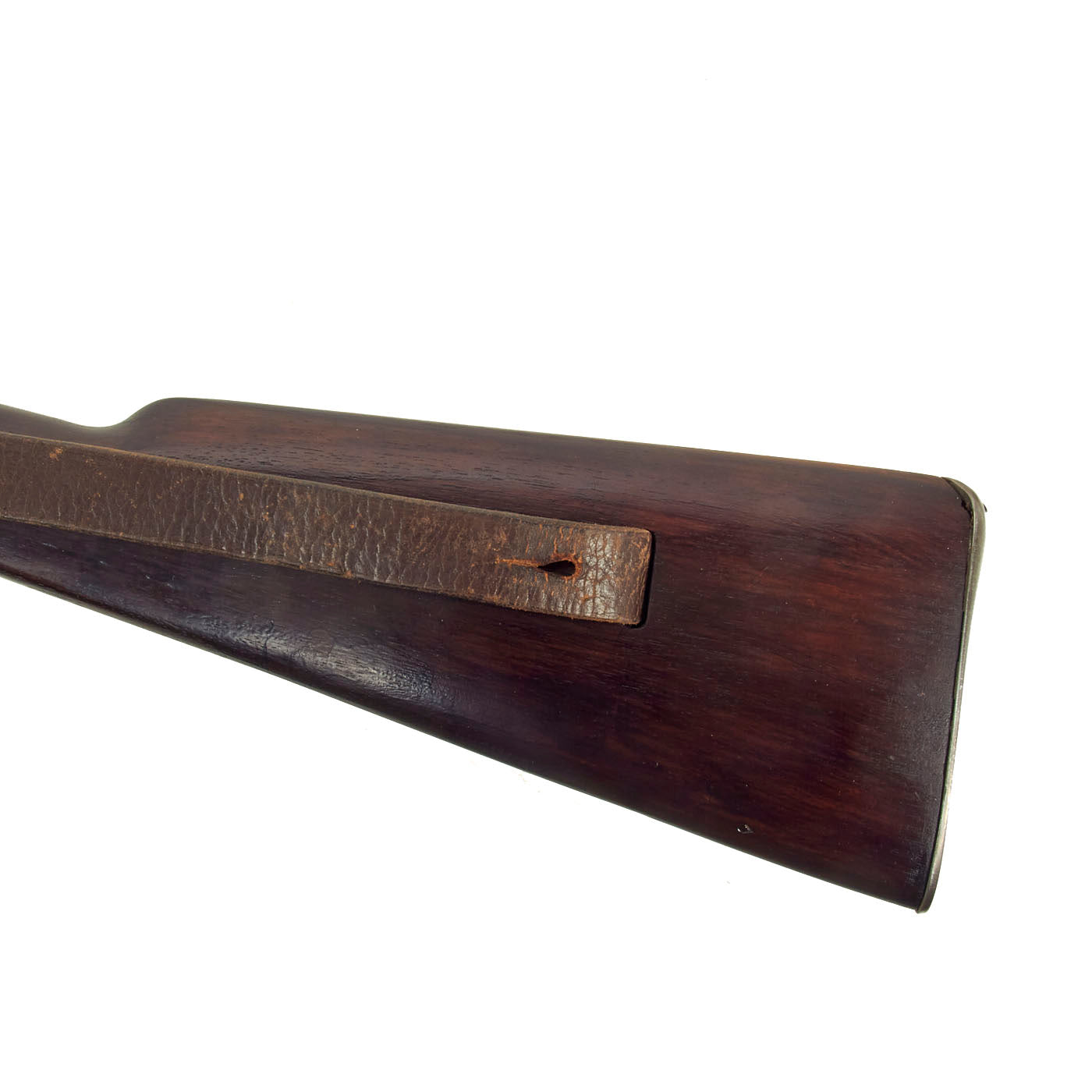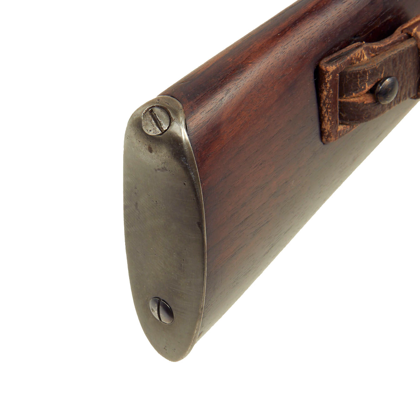 The stock is in good service used condition, having been arsenal reconditioned and reduced in size for use by specialized troops during WWI. It may have been refinished after that, and now has a dark brown color, with a lovely polished glow. It has been fitted with a WWI Style sling, though we suspect that it is a mid 20th century reproduction.