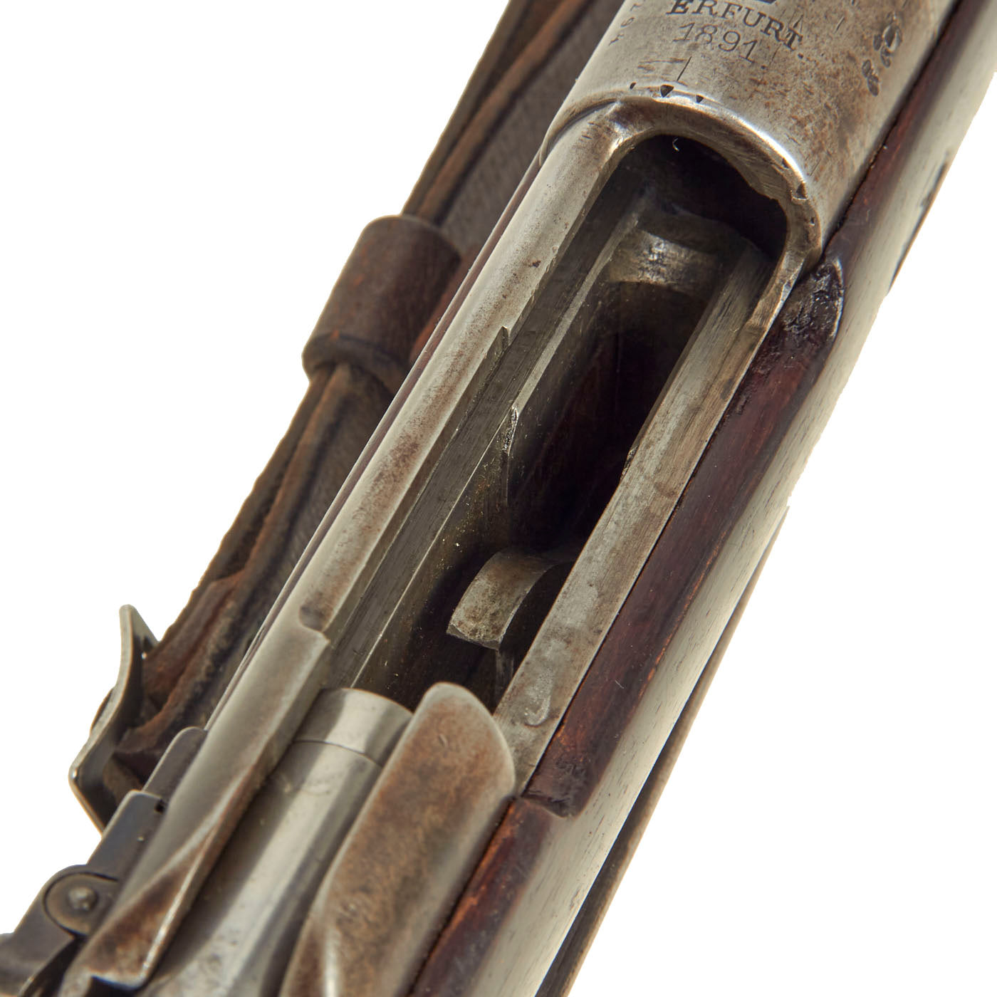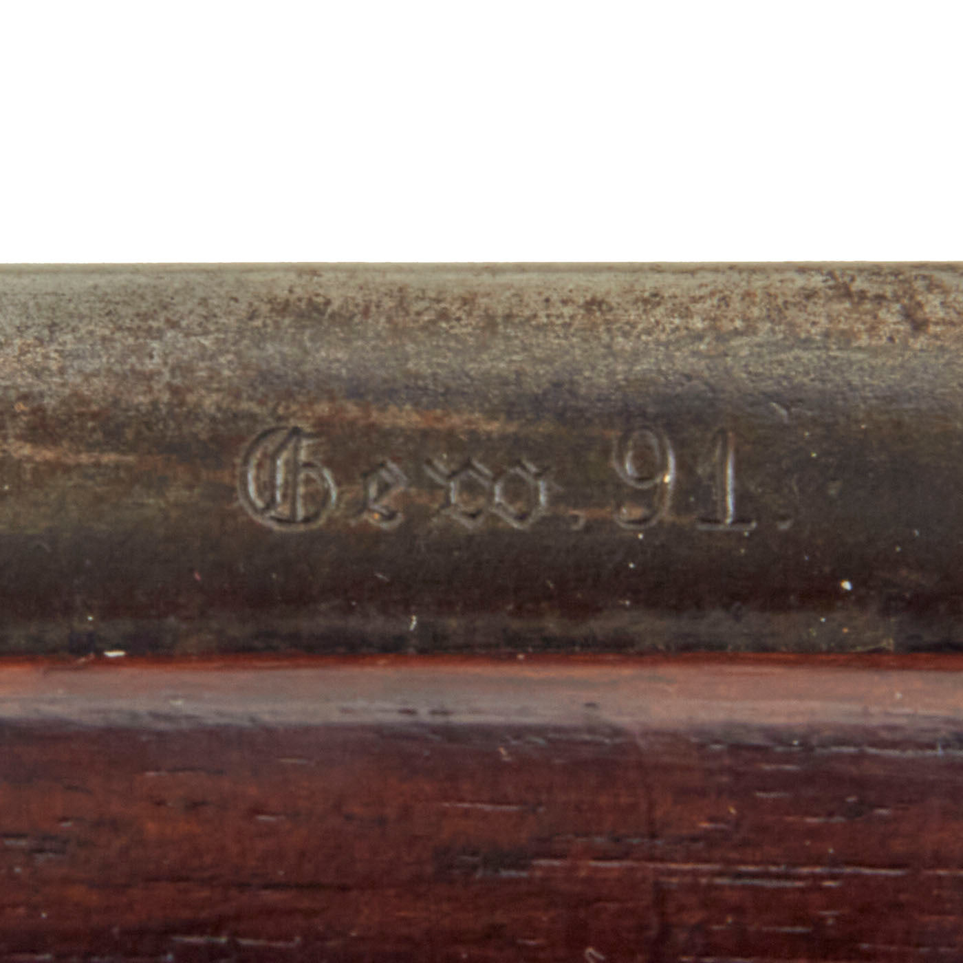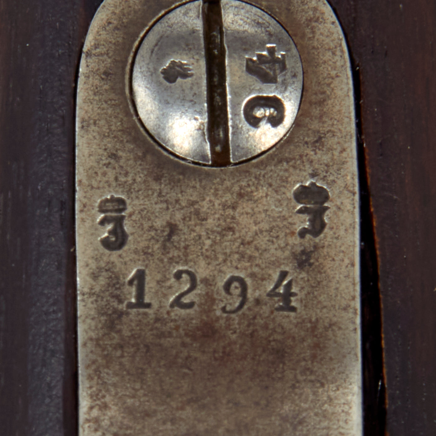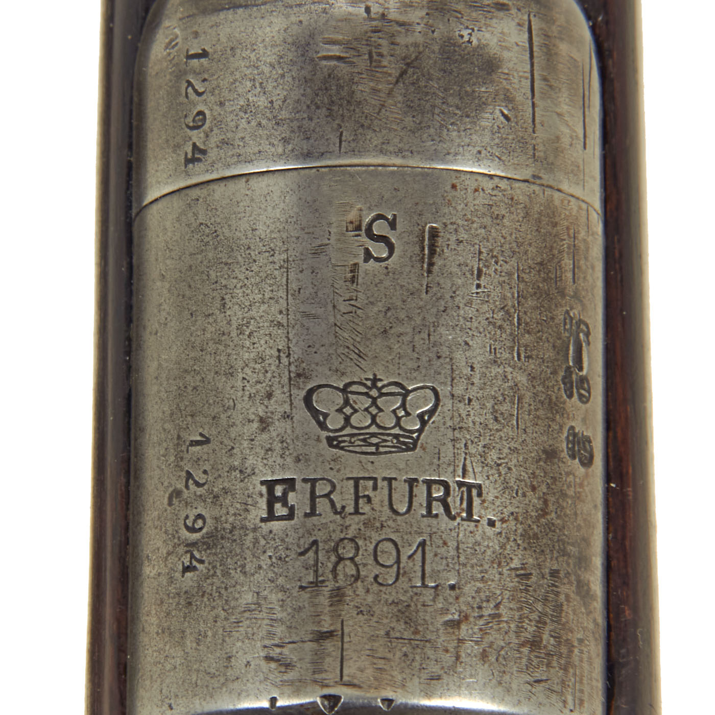 It is marked over the chamber with (CROWN) / ERFURT. / 1891., for 1891 manufacture at the Imperial Erfurt Arsenal, located in Thuringia. The right side of the receiver is marked with Gew. 91. in German blackface type, and there are additional proof marks on various components of the carbine. The barrel, receiver, and magazine housing of the carbine are marked with serial number 1294, with shortened number 94 present on almost all of the screws and the nose cap. The bolt is non-matching, marked with serial number 131, having been swapped out at arsenal.